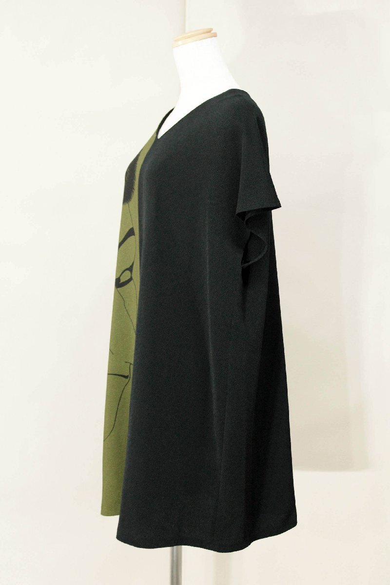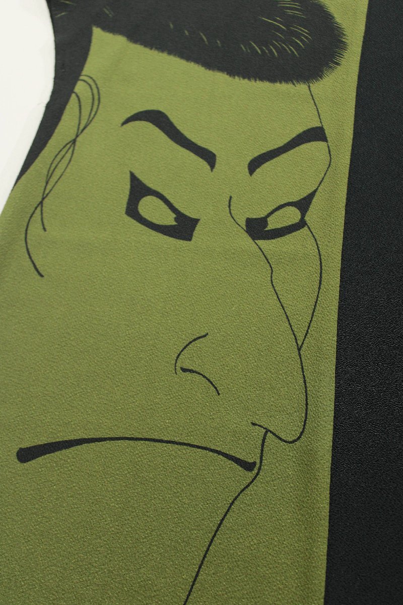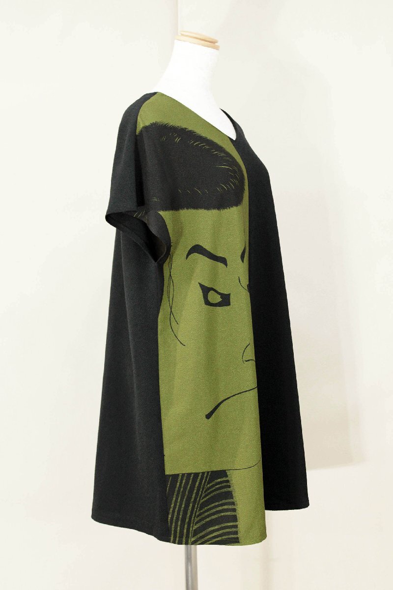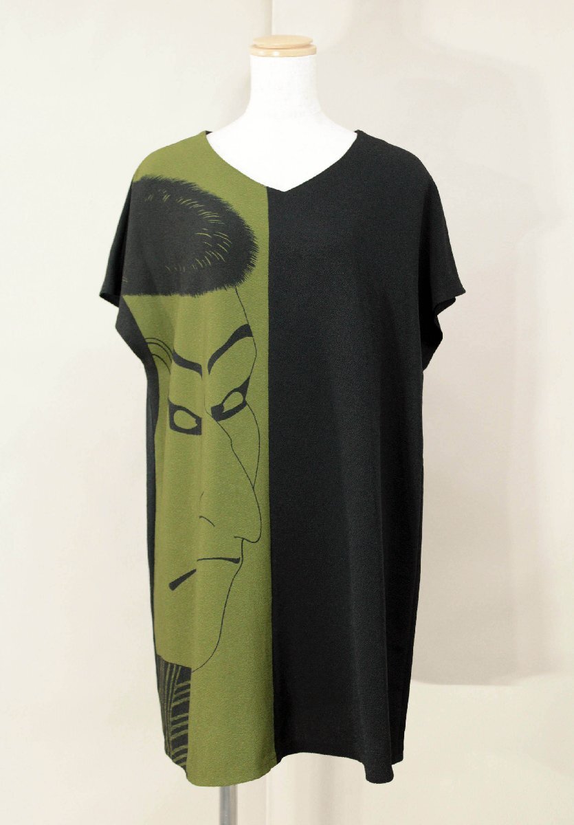 ☆美品☆ヒトシタムラ詩仙堂/ちりめん織り歌舞伎役者絵柄切替半袖チュニック:黒系yx539