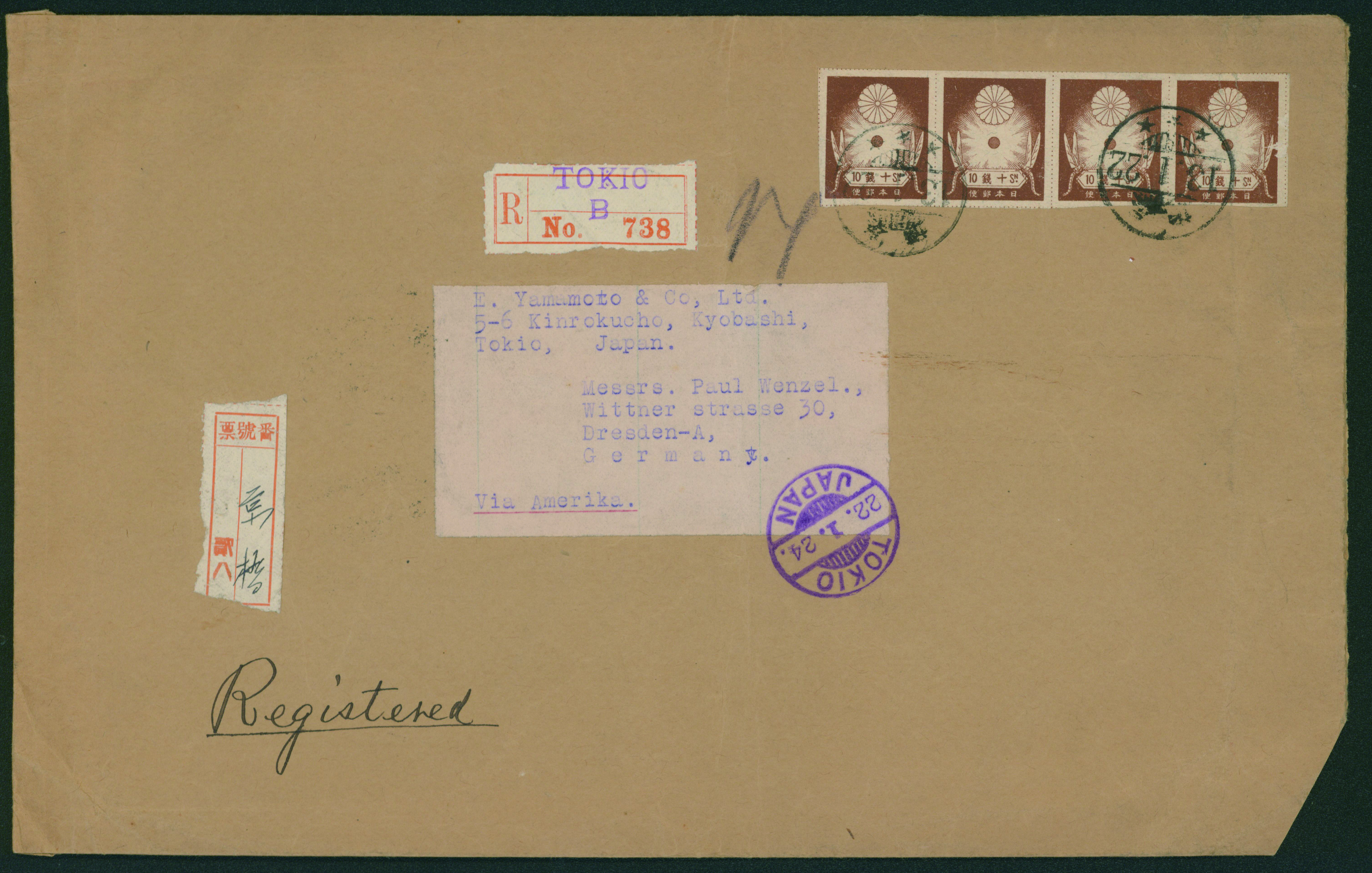商品説明: 震災10銭 4枚ストリップ ヘゲ 櫛型印(三ツ星) 大正13 1 22 京橋→TOKIO→ドイツ 震災による暫定印 書留票手書き京橋 外信船便印刷物書留重量便 40=4*5+20 カバー中折れJPS 207(4S)