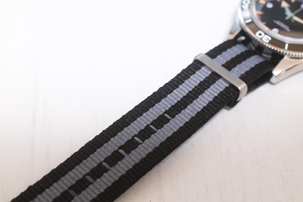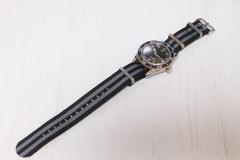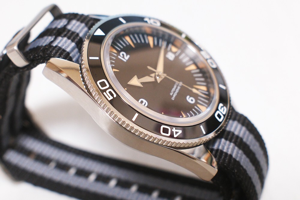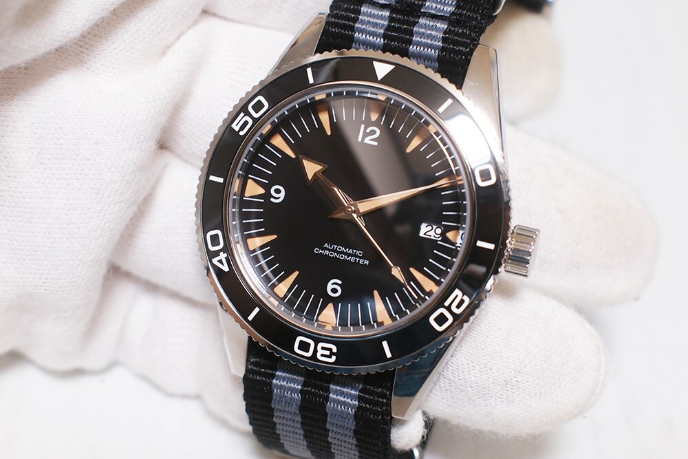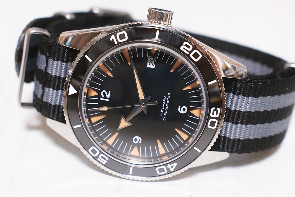 007 スペクターでジェームズボンドが着用していたモデルのシーマスターからオマージュしたと思われるデザインです。文字盤、リューズ、バックル等全てロゴなしの潔いデザイン。
