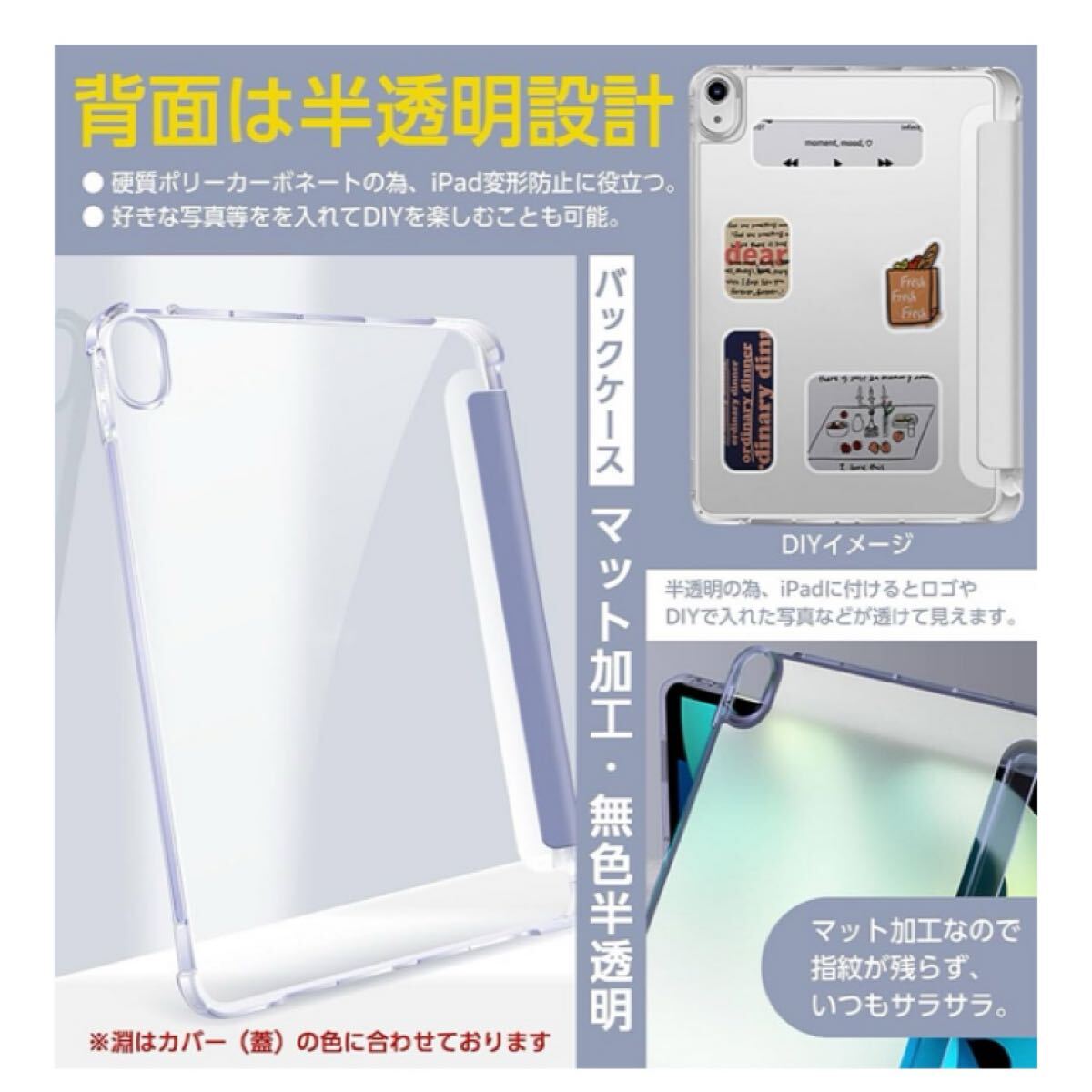■フロントカバーとバックケースの色合いを合わせたおしゃれなデザイン!また半透明なので好きな写真などを入れてDIYを楽しむことができます。