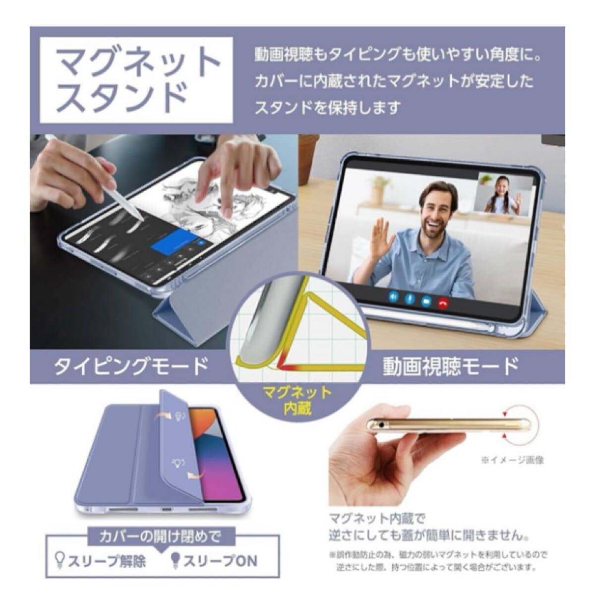■フロントカバーを3つ折って三角スタンドにすると、フロントカバーに均等に内蔵されたマグネットが三角形状を安定させる為、動画鑑賞に適した角度やタイピングに適した角度に(2WAYスタンド機能付き)してiPadを楽しむことができます。
