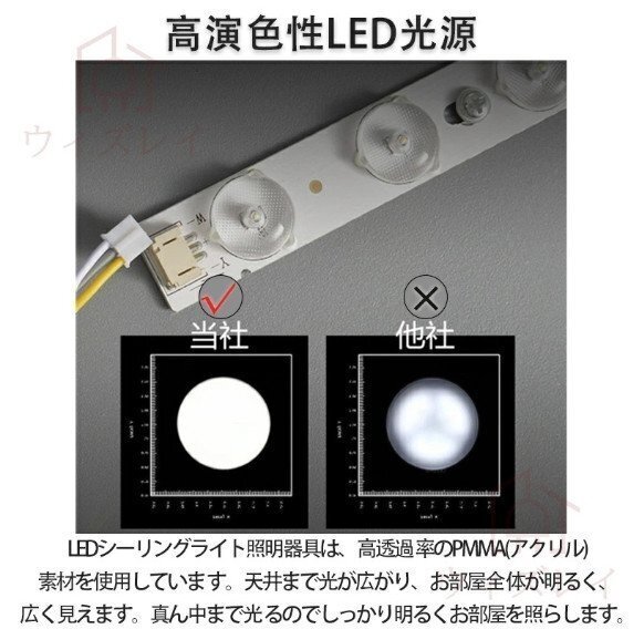 【演色性が高い】 | 演色性が高いほどのシーリングライト、自然光に近いとされているので、文字がはっきりと見やすく、花の色や料理の色や人の肌色美しく自然に見えます。廊下、和室、寝室、洗面所、居間、書斎、トイレ、天井照明、キッチン照明が最適です。 |