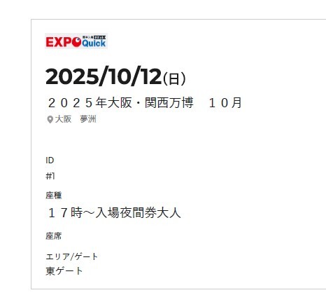 ★大阪万博チケット EXPOクイック★ 10月12日17時~ 夜間ペア 東ゲート EXPO quick