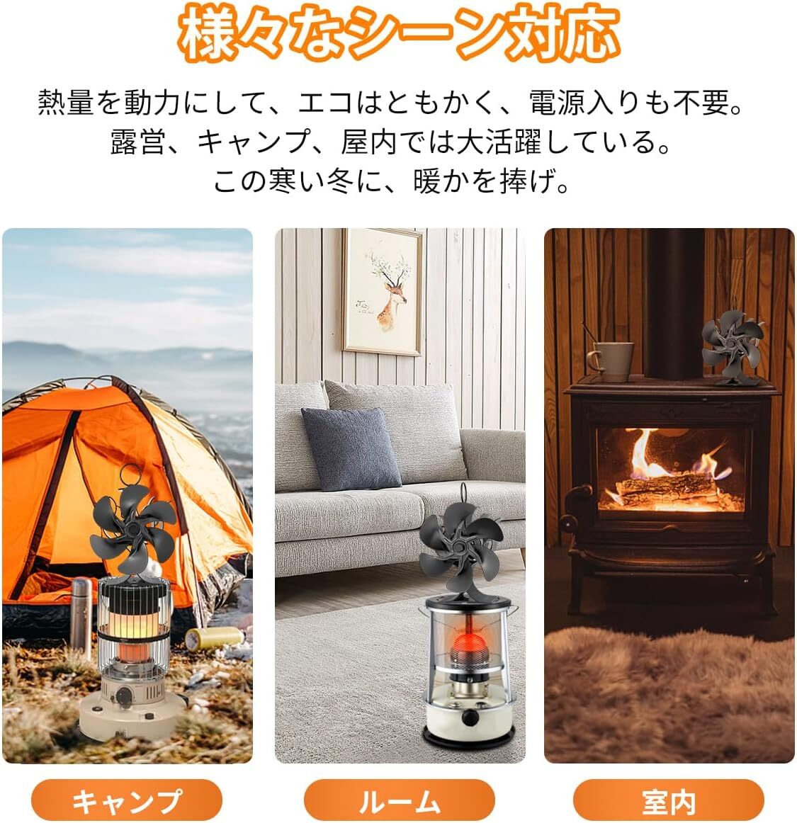 【 省エネ・耐久性 】 ストーブファンは、電池や電気を必要とせず、回転することで、天井付近に滞留しがちな暖かい空気を床面付近に送ります。このようにして空気の循環が生まれ、暖気が部屋全体にまわり、暖房効率が最大38%向上します。10畳程度のキャンプ用テントでもあっという間に暖かくなり、足元まで温まります。最大14%の燃料コスト削減が可能であり、薪の消費を抑えられるため、防寒対策として最適です。 【 6つブレード 】 ストーブファンの設計が全体的な最適化を達成するために、羽根の形状、数量、厚さと土台の高さを繰り返してテストします。石油ストーブファンの6つブレードは大面積の曲げ加工で、折り曲げ角度は約25度で風量が強い!最大回転速度は1440RPMです!ブレードの中心を効率的に活用して風を集めます。空気抵抗を減らして、風速の変動幅も小さく、バランスの取れた“穏やかな風“を送らせます。 【内蔵過熱保護&温度計付き】使用寿命を長くするため、ファンに過熱保護装置を内蔵しており、温度が350℃を超える場合、ファンがゆっくり上に上がり、部品を保護します。付属のマグネット式の温度計で、薪ストーブ、ガスストーブの他、グリルやBBQなども幅広くお使い頂けます。 【静音運転-冬キャンプに最適】エコファンの騒音レベルは25dBという低レベル値です。最高速度に達してもほぼ無音で回転します。 静かで快適な環境で、暖かい空気を感じることができます。天面が平で熱くなるストーブなら、薪ストーブ、ベレットストーブ、ガスストーブ、石油ストーブなどどんなストーブでもお使いいただけます。また、電源いらずで、場所を問わず使えますので、外で過ごす時はこのストーブファンが防寒対策としては最適です。 【安全設計】フレームは350℃までの高温に耐えるアルマイト処理が施されており、高温下での長時間運転でも変形や変色はありません。L26 |
