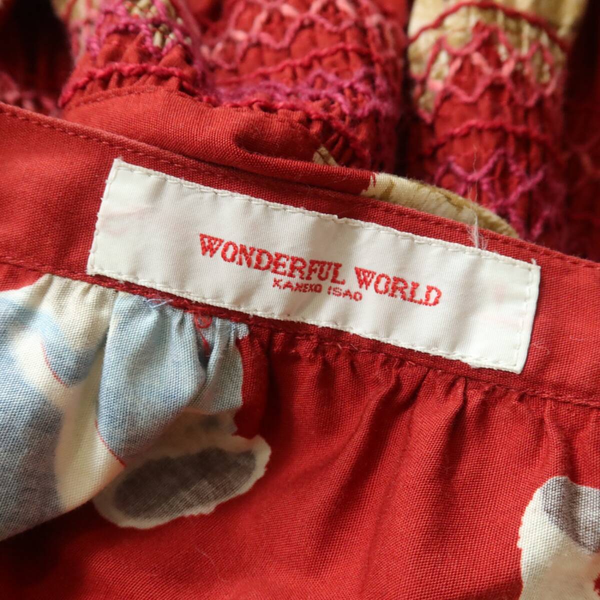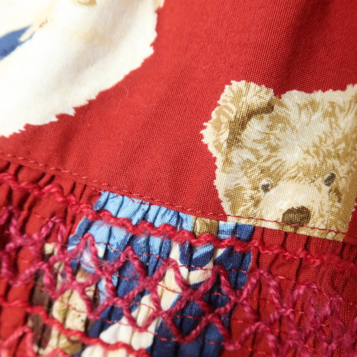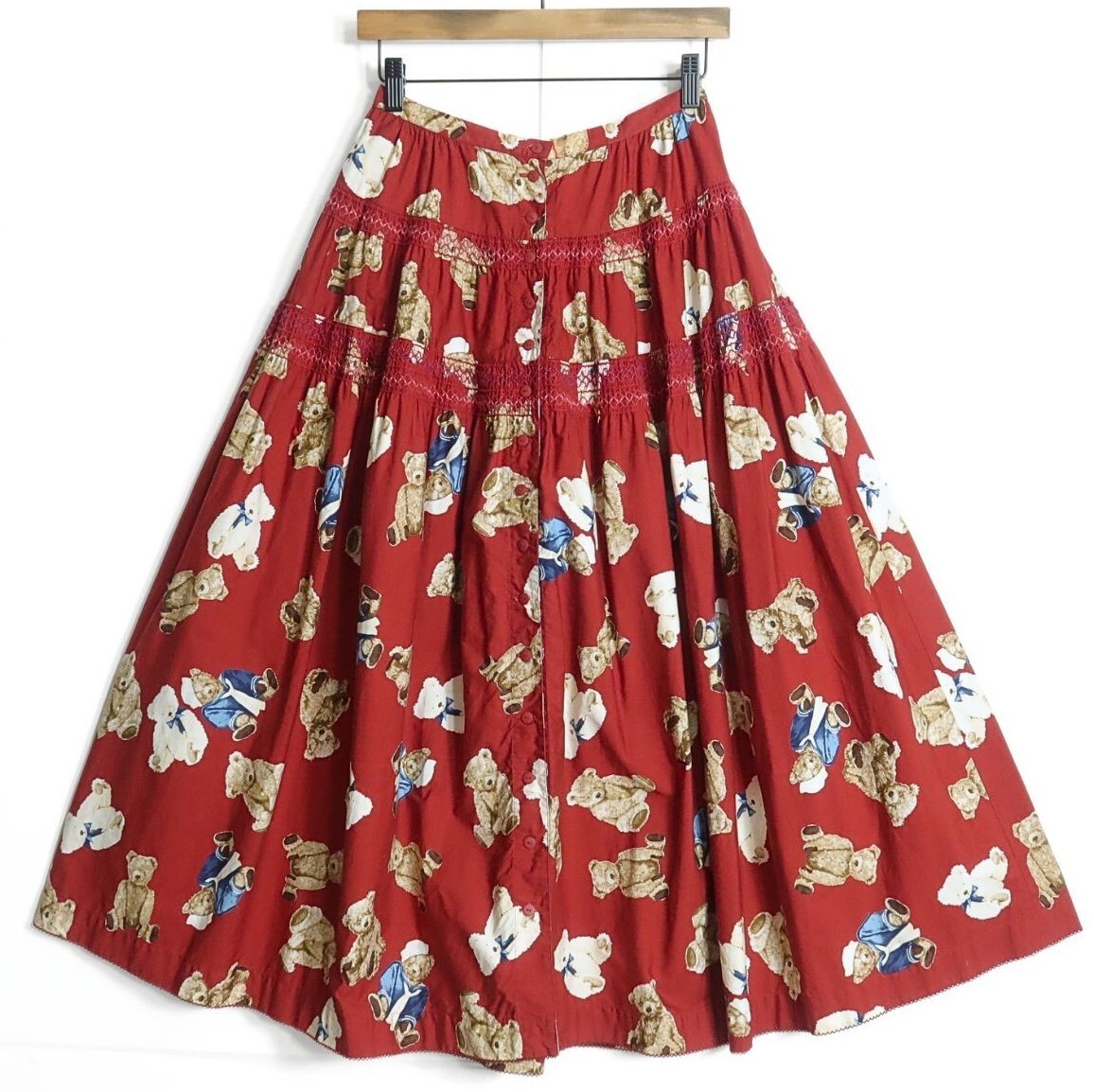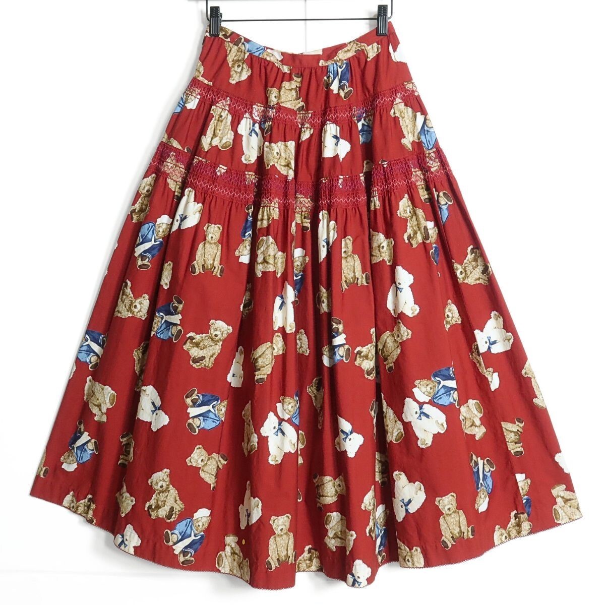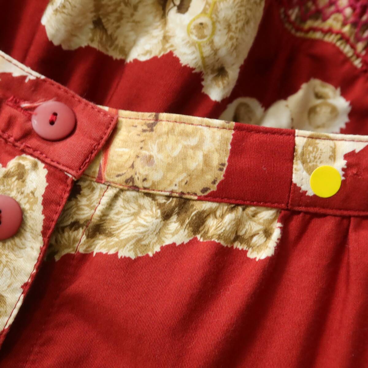| 商品説明 | 【実寸約】ウエスト66丈87(cm) 【サイズ表記】 なし。実寸をご参照くださいませ。 【素材】 綿100% 【状態】普通の使用感のあるお品物 バック裾に薄汚れ少々あり ウエストを大きくするお直し跡あり 【デザイン】赤系 フロントオープンのギャザーたっぷりスカートです。 くまプリントに刺しゅうステッチが大人可愛い♪ 薄手/くま柄/刺繍ステッチ付き |