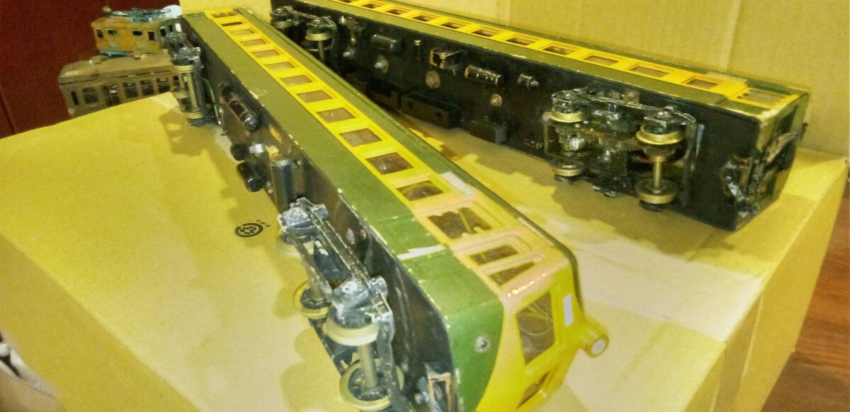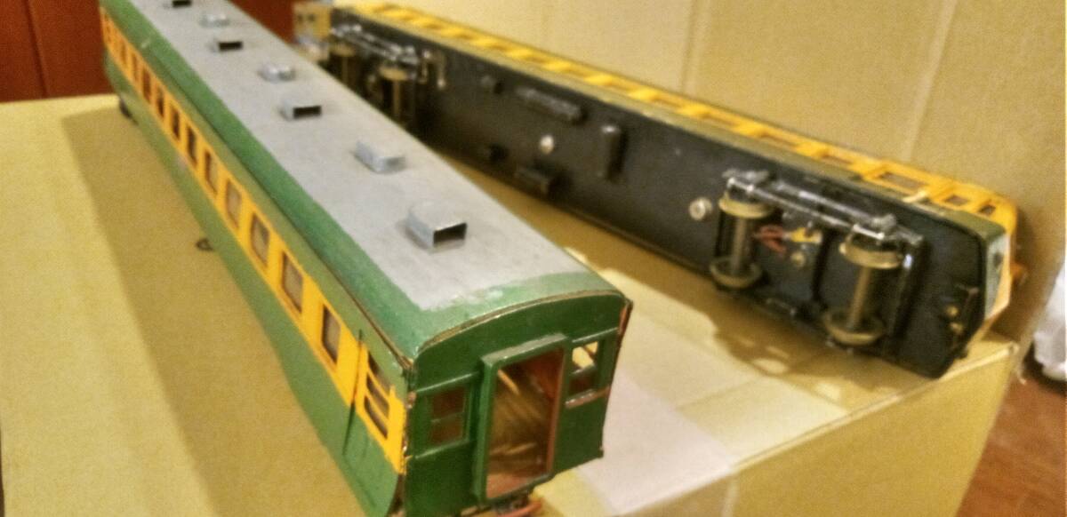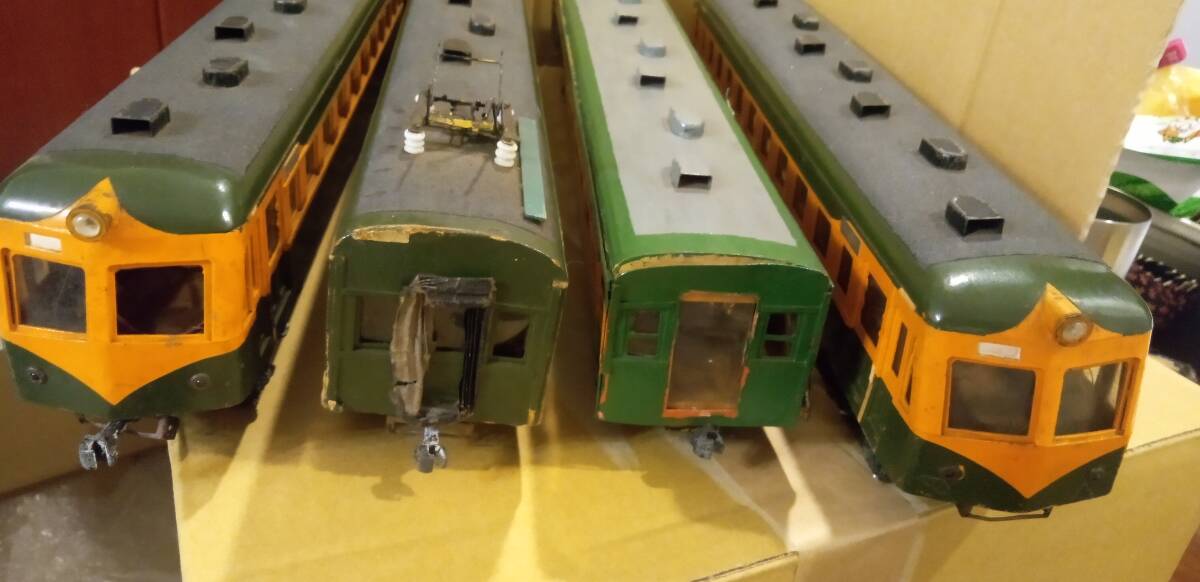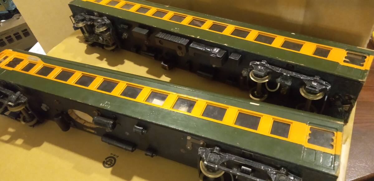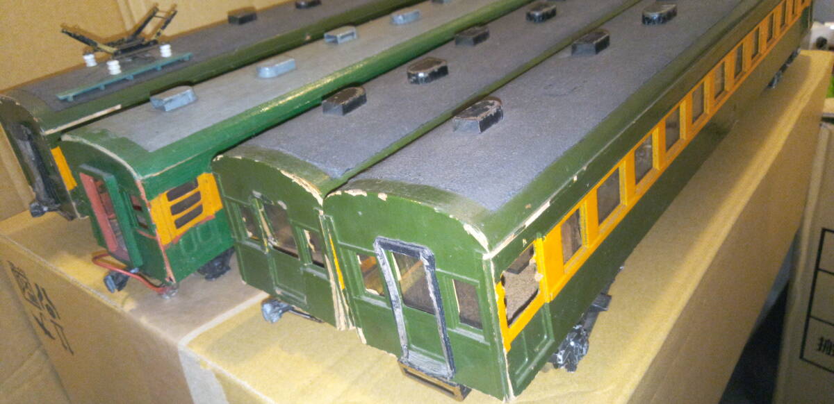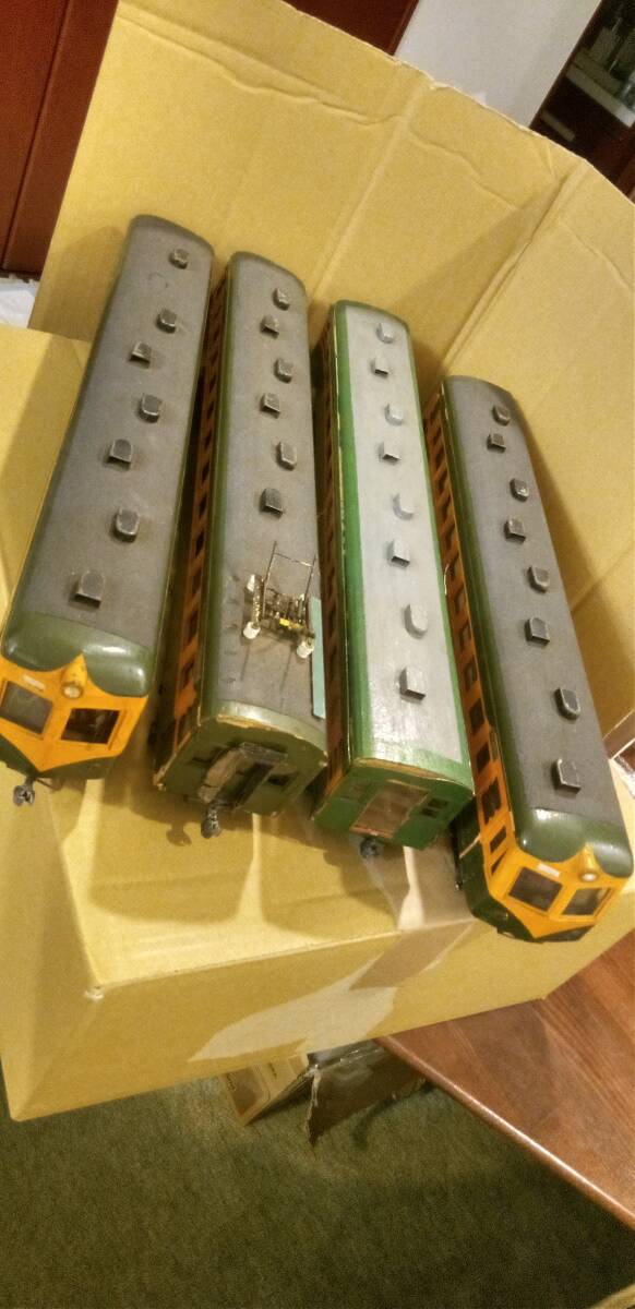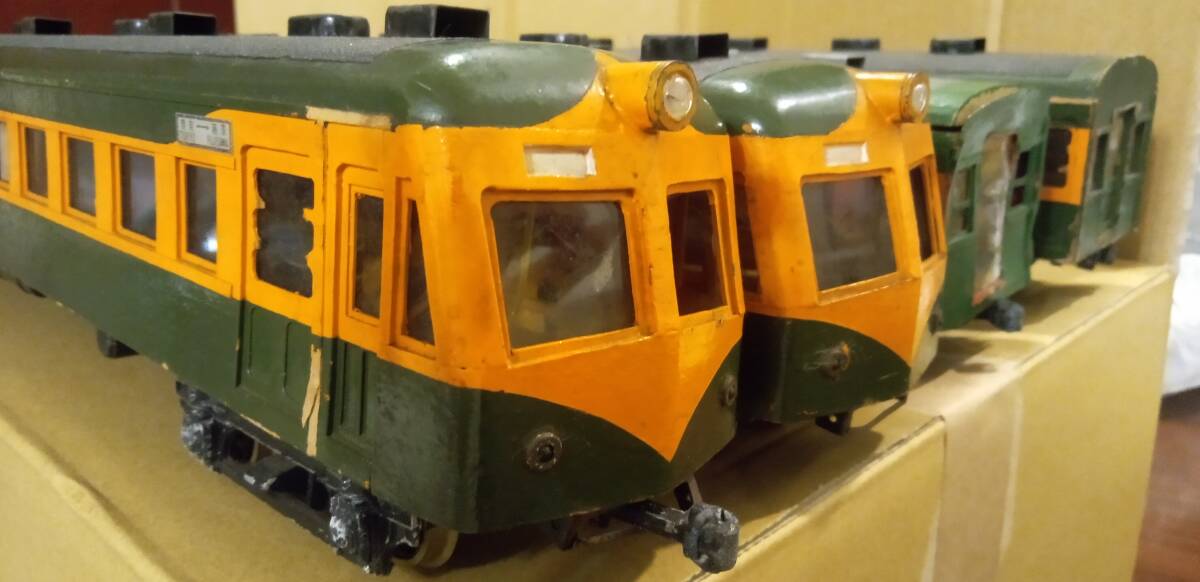 Oゲージ湘南電車クハ2両、モハ、サハの4両編成です。モーターはパンタグラフの車両に搭載されています。かなり古い物で、経年劣化と部品の欠落等があります。状態は写真でご確認下さい。走行試験はしていません、現状にてご了承いただける方にお譲りします。ボディ素材は床とルーフは木製、側面は非金属ペーパー製作かもしれません。ファイバーもあった様に聞いていますが。いずれにしろ、大昔の製品ですので、修復できる方にお願いいたします。