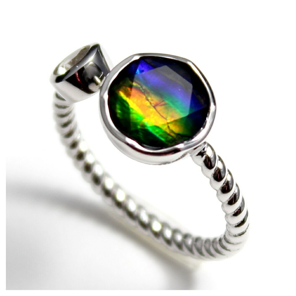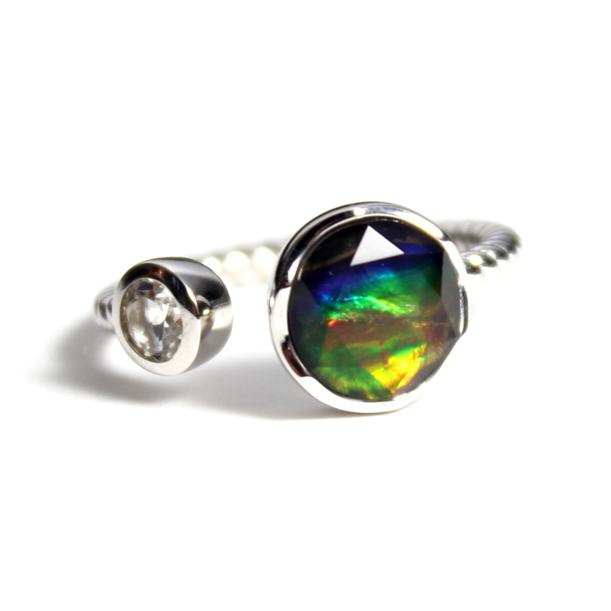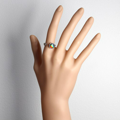 アンモライトとシルバーのリングです。アンモライトを保護する為、六芒星型にカットした天然水晶でカバーしております。