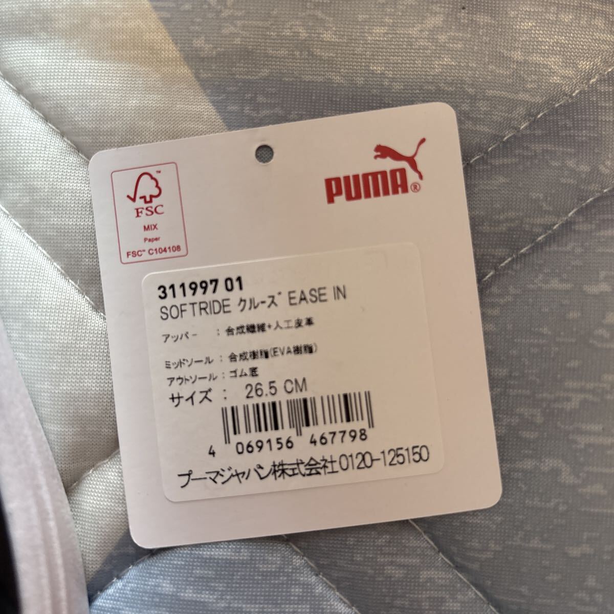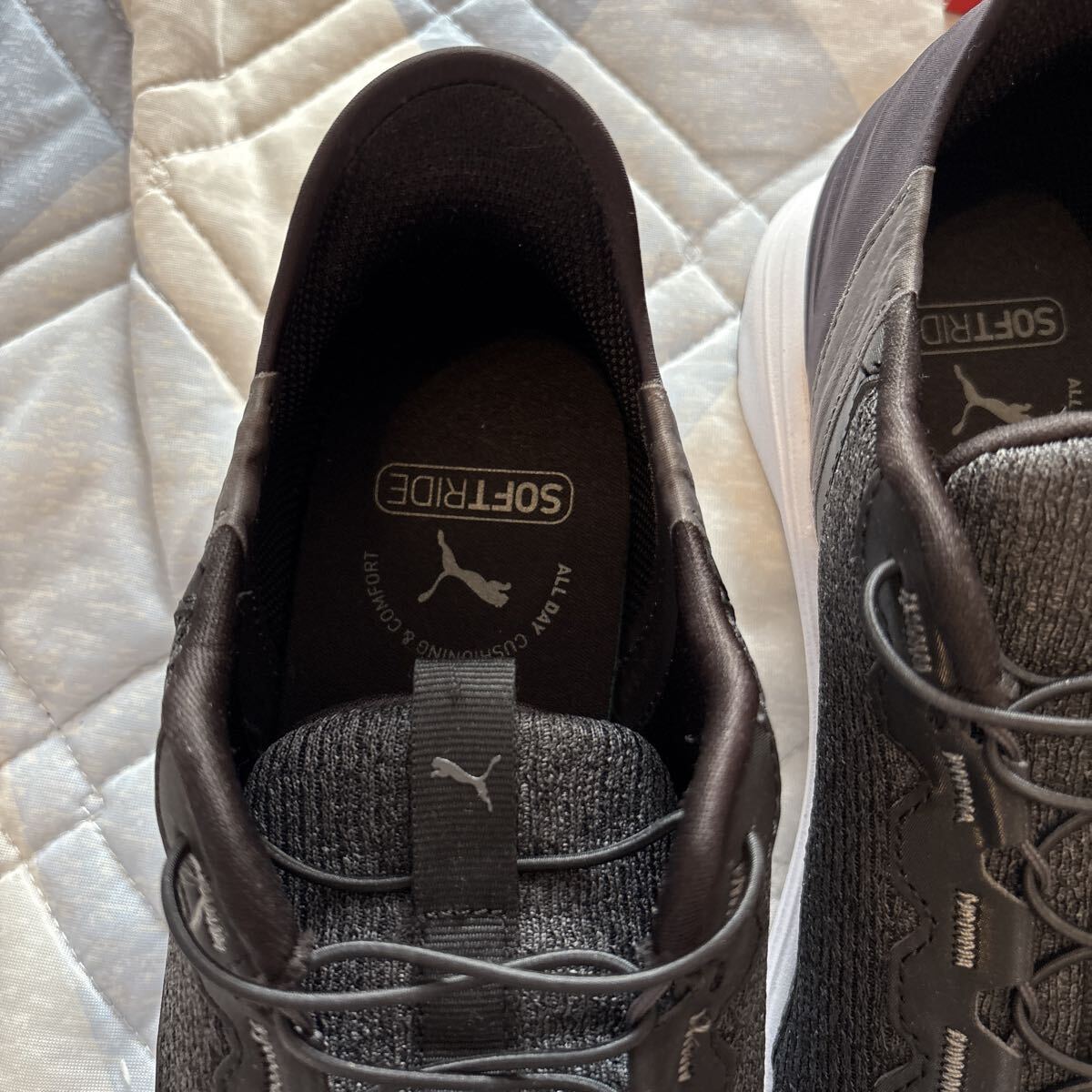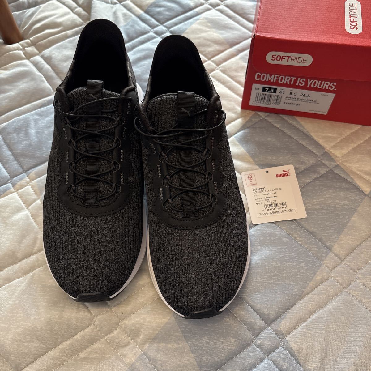 サイズ26.5cm ランニング ウォーキング 軽量 スリッポン クッション性あり。ブラック-ダークグレー。 立ったまま、スッと履ける。[楽ふわっ]な履き心地を提供するソフトライドシリーズから、新モデルのイーズイン(EASEIN)が登場。シュータン一体型のスリッポン構造の履き口、かかと部分が柔らかく、立ったまま手を使わず簡単に足入れが可能です。アッパーにメッシュ素材を採用し、軽量で通気性がよく柔らかい履き心地のシューズ。SOFTRIDEミッドソールは、究極のクッション性を提供し一日中快適な履き心地が持続します。ワイズも通常よりワイドになっており、横幅も気にせず履くことができます。ランニングだけでなく、ウォーキングや外出時にもおすすめの一足です。 素材:合成繊維+人工皮革、合成樹脂(EVA樹脂)、ゴム底 仕様:スリッポンタイプ、サイドにプーマロゴ、シュータンにプーマキャット 重量:約290g(27cm) 原産国:ベトナム カラー:PUMA Black-Flat Dark Gray-Shadow Gray 娘が愛用しているお品を息子にも先月購入し、試着しようと思いましたが、甲高幅広の息子には、足を入れることすらできませんでした。どなたかサイズの合う方に。