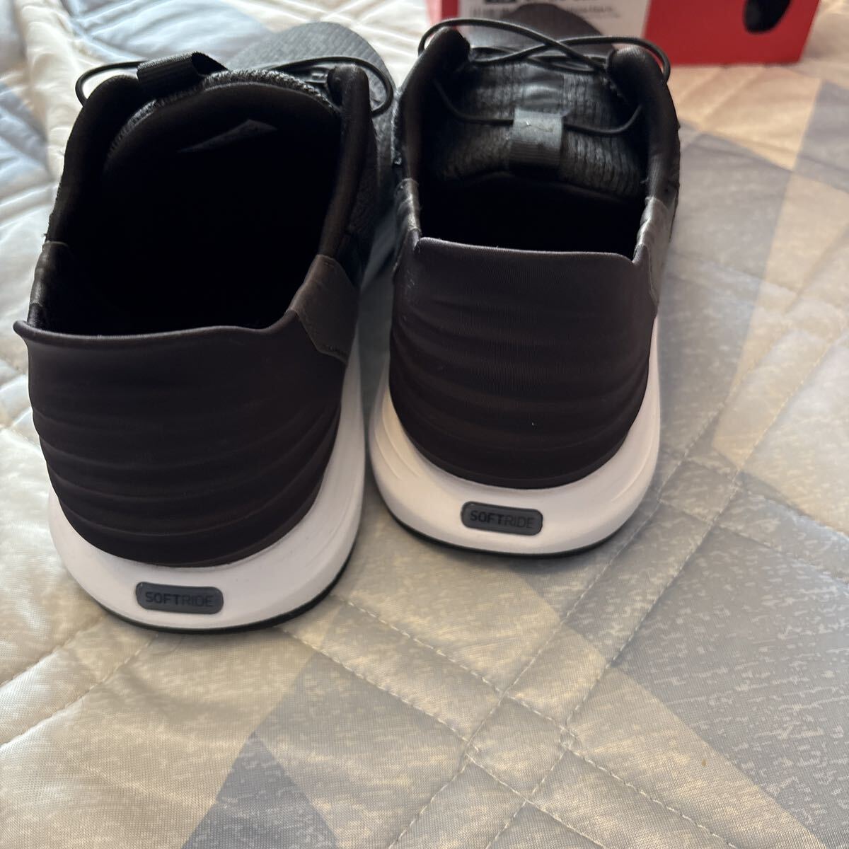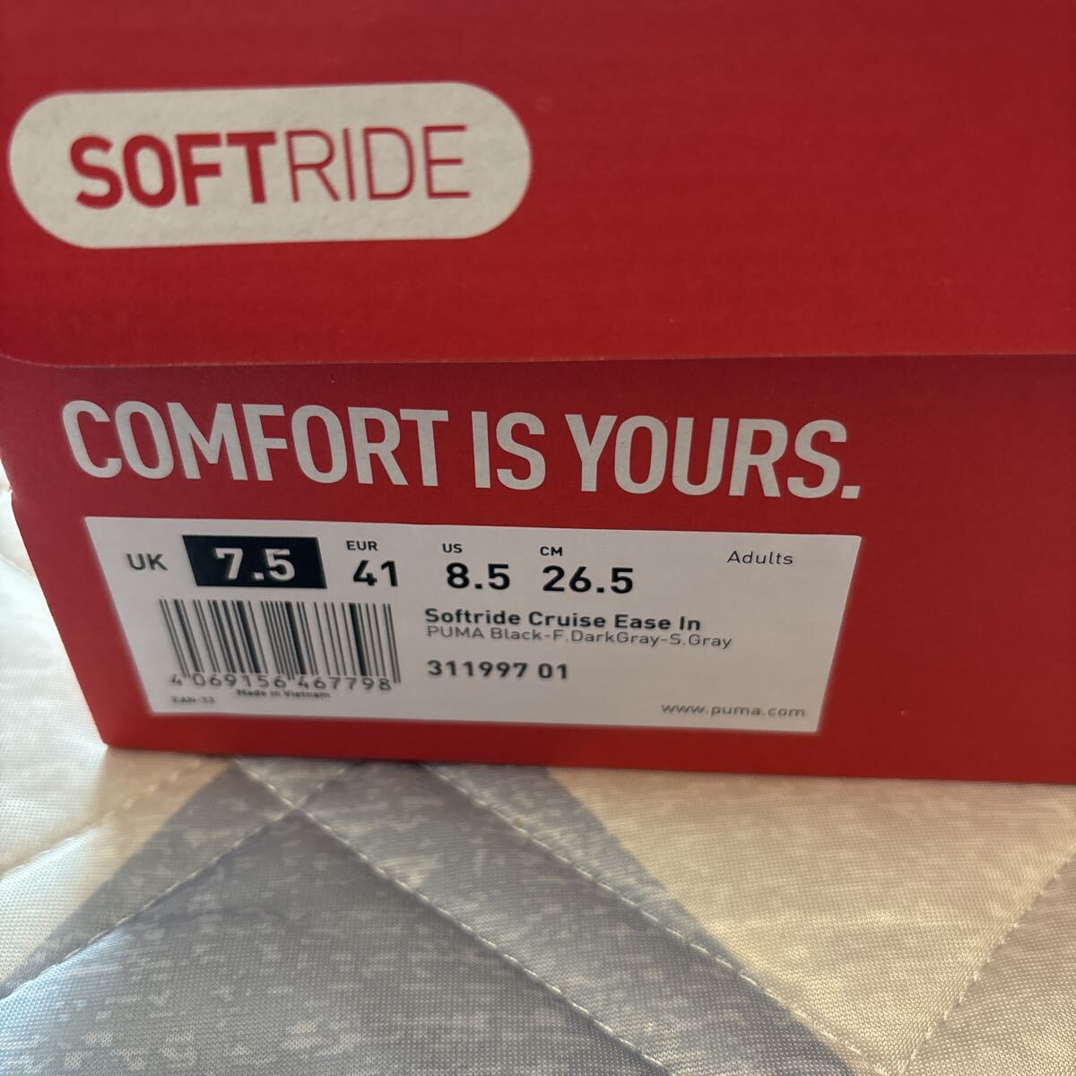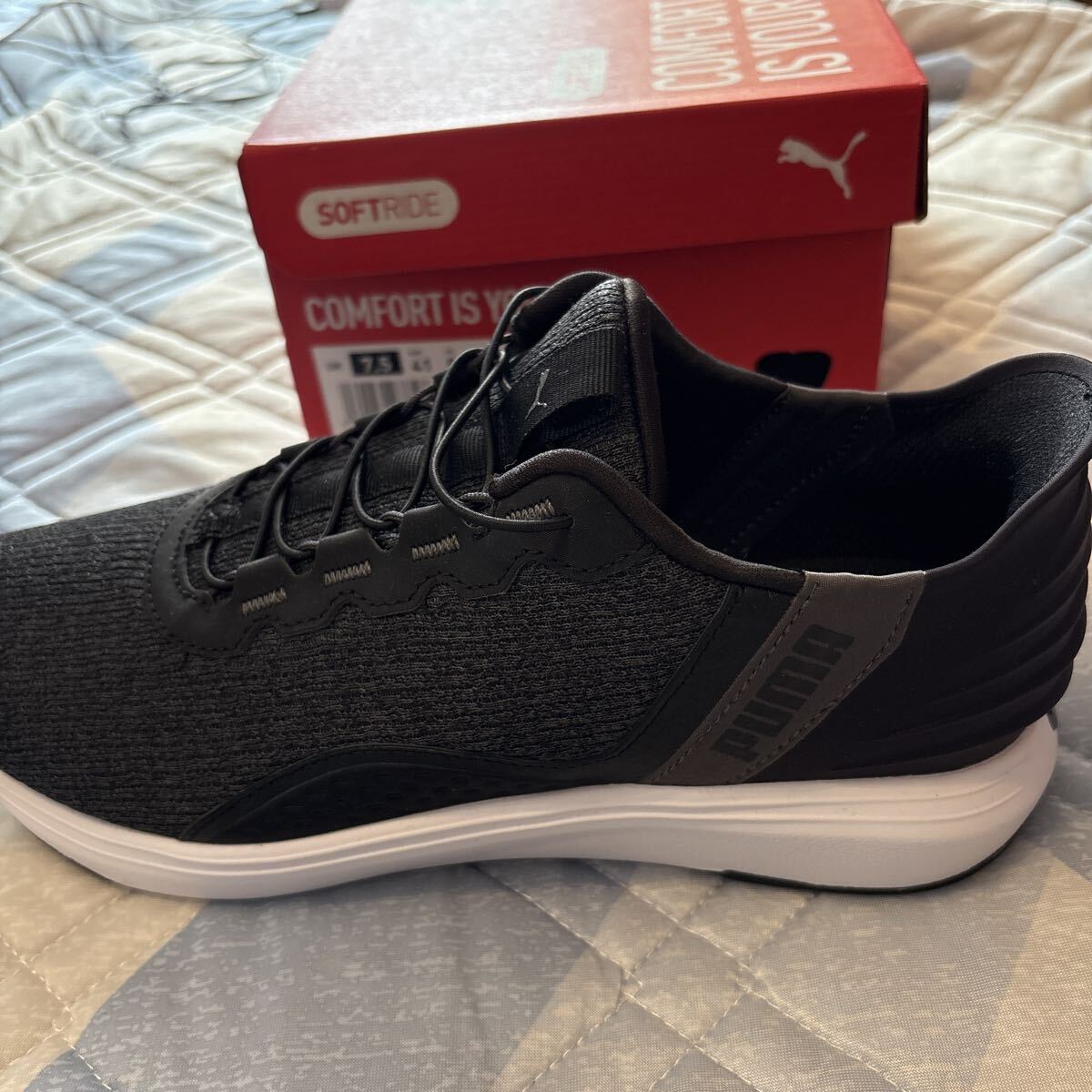 サイズ26.5cm ランニング ウォーキング 軽量 スリッポン クッション性あり。ブラック-ダークグレー。 立ったまま、スッと履ける。[楽ふわっ]な履き心地を提供するソフトライドシリーズから、新モデルのイーズイン(EASEIN)が登場。シュータン一体型のスリッポン構造の履き口、かかと部分が柔らかく、立ったまま手を使わず簡単に足入れが可能です。アッパーにメッシュ素材を採用し、軽量で通気性がよく柔らかい履き心地のシューズ。SOFTRIDEミッドソールは、究極のクッション性を提供し一日中快適な履き心地が持続します。ワイズも通常よりワイドになっており、横幅も気にせず履くことができます。ランニングだけでなく、ウォーキングや外出時にもおすすめの一足です。 素材:合成繊維+人工皮革、合成樹脂(EVA樹脂)、ゴム底 仕様:スリッポンタイプ、サイドにプーマロゴ、シュータンにプーマキャット 重量:約290g(27cm) 原産国:ベトナム カラー:PUMA Black-Flat Dark Gray-Shadow Gray 娘が愛用しているお品を息子にも先月購入し、試着しようと思いましたが、甲高幅広の息子には、足を入れることすらできませんでした。どなたかサイズの合う方に。