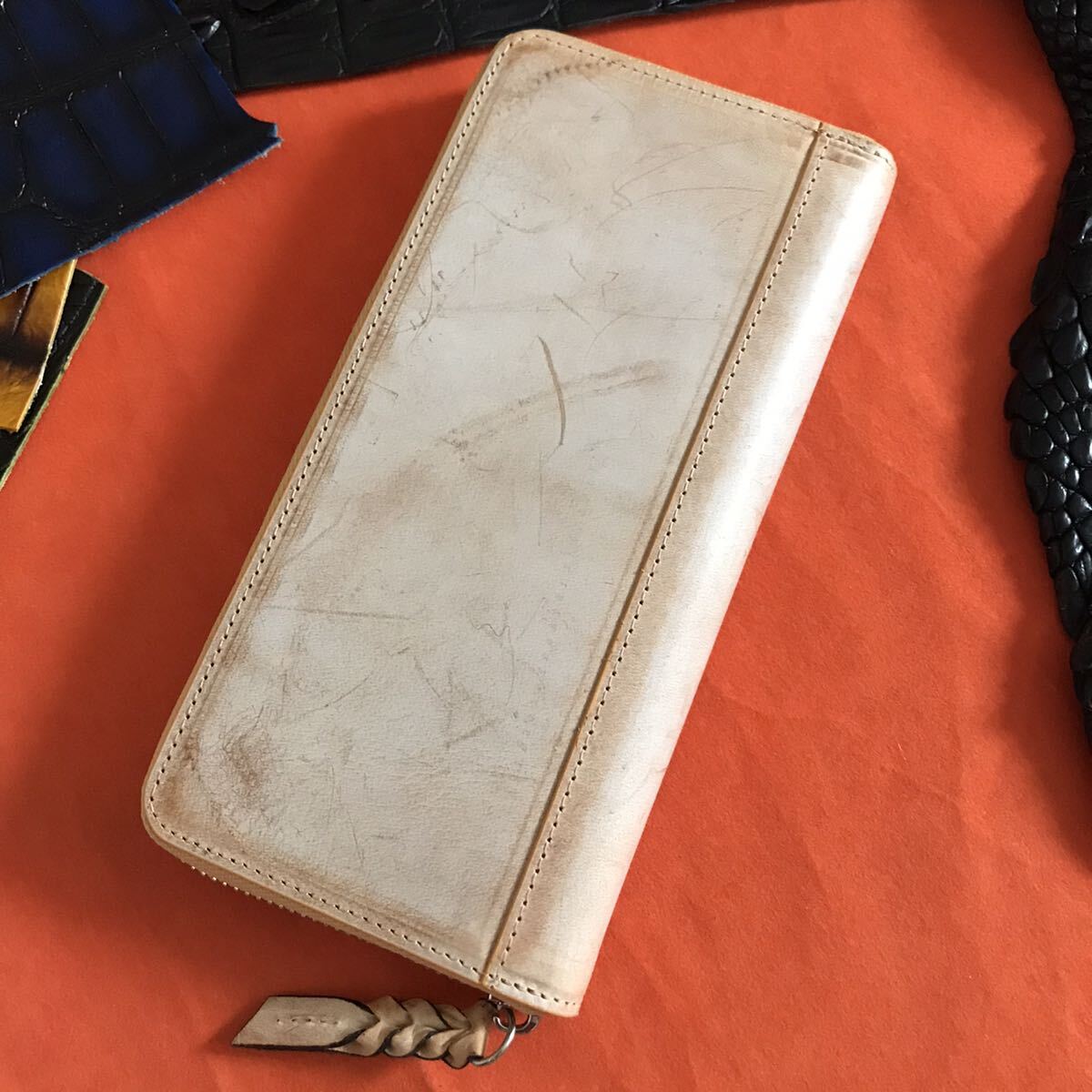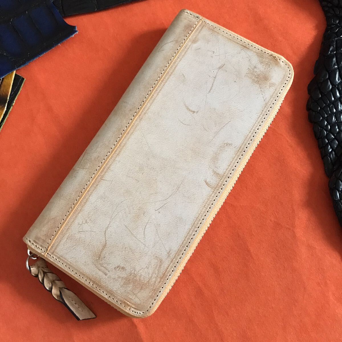 ■英国伝統のブライドルレザー■ 馬具用に革を作る伝統的タンナーがなめした高品質のブライドルレザーを使用していますので、じっくりとエイジング(経年劣化)が楽めます。使うごとに、美しく、強くなっていきます。 ※肉厚で丈夫なステアハイド(成牛)レザーを使用 ■手触り■ ・表面は硬めで、しっとりした手触り。使い込んでいくうちに柔らかく、粘りのある滑らかな手触りに変化します。 ※使い始めはカードの出し入れがきつく感じることがございます。使い込むごとに柔らかく変化しますので、ご了承ください。 ■ブルーム■ 革に浮かびあがる白い粉は「ブルーム」と呼ばれ、たっぷりとロウを染み込ませたブライドルレザーの証です。 「ブルームこそブライドルレザーの証明」とされているため、あえてブルームを落とさずお届けします。 ロウが浮いていても品質に問題ありません。使い込むうちに革に浸透し、次第に美しい光沢を見せるに至ります。 ※浮かび上がるロウにムラがあることや、縫い糸付近のミシン跡は、革に手を加えていない証拠です。 表面にロウをうっすらと塗布しただけの「ブライドルレザー風」にご注意下さい。 ■ブルームを楽しんだ後の美しい光沢■ 使い込むうちに、ブルームは染み込んでいき、味のあるマーブルグレーから艶やかなダークブラックへと変化します。 ※できるだけ毎日、両手で温めるように包み込んでマッサージするとより美しい経年変化を見せます ■お手入れの方法■ ブライドルレザーは、乾燥すると油分が深部から染み出し、再びブルームが表面を覆う習性があります。 常にコーティングされた状態を維持できるため、クリーム等でお手入れする必要はありません。 ■詳細■ 【寸法】 縦19.5㎝×横10㎝×厚み2.5㎝ 【収納】 札入れ×2 小銭入れ×1 フリーポケット×2 カード入れx16 ・商品の画像と実際の色は撮影の状況、モニター等で異なって見える場合がございます ・天然本革を使用して作製しております 自然素材の為 ・革本来の小さな傷 筋、しわ等がある場合がございます