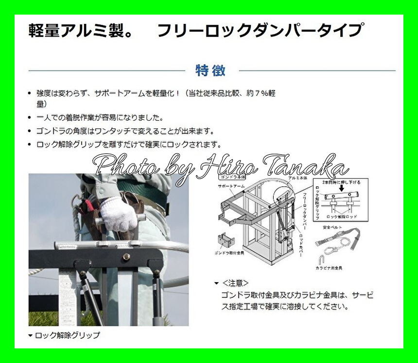 商品説明 | ☆特長☆ ・強度は変わらず、サポートアームを軽量化 (本宏製作所従来品比較、約7%軽量) ・一人での着脱作業が容易になった ・ゴンドラの角度はワンタッチで変えることが出来る ・ロック解除グリップを離すだけで確実にロックされます ※クレーンが古河ユニック製の場合、 先端部に丸みがあり直接取り付きません その場合は別途ユニフック金具をご購入いただく必要がございます ☆用途☆ ・造園・看板・塗装業・建築工事全般に最適 (外壁貼り・屋根工事・軒下工事・各種取付工事・補修等) ・高所での足場を必要とする作業全般に ☆アルミ本体・内寸法☆ 幅508×奥行485×高さ950(単位mm) 本体質量24.3kg |