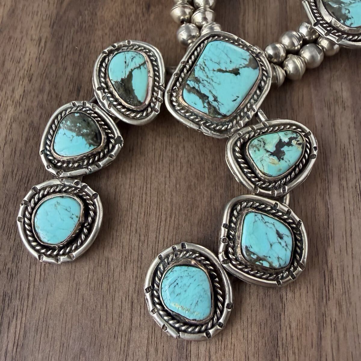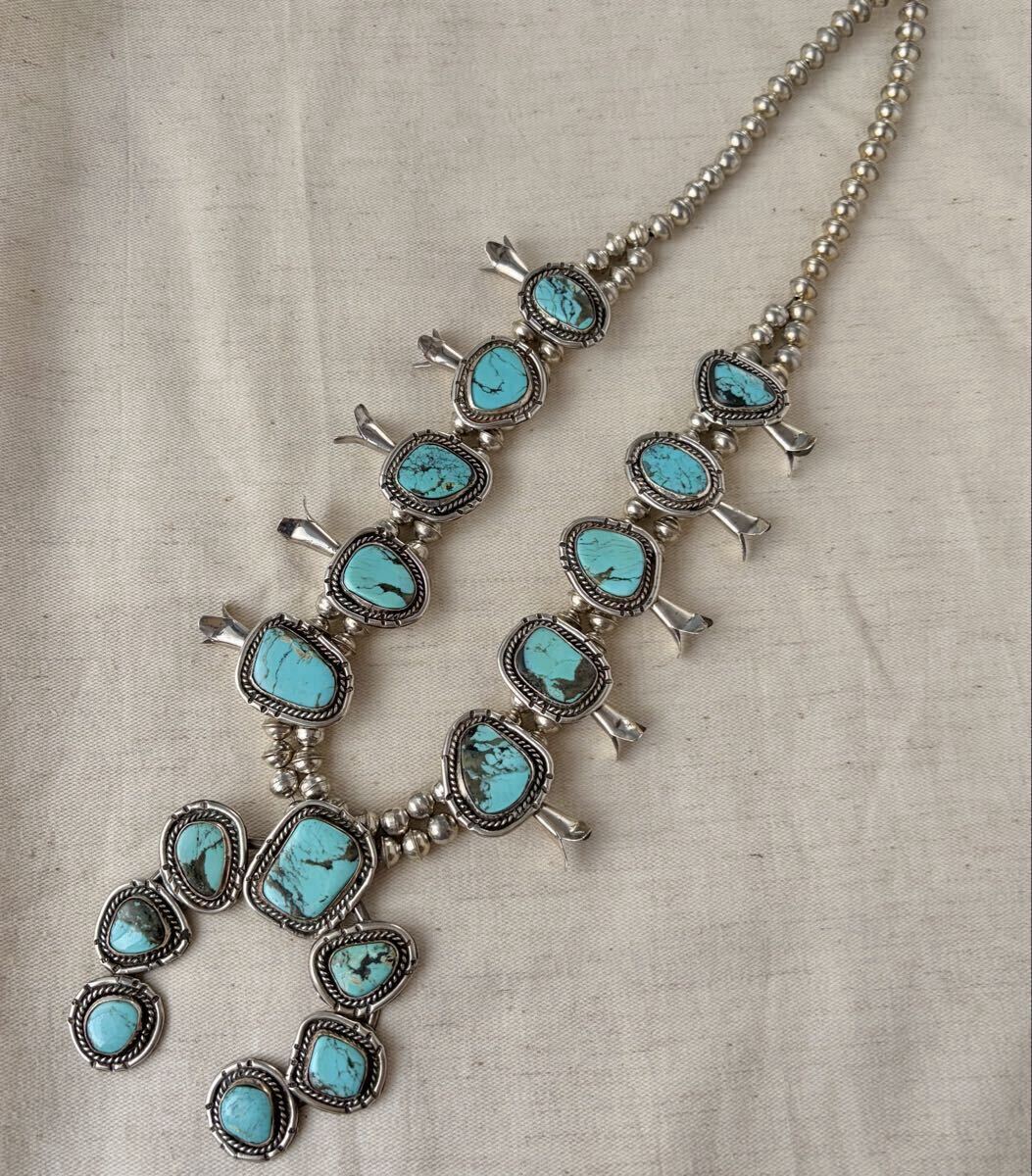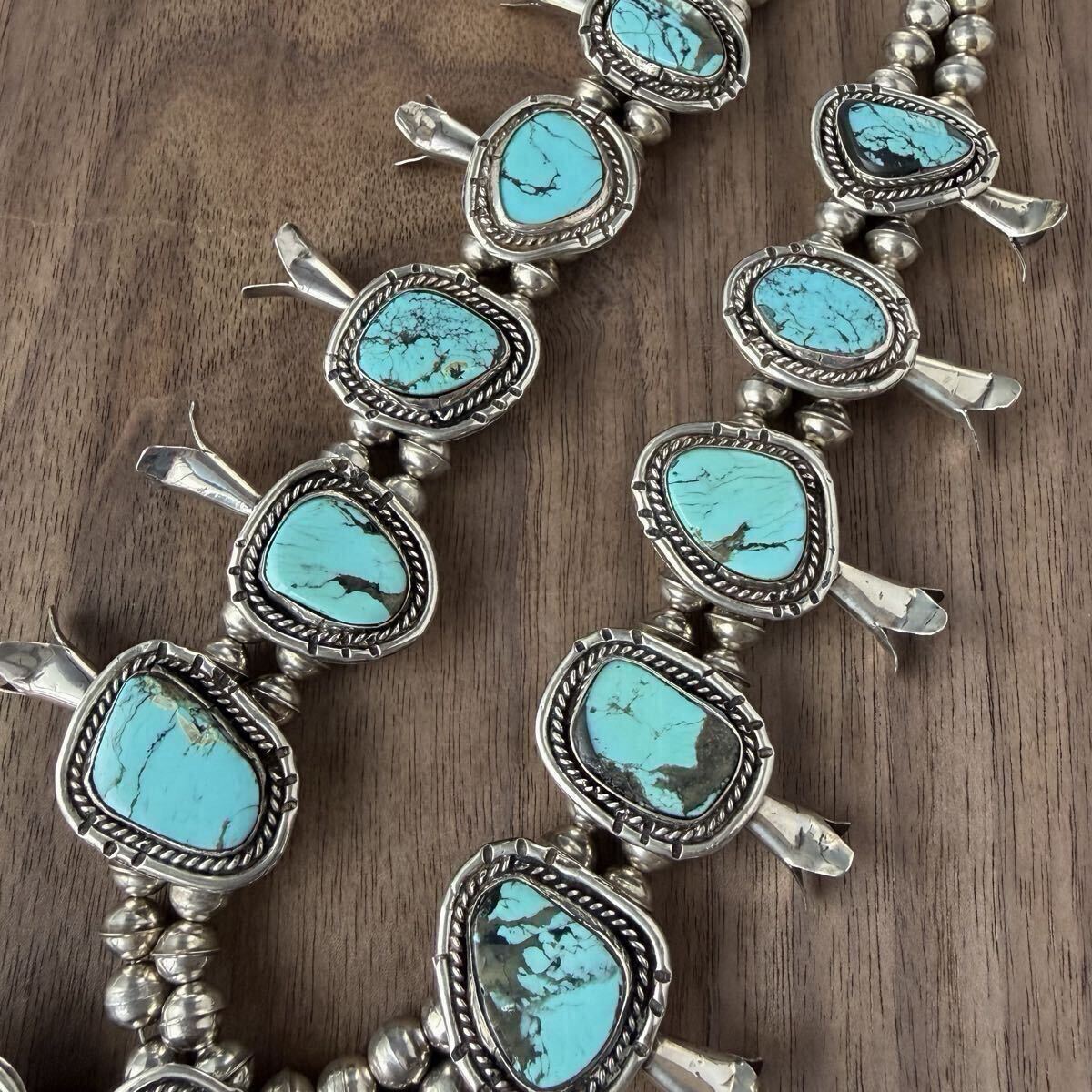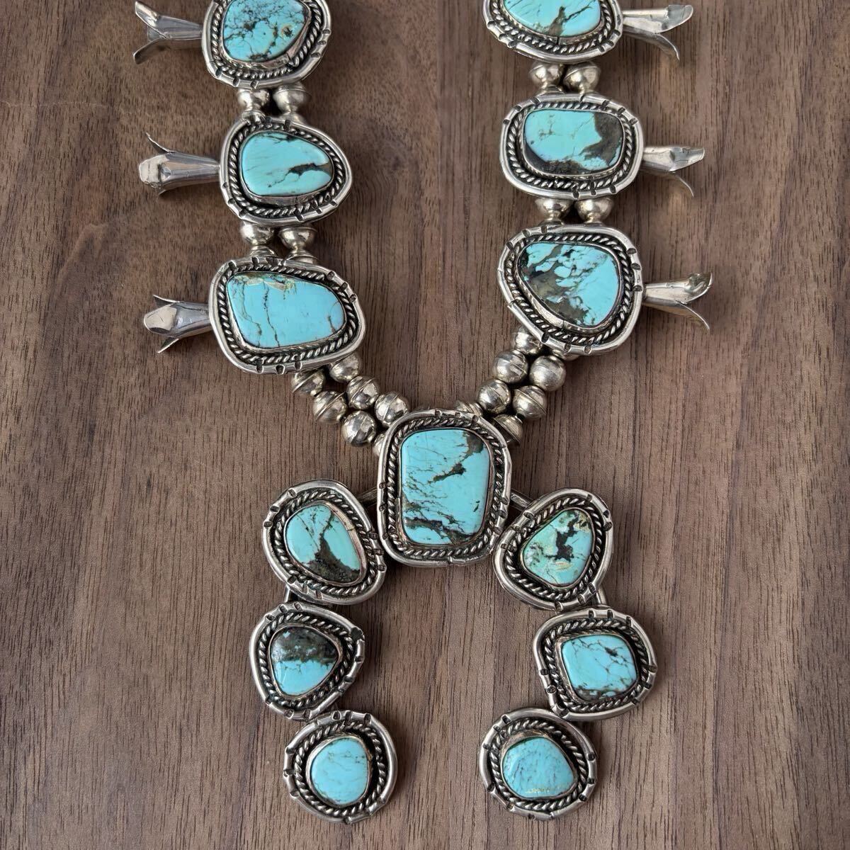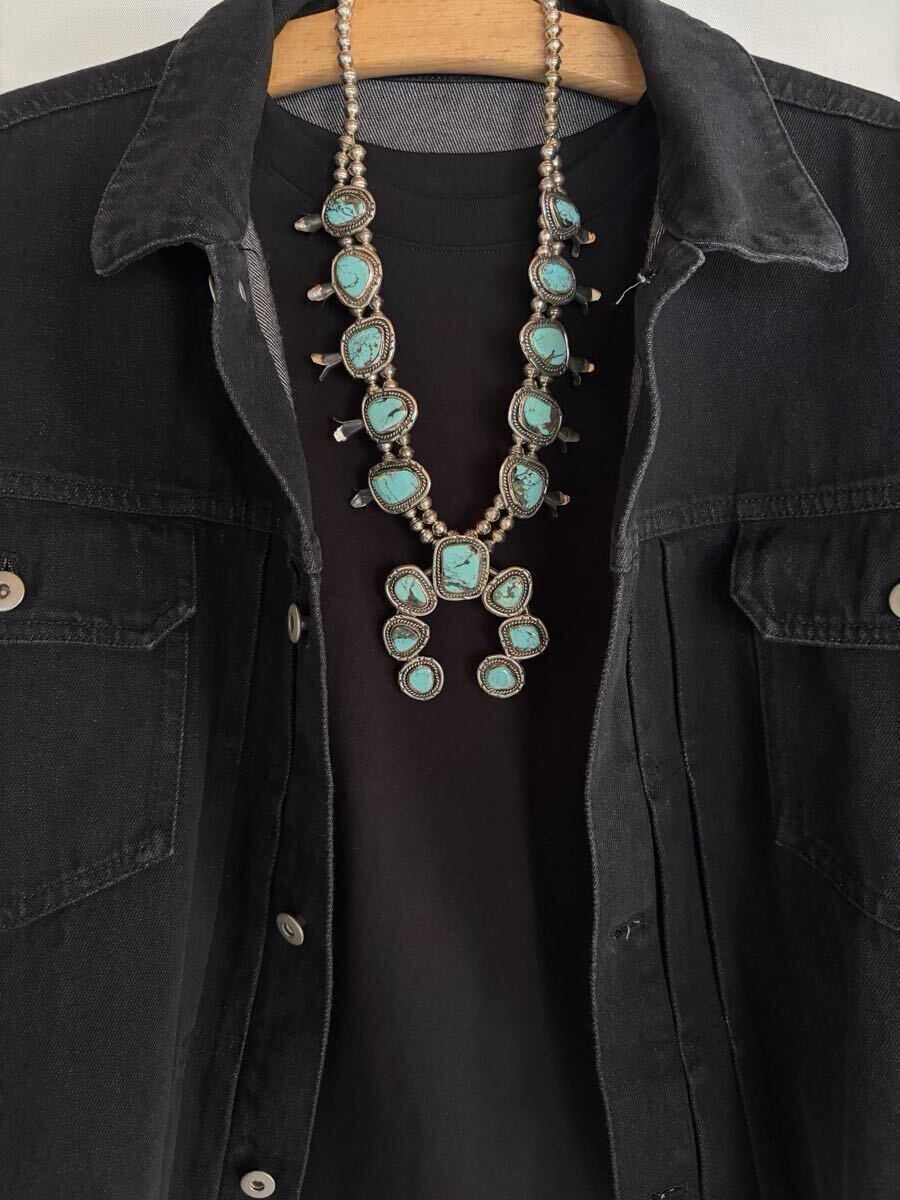 大ぶりなターコイズをあしらった、ビンテージスカッシュブロッサムのネックレスです。