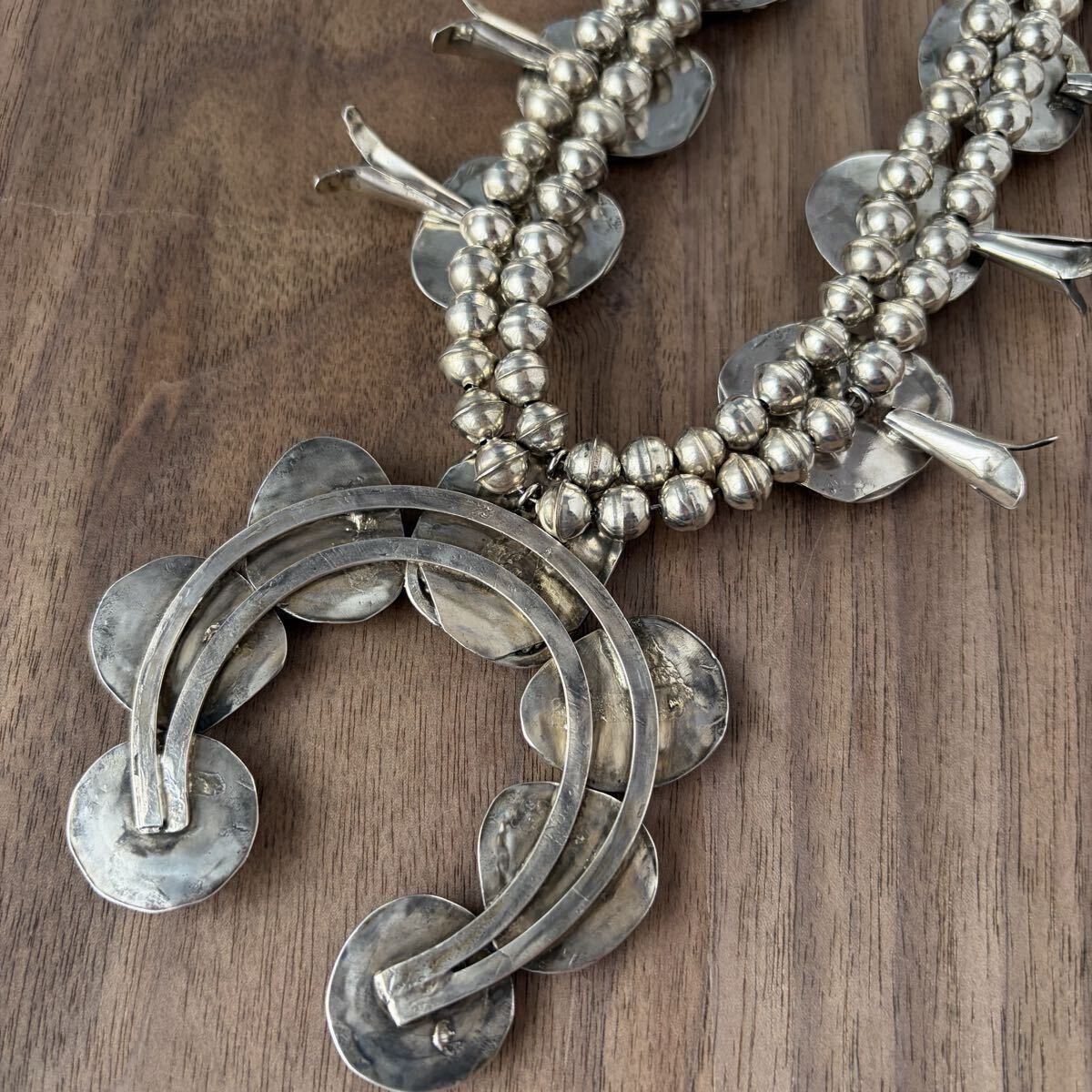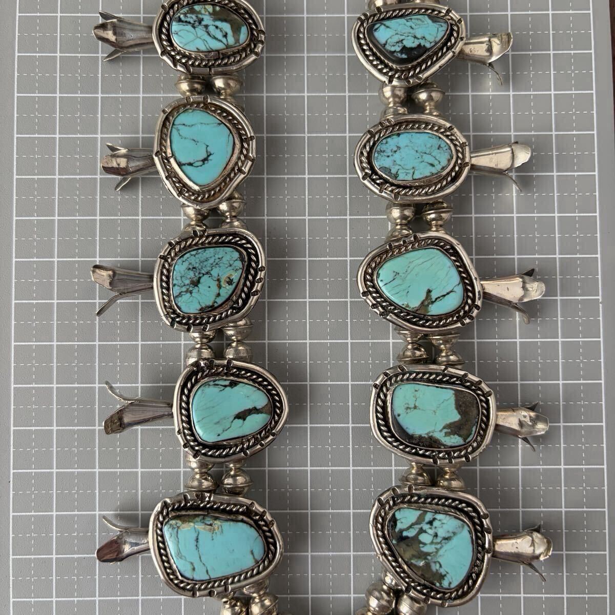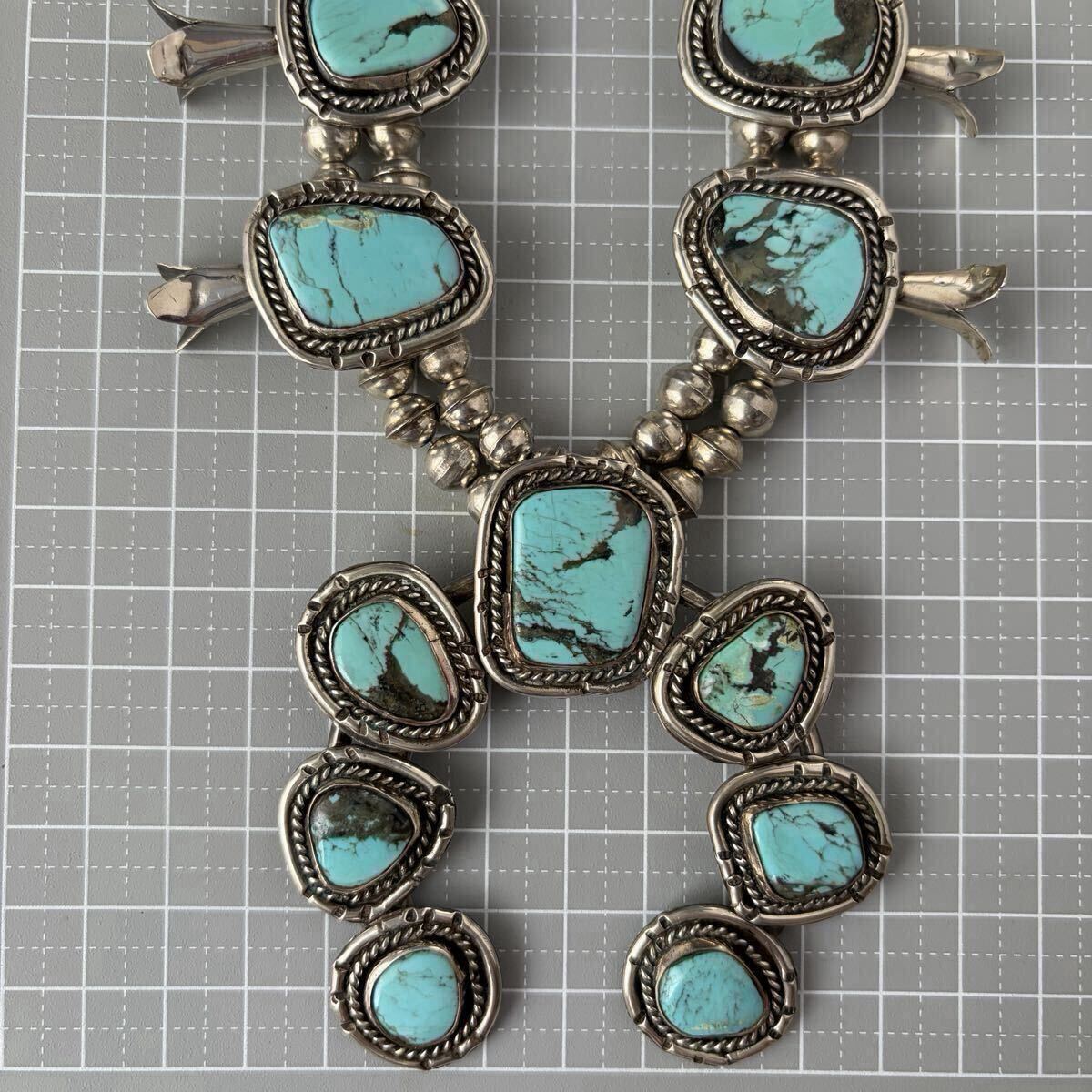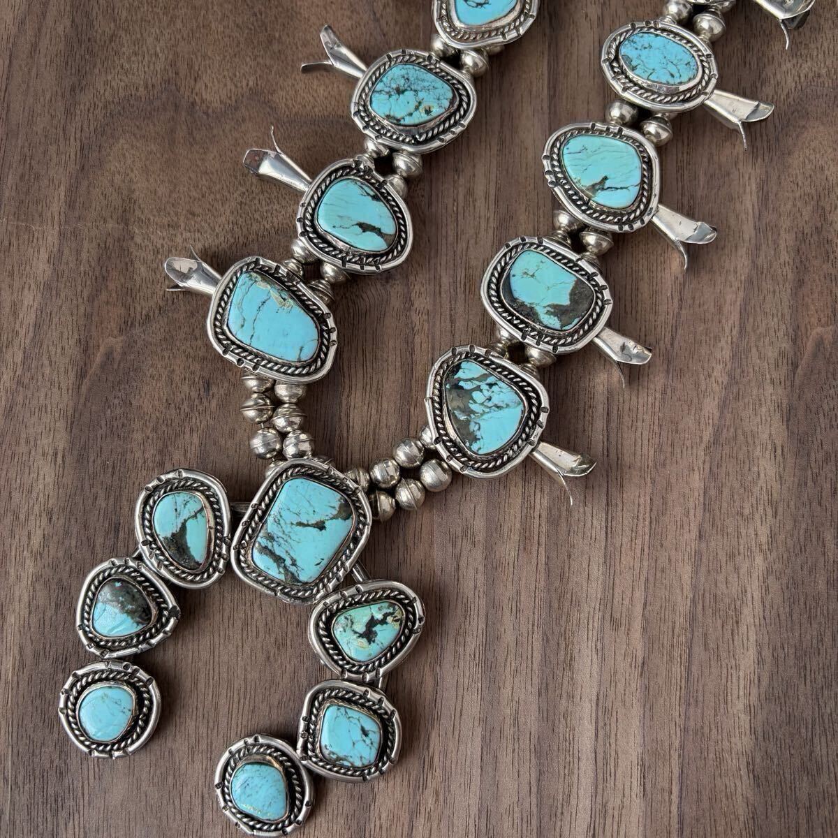 大ぶりなターコイズをあしらった、ビンテージスカッシュブロッサムのネックレスです。