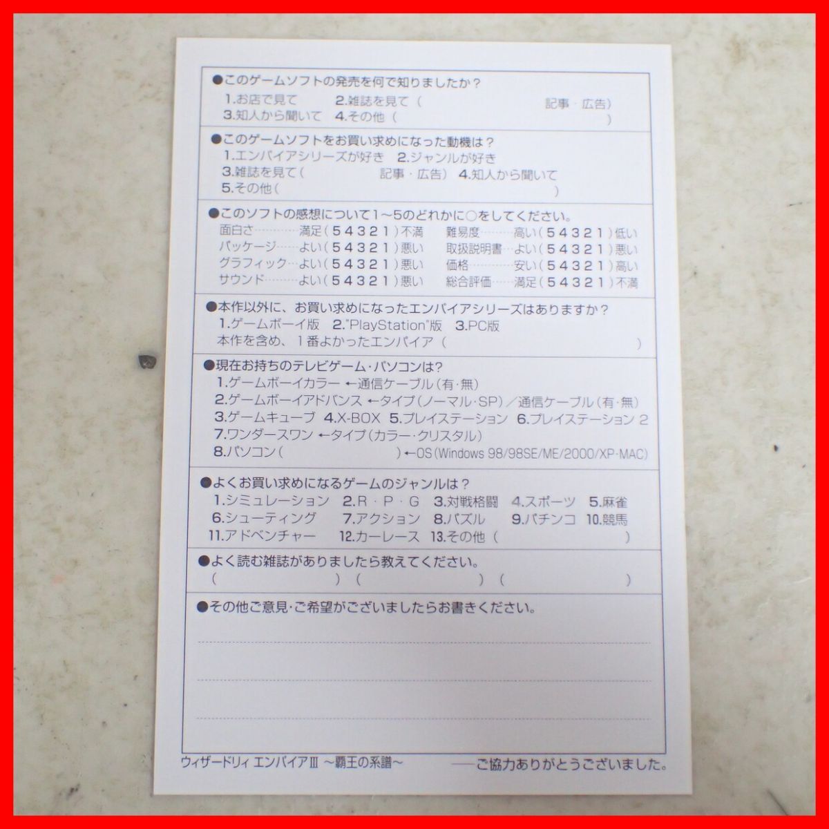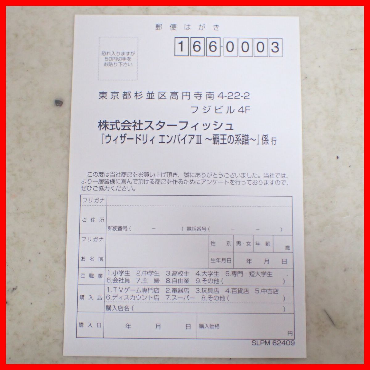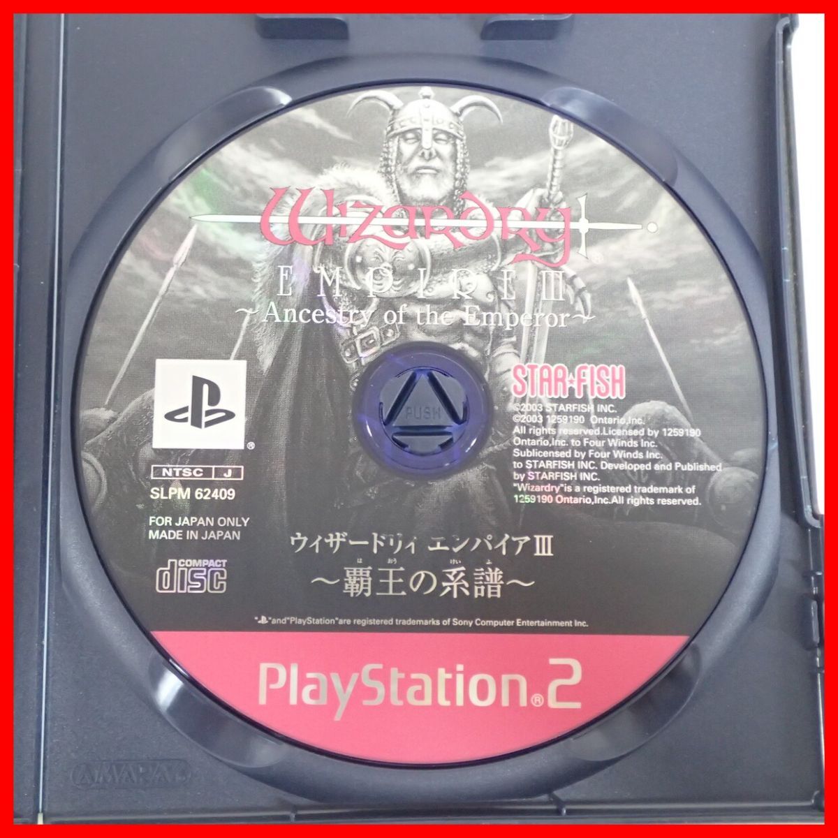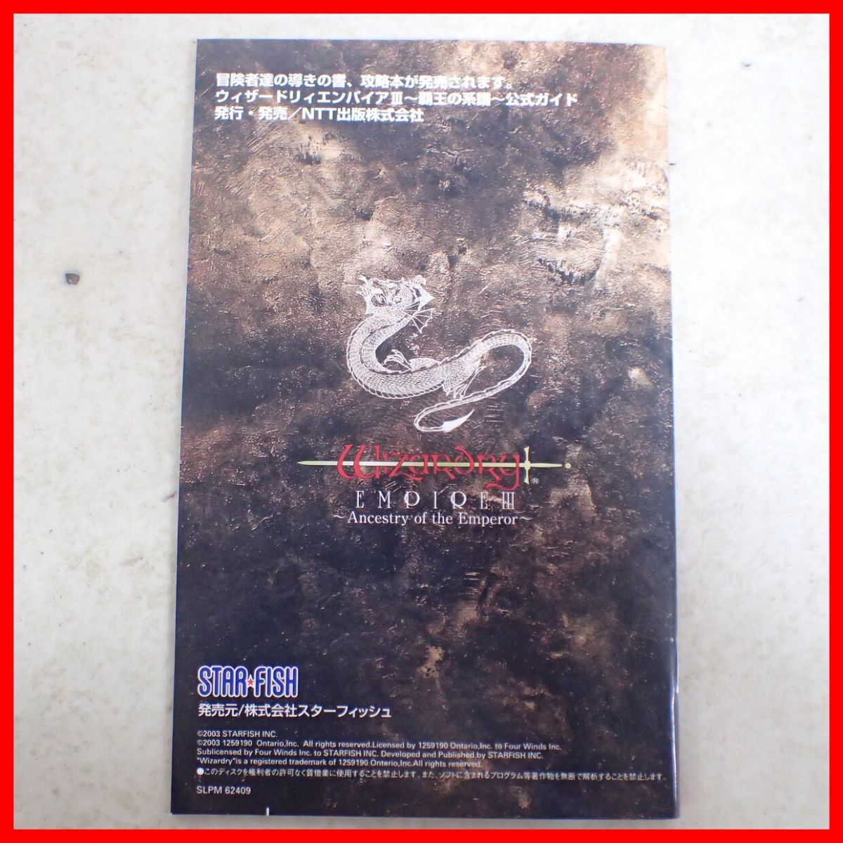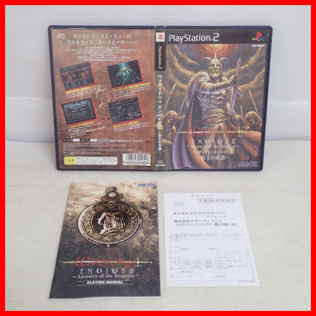 動作保証品 PS2 プレステ2 ウィザードリィ エンパイアIII 〜覇王の系譜〜 STAR FISH スターフィッシュ 箱説ハガキ付 こちらの商品は動作保証品となりますので、一週間の動作保証をお付けします。 ■ケースにスレ、角スレ、イタミ、汚れ、ヤケ、キズがあります。 ■取扱説明書にスレ、角スレ、イタミ、汚れ、ヤケ、キズ、シミ、折れがあります。 ■盤面にキズ、汚れ、ヤケがあります。 ■上記以外は未チェックです。 ■写真のものが全てです。付属物の有無や状態については写真からご判断ください。 ■チェックに使用したモニターや機器等は、特に表記がないかぎりは付属いたしません。 ■古いものですので、当方のチェック時に動作を確認できたものでも、必ずしも商品到着後にも同じように動作することを保証するものではありません。 ■動作確認済み品で、一部のソフトだけが動かない場合など、ソフトと本体の相性による問題については当方の責任の範囲外となりますのであらかじめご了承ください。 ■中古品となりますのでソフトや本体等のメモリー、バックアップ電池等については動作を保証いたしかねます。 ■商品によりますが、発売されてから10年以上経過している中古品であることをご理解いただいた上でご入札をお願いいたします。なお、新品や美品、そのほか特記事項がある場合は別途明記します。 ■ご落札いただいた本体及び箱や取説、付属品、梱包材などは1つでも廃棄や破損をしないようにお願いいたします。 ■商品のご落札後、廃棄や破損をした場合、あるいは【修理や整備、カスタム、付属物の抜き取りやページの抜き取り/書込み等、ご落札者様の目的に応じて何らかの手が加えられた商品】に関しましては、問題があった場合でも対応や返金などの対処ができませんのでご注意ください。 |