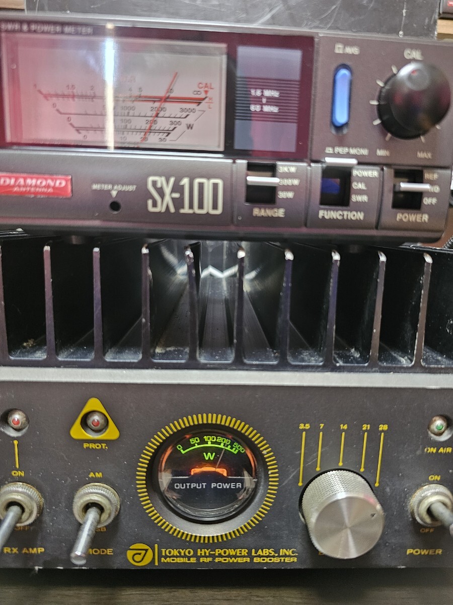 動作確認を行いました。全ての周波数に対応する無線機がありませんので28MHz帯のAMだけで2つの測定器を使い出力を確認しました(ダミーロード使用)さほど差はありませんが約190W~200Wの出力です(未校正の測定器)