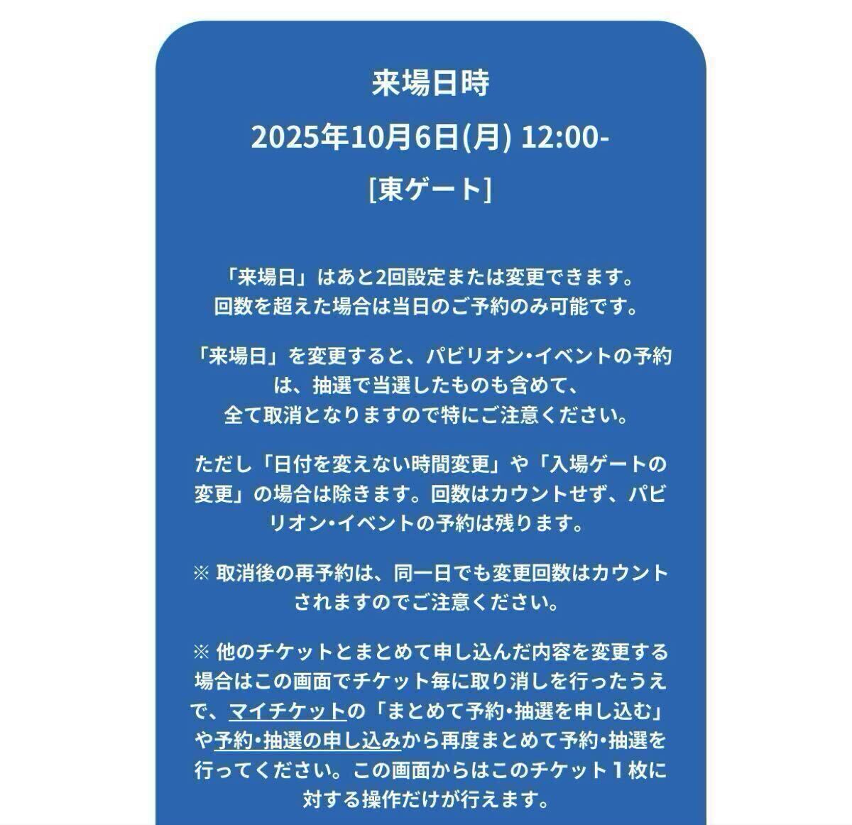 入場予約日時 : 10月6日(月)12時 東ゲート
