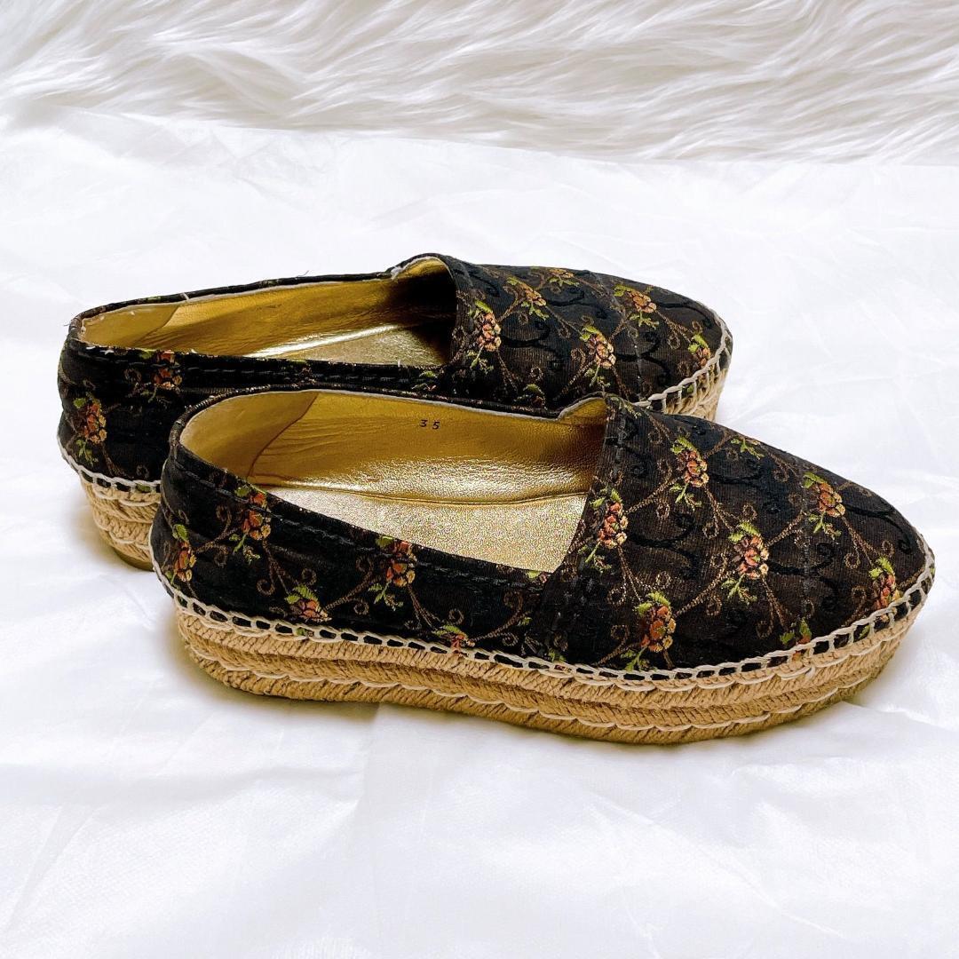 PRADA(プラダ)のエスパドリーユ、35サイズ(約22.5cm相当)です。落ち着いたブラックベースにゴールドの中敷き、上品な花柄刺繍が全面に施された華やかなデザインが特徴。ジュートロープのソールが夏らしく、カジュアルからきれいめまで幅広いコーディネートに対応します。インソールにはブランドロゴが刻印されており、高級感も抜群。使用感は少なく、全体的に非常に綺麗な状態です。