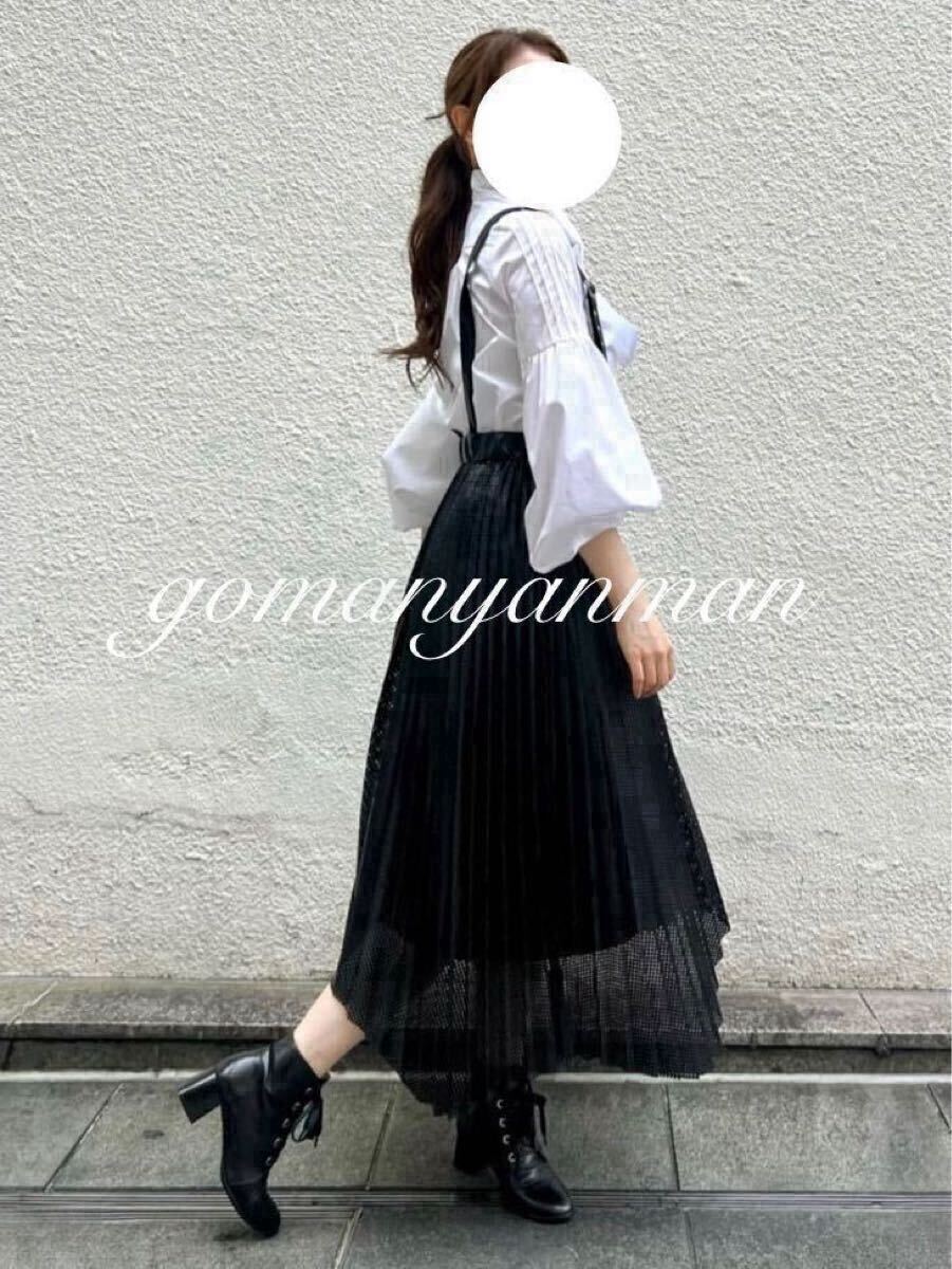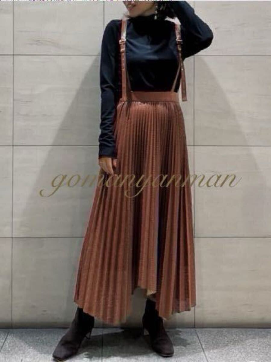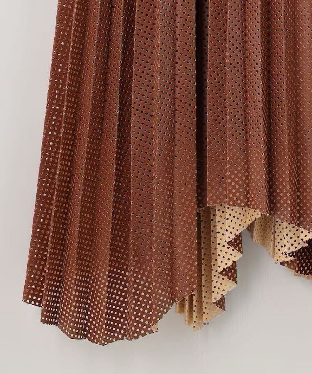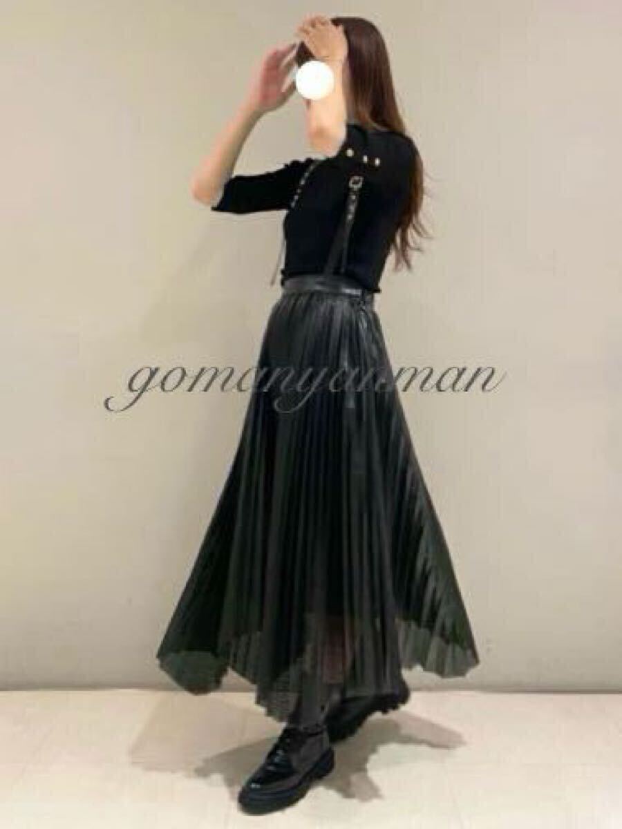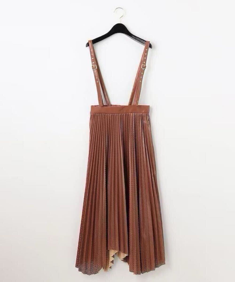 レザーライクなルックスが上品に着映える、肩紐付きロングスカートです パンチングを施した豊かな表情が、女性らしい大人のカジュアルスタイルにぴったりな仕上がりで、肩紐は取り外したり垂らしたりして楽しめます プリーツを施したイレギュラーヘムのフェミニンなシルエットで、裏側はベージュになっていてチラリと見えるのがかわいいです とてもおしゃれなのでおすすめです!