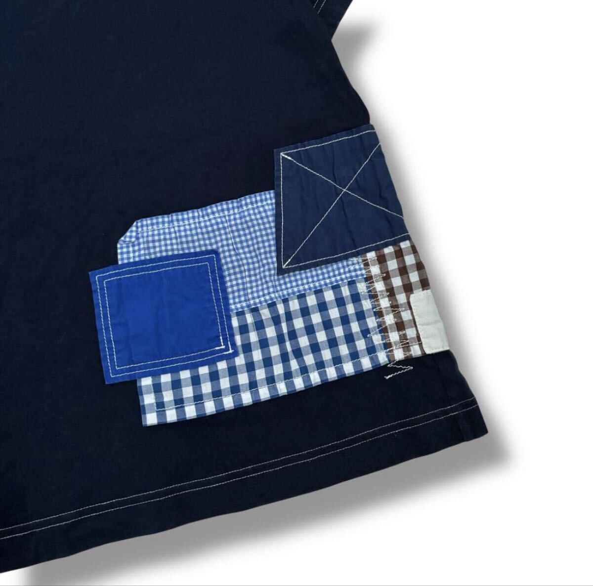 アシンメトリーに配置されたパッチと、あえて見せたカラフルなステッチがデザインのアクセントになります。