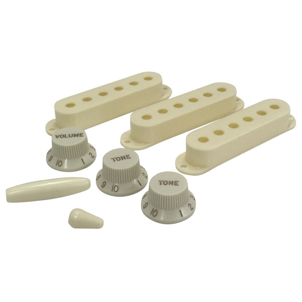 ストラト用のコントロールノブ、スイッチノブ、アームキャップ、ピックアップカバーをセットにしました。