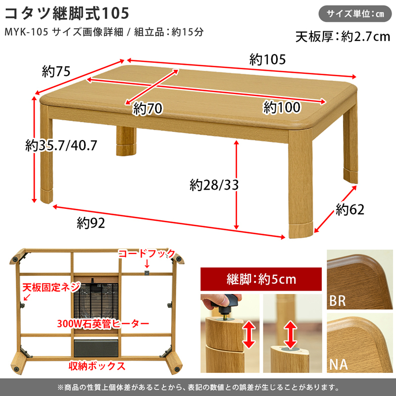 サイズ | (W)幅105×(D)奥行75×(H)高35.7~40.7cm 空間部高さ33cm(継脚をはめた状態で) 天板厚:約27mm |
