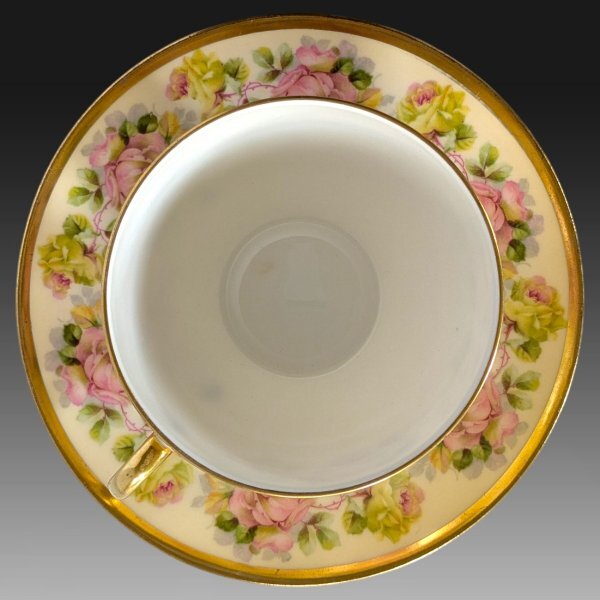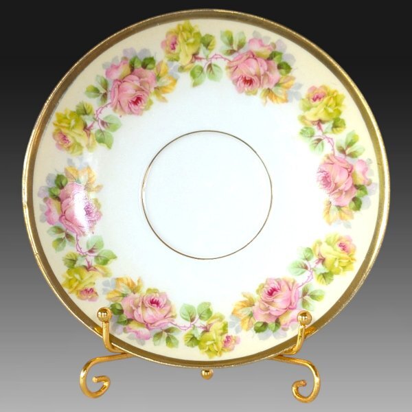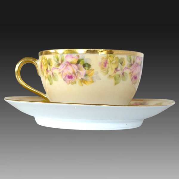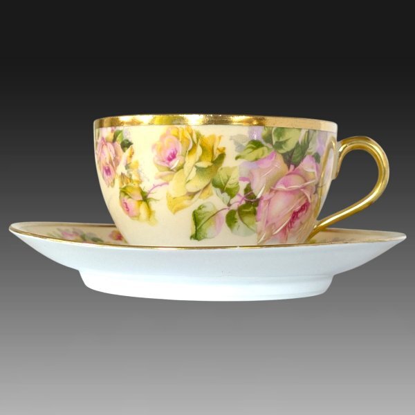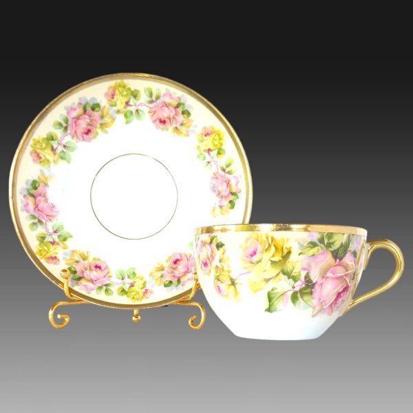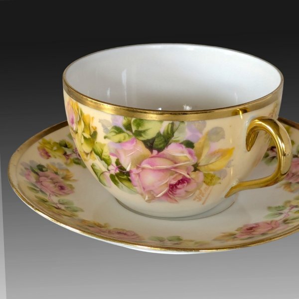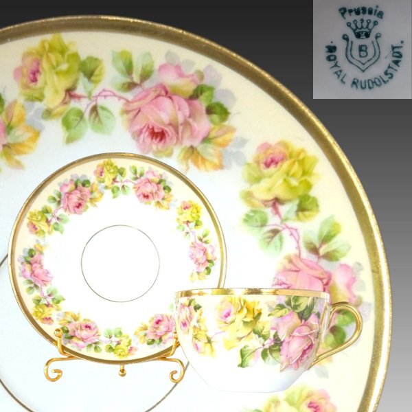 【美品】ドイツアンティーク Royal Rudolstadt Prussia 金彩 薔薇絵 カップ&ソーサー プロイセン 絵師サイン入り デカール&手彩色 1012r |