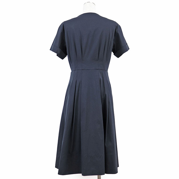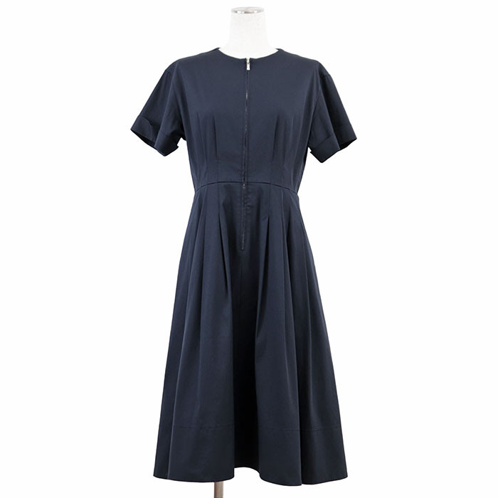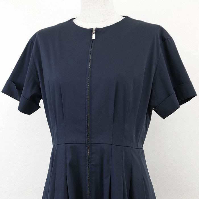 【美品】FOXEY フォクシー ワンピース 半袖 41451 ロゴ タック フレア ジップアップ 伸縮性 ミディ丈 ドレス レディース 40 濃紺 日本製