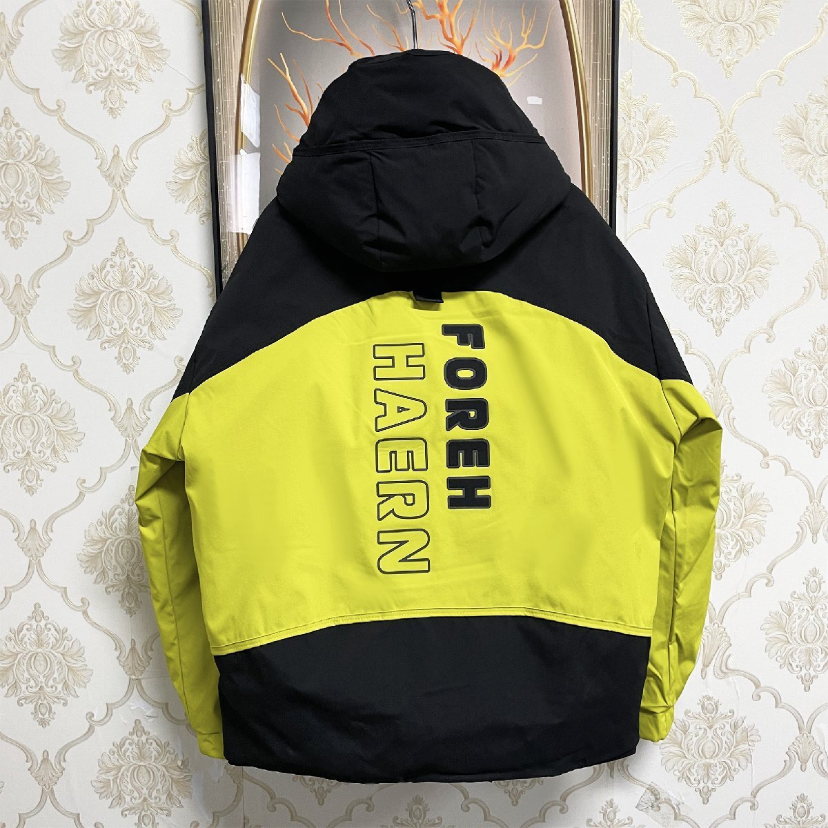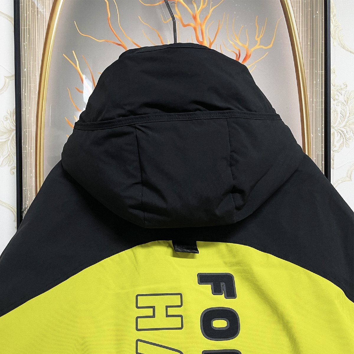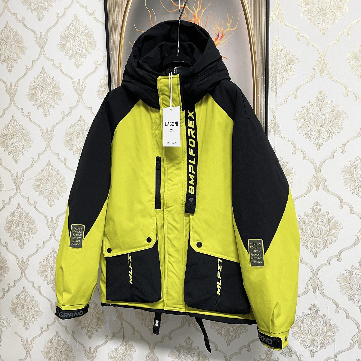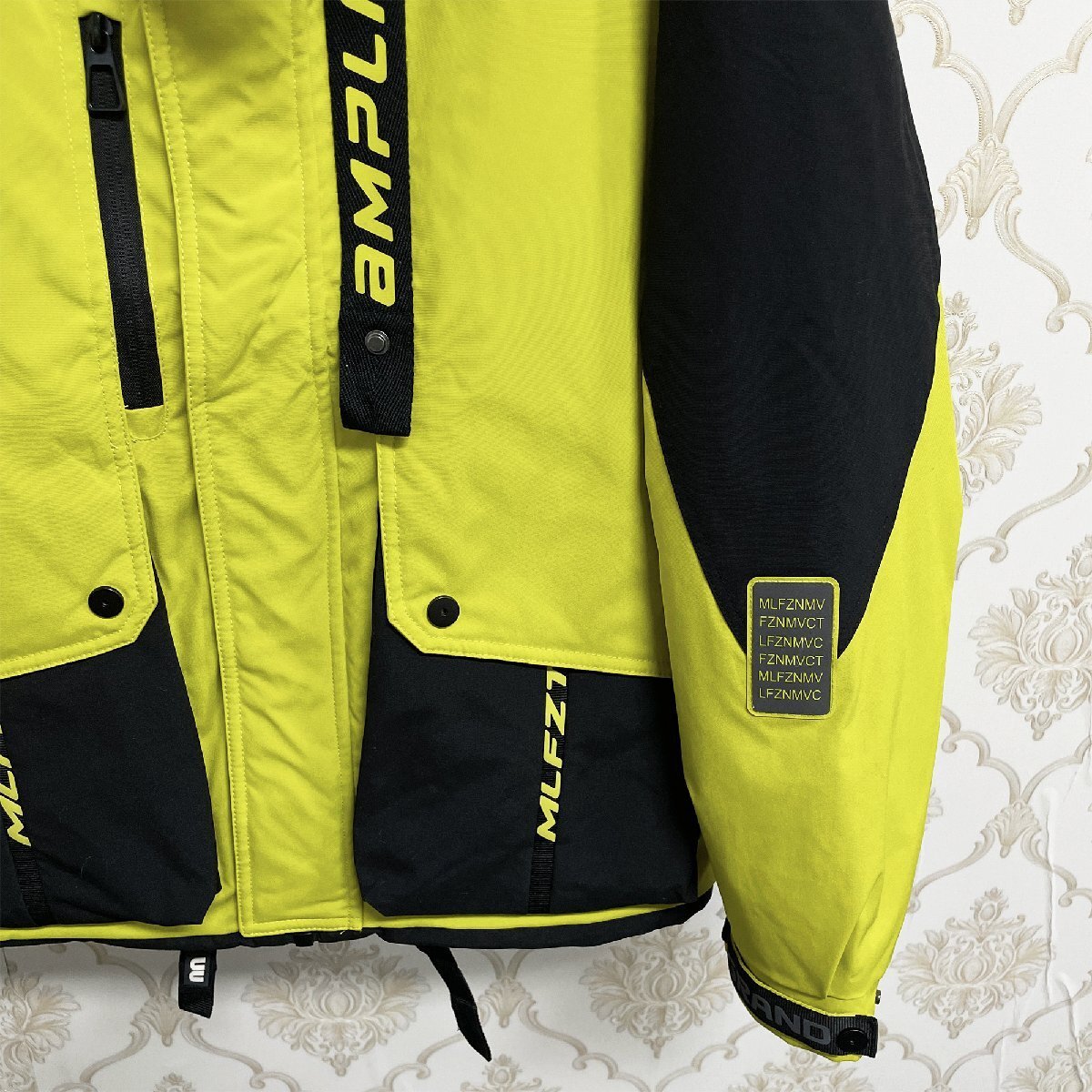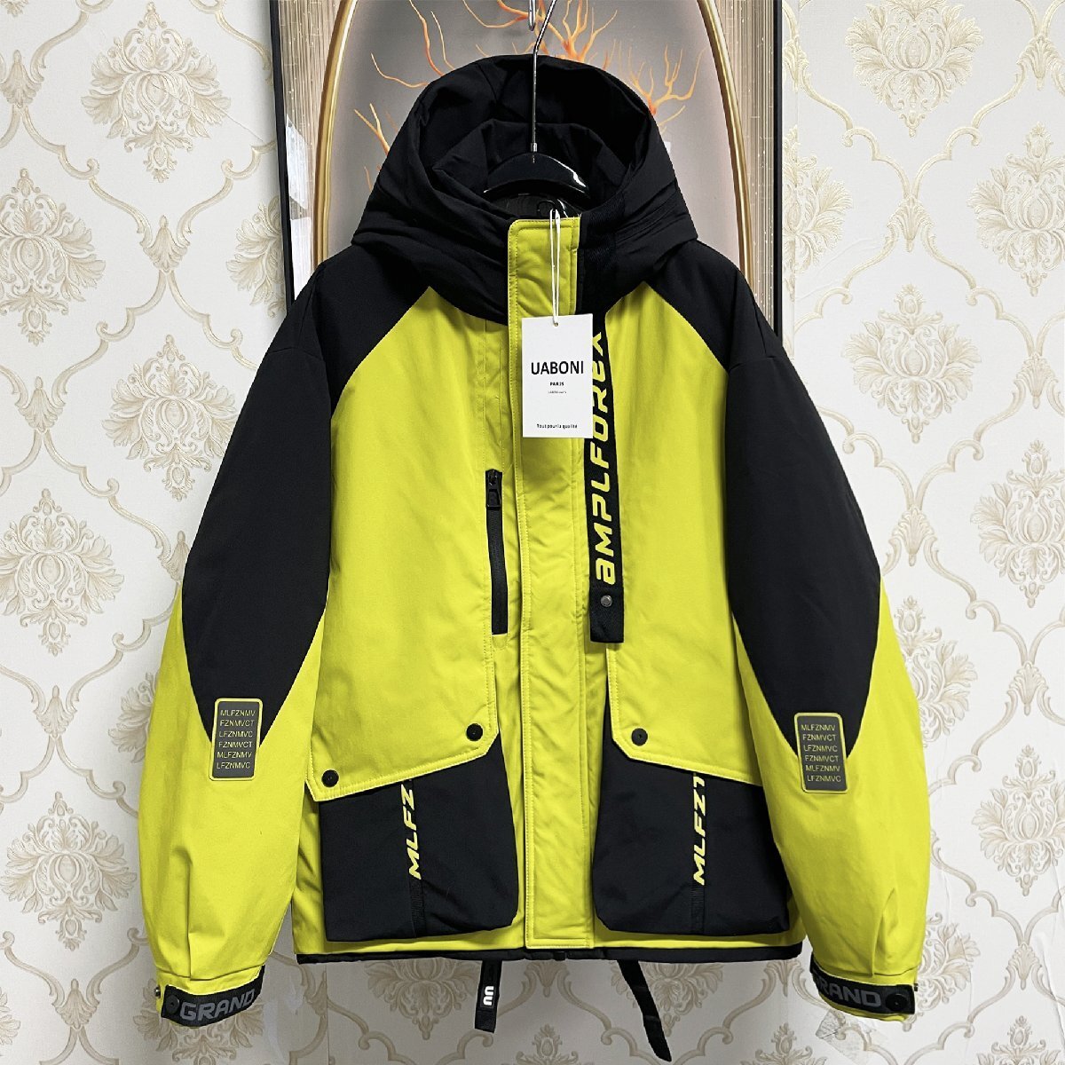 2色切り替えの配色がコーデに取り入れやすく、こなれ感のあるモードスタイルが完成できます。胸元、袖、背中の英字プリントが目を引く、スタイリッシュさをプラスしています。フード付き(取り外し不可)&袖口ボタンも付き、首元はハイネックのように閉めることができます、風の侵入をしっかり防止。外側に大きいボタン付きのポケットが2つ、右胸にはジッパー付きのポケット一つを加え、内側一つのポケットもあり、四つのポケットを装備しており、様々なものが収納できます。