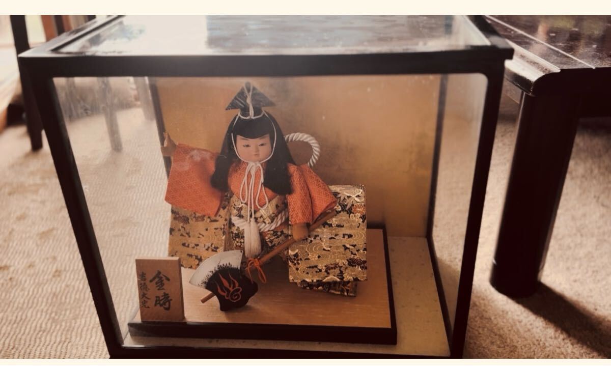伝統的な衣装を着た日本人形で、ディスプレイケース付き。