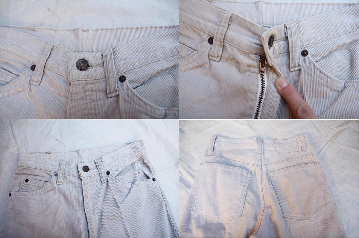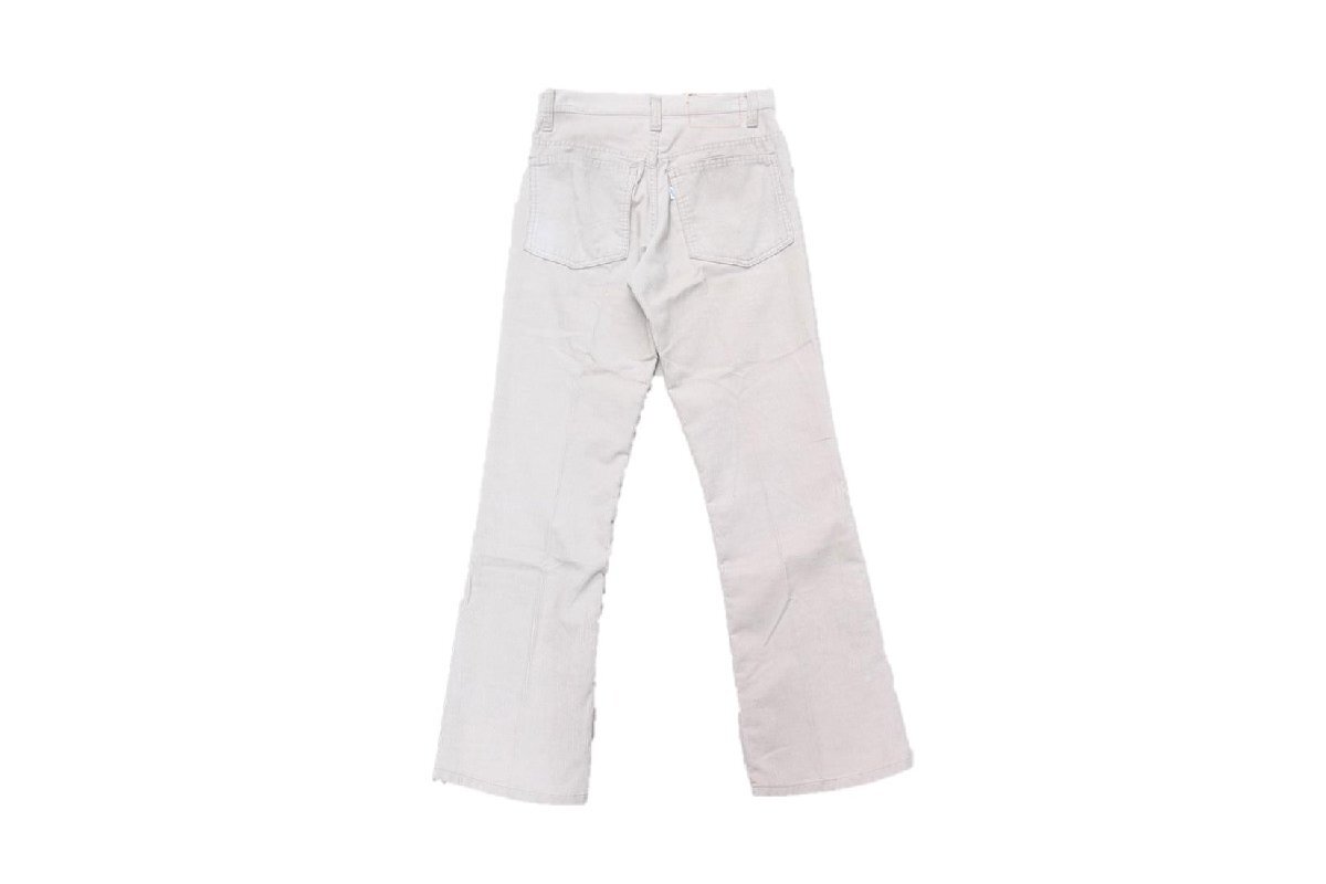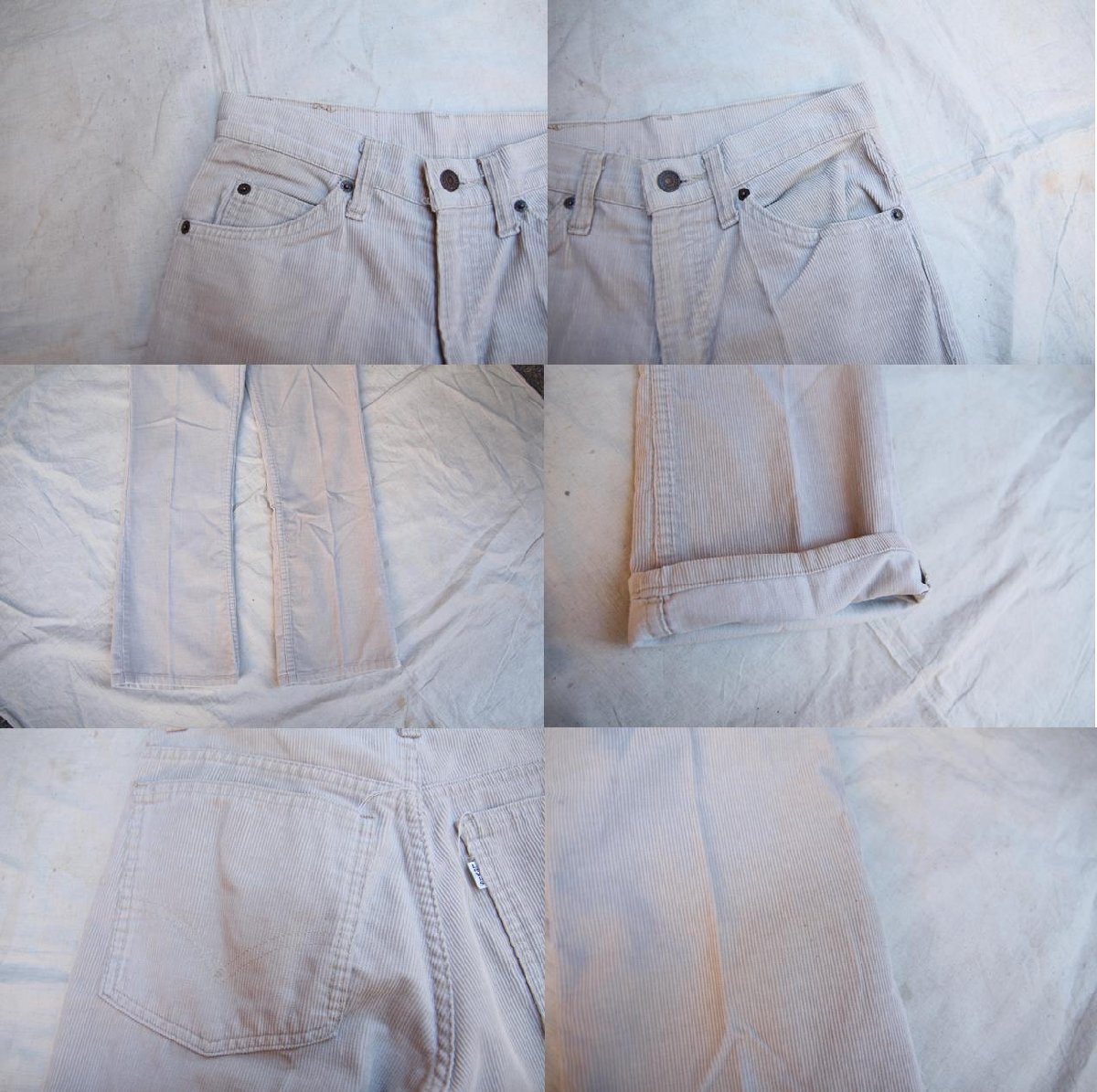 1970年代から80年代頃のLevis製コーデュロイパンツとなります。品番は517で、緩やかなブーツカットシルエットとなります。こちらはZipperがTalon42使用でUS製のオールド物となります。年代がオールドの方が現行物よりブーツカットの広がりが広いシルエット個体が多いのでオールド物がお好きな方も多いかと思われます。カラーはくすんだホワイトでウエストサイズが28インチと小さめサイズとなりますので、小柄な男性もしくは女性の方にお勧めです。オールドの517をお探しでサイズの合う方は是非ご検討下さい。