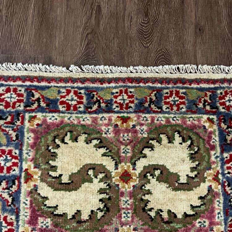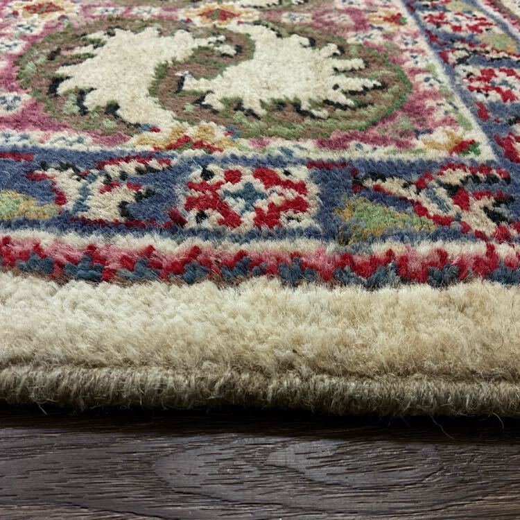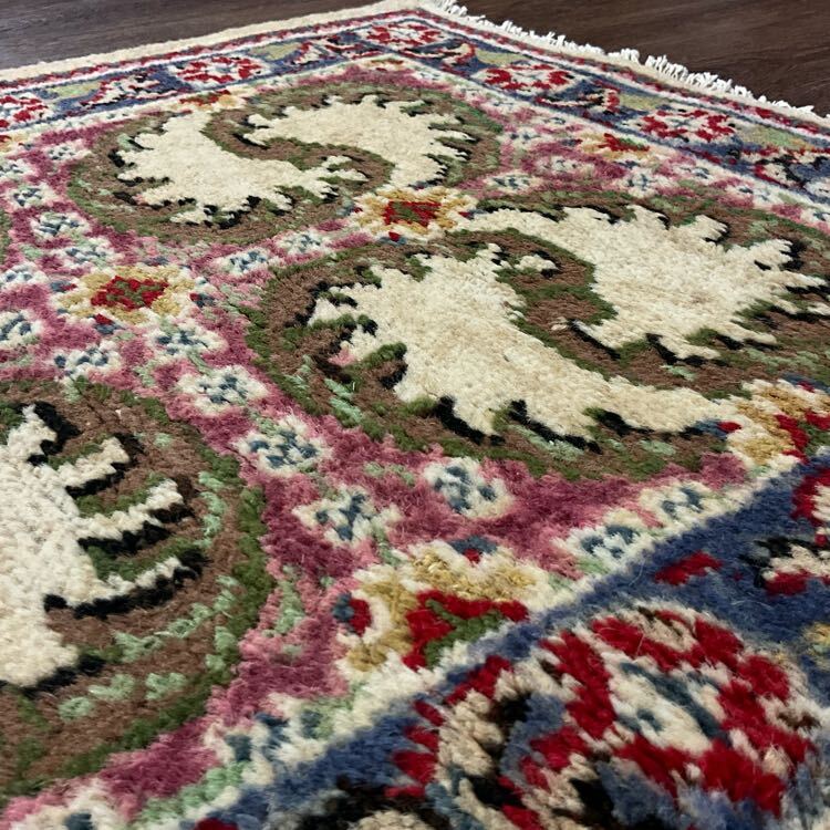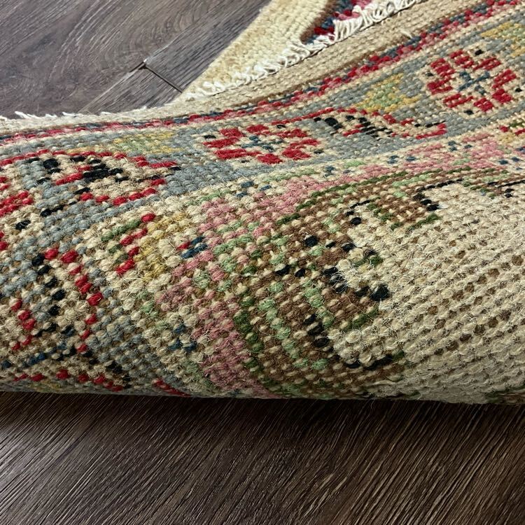 ★空間を彩る★経年による色滲み、全体的に美しい擦れが広がっております。手織りの味わいを感じる厚く丈夫な織り、短く揃えられたパイルで柔らかな手触りの毛並み、鮮やかな色味で表現された花々や鳥の翼のようなモチーフが並ぶフィールド、下からの冷気を防ぎ、長く立っていても疲れにくい安心できる厚みがオススメの一枚です。(画像をご確認下さい。)