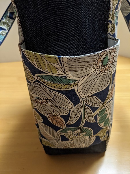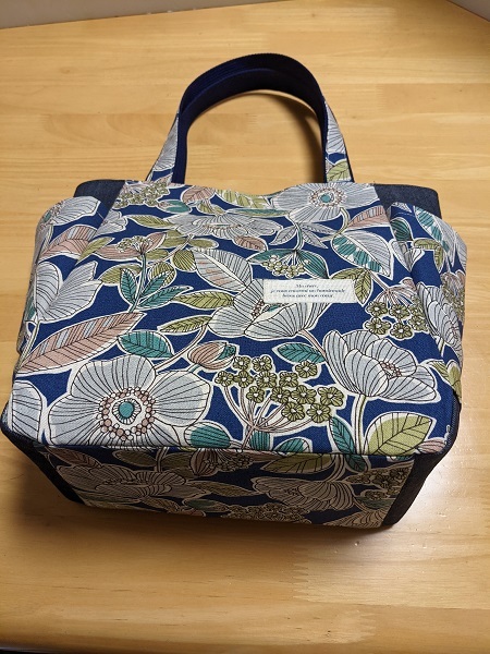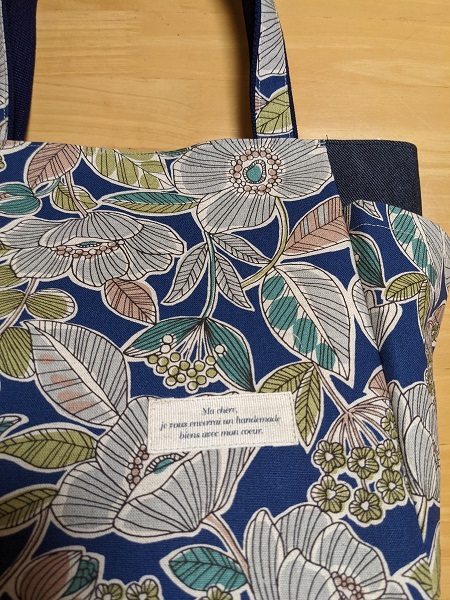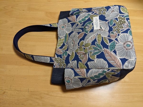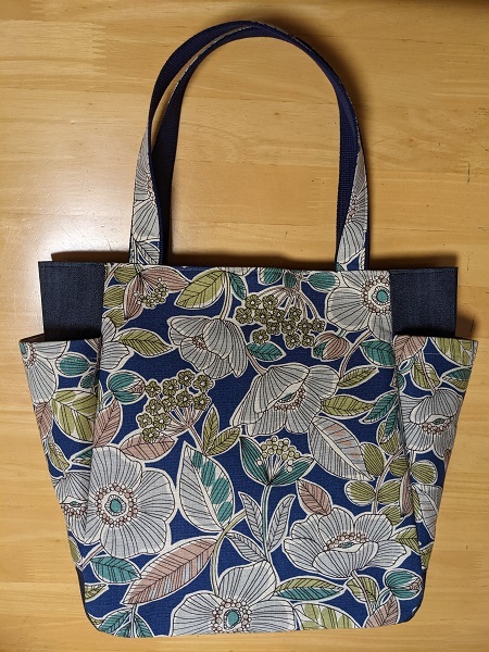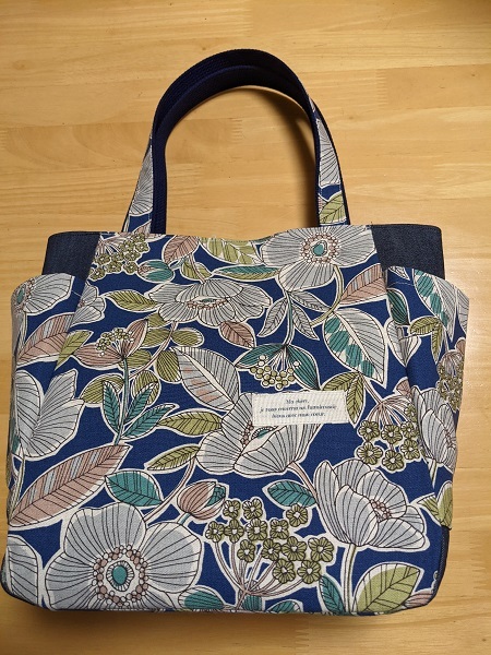 ネイビーブルー地にカラフルな可愛いボタニカル柄の生地で両サイドにポケットのついたおしゃれなチューリップトートバッグです。