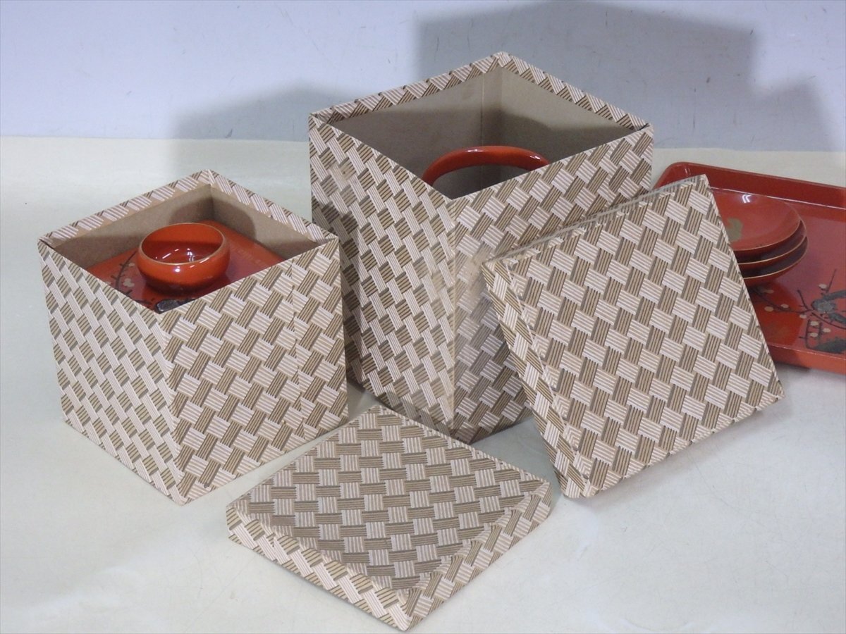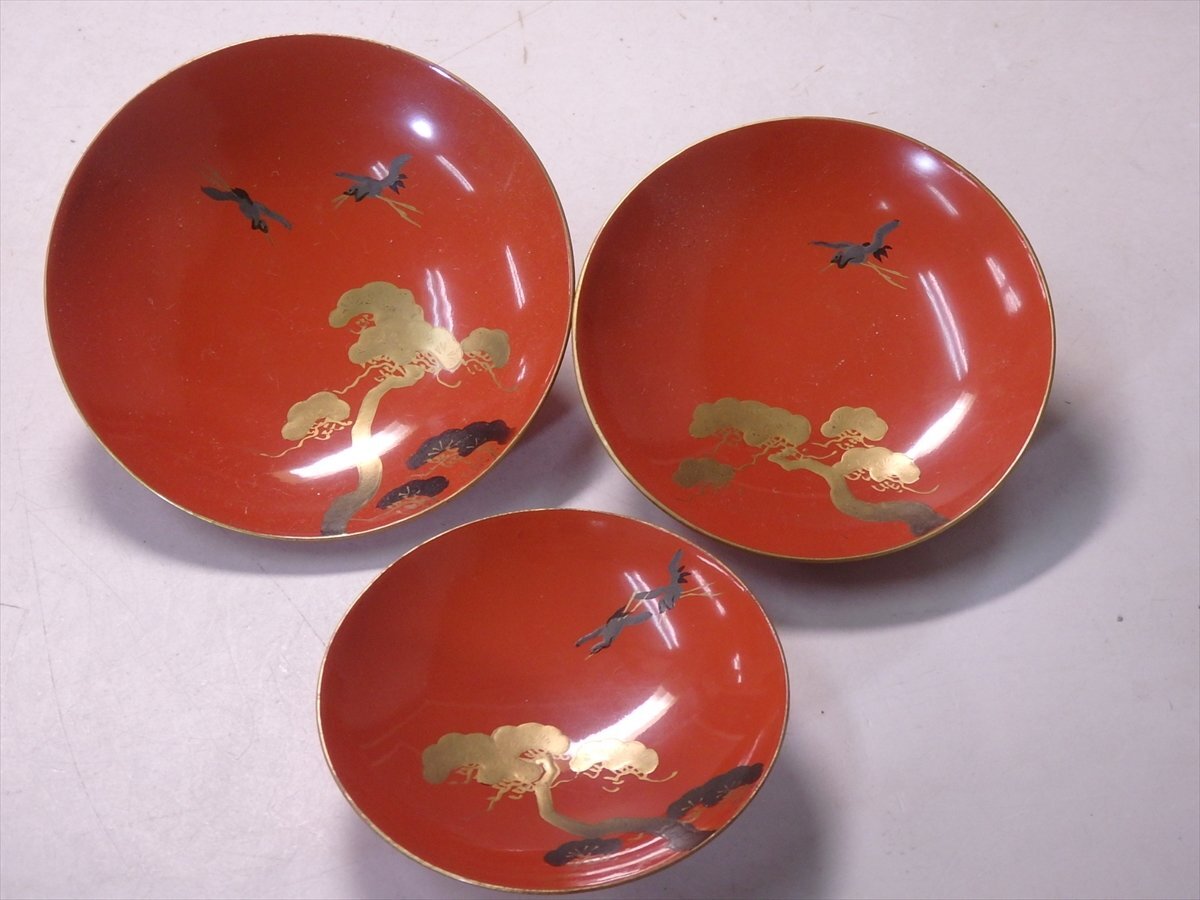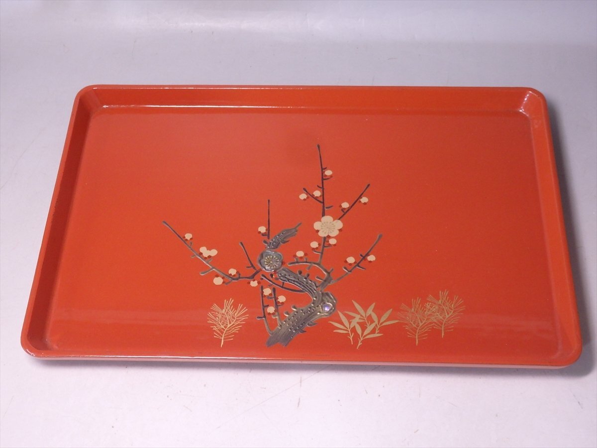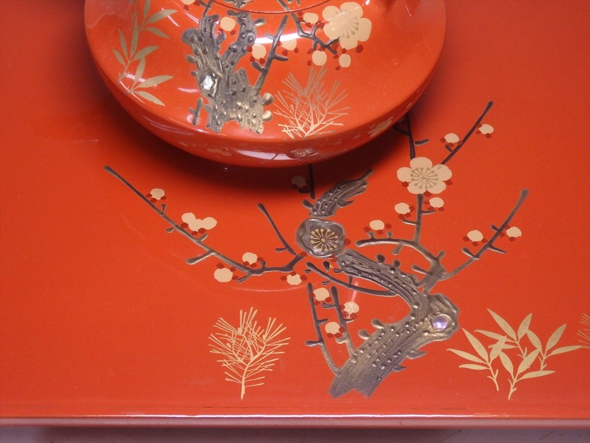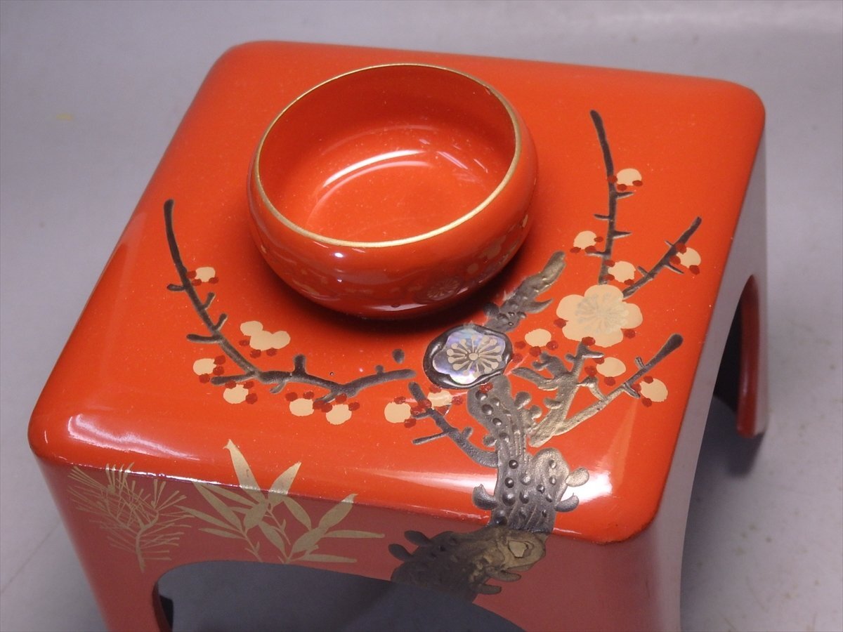 【管理番号5-1014117-10 スタッフコメント:iy】  屠蘇台のサイズ:cm  ☆松竹梅の蒔絵に、ところどころ螺鈿(貝の細工)がほどこされています。三段盃は松に鶴の絵柄。すべて木製です。レトロなお品ですが、目立つような傷みはありません。