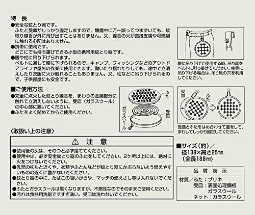 説明 製品サイズ:(約)径138×高さ25mm(全長188mm)(1個) 材質:上蓋/ブリキ、受皿/表面処理鋼板・ガラスウール、ネット/ガラスウール 原産国:日本 吊しても置いても安全! アウトドアライフに、持ち歩けて便利! ベルトに通して腰に下げたり、テントに吊したり、テーブルや椅子の下に置いたり、キャンプやフィッシング等いろいろな場所に使えて便利です。 【特徴】 安全な蚊とり器です。上蓋と受皿がしっかり固定しますので、燻煙中に万一誤ってつまずいても、蚊取り線香が外に飛び出すことはありません。又、線香の火が直接皮膚や可燃物に触れる心配はありません。 携帯に便利です。どこにでも持ち運びできる小型の携帯用蚊とり器です。 腰や柱に吊り下げられます。ベルトに通して腰に下げられるので、キャンプ、フィッシングなどのアウトドアライフや屋外の作業に使用できます。 動いたり揺れたりしても、途中で立消えしたり衣服に火が触れることもありません。又、柱などに吊り上げられるので、子供部屋にも安全です。 【ご使用方法】 完全に点火した蚊とり線香を、まわりの金属部分に触れて立消えしないように、受皿(ガラスウール)の中心部に置いてください。 ふたをよく閉めてからご使用ください。
