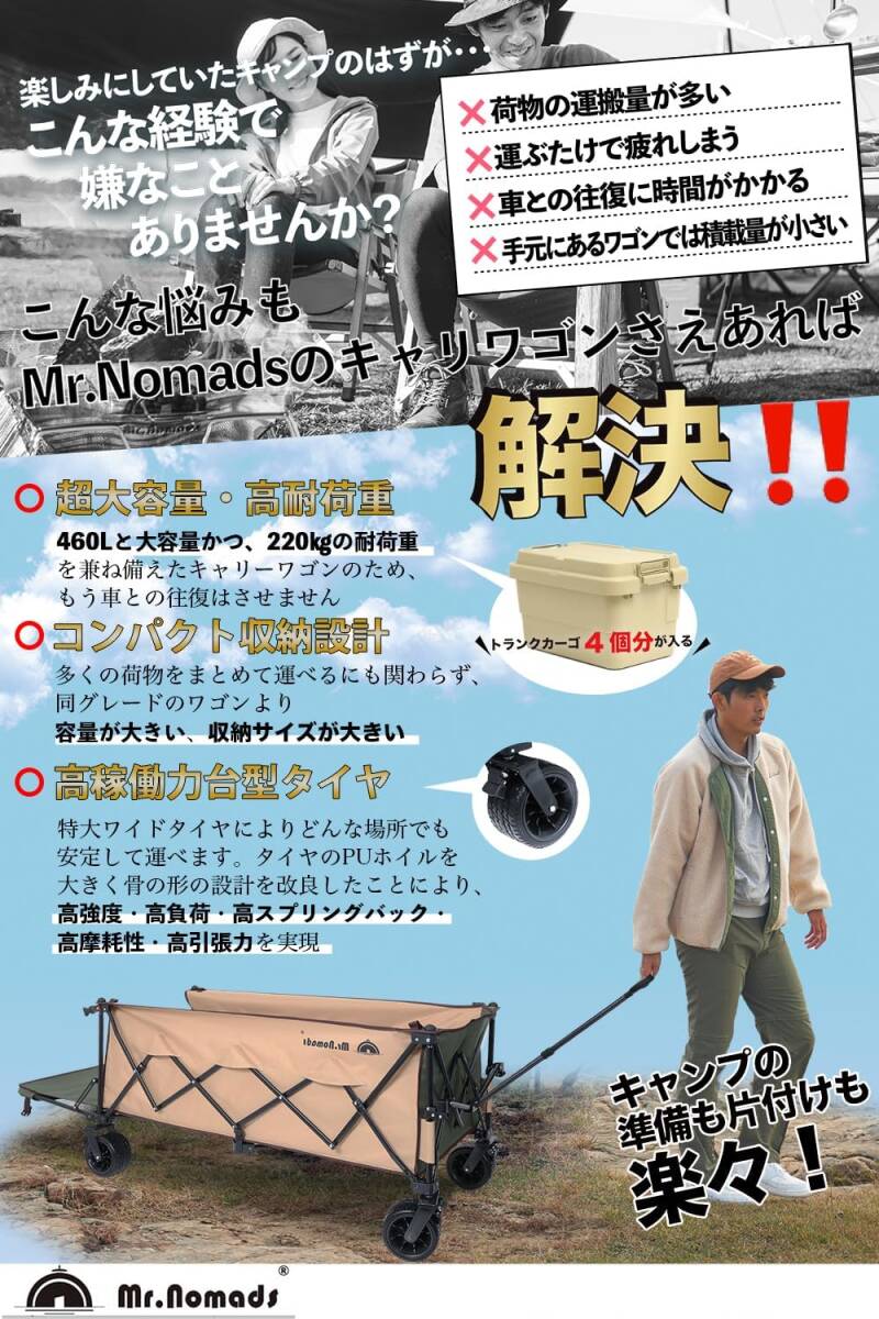 黒、赤色 リア有り MR. NOMADS 460L ラグビー日本代表採用メーカー キャリーワゴン 耐荷重220kg 大型タイヤ 自立収納