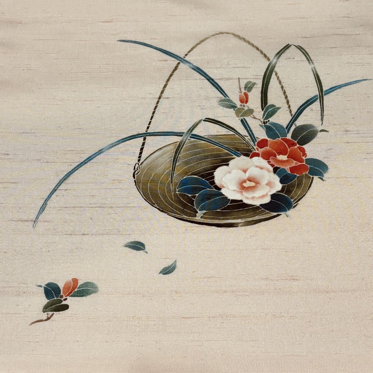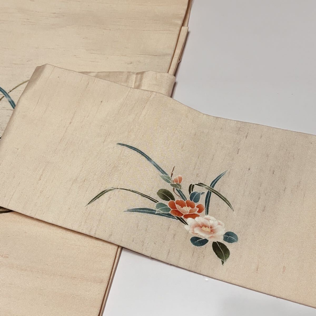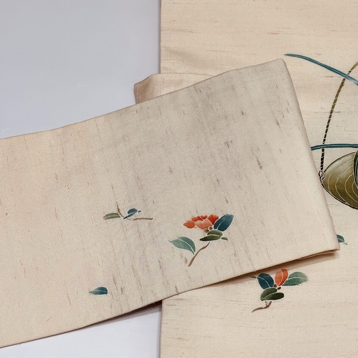手描友禅による繊細で美しい花柄が魅力のデザイン。極上のクオリティを誇る牛首紬の名古屋帯です。