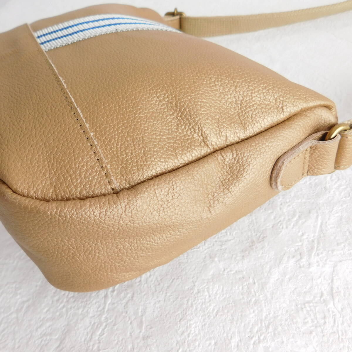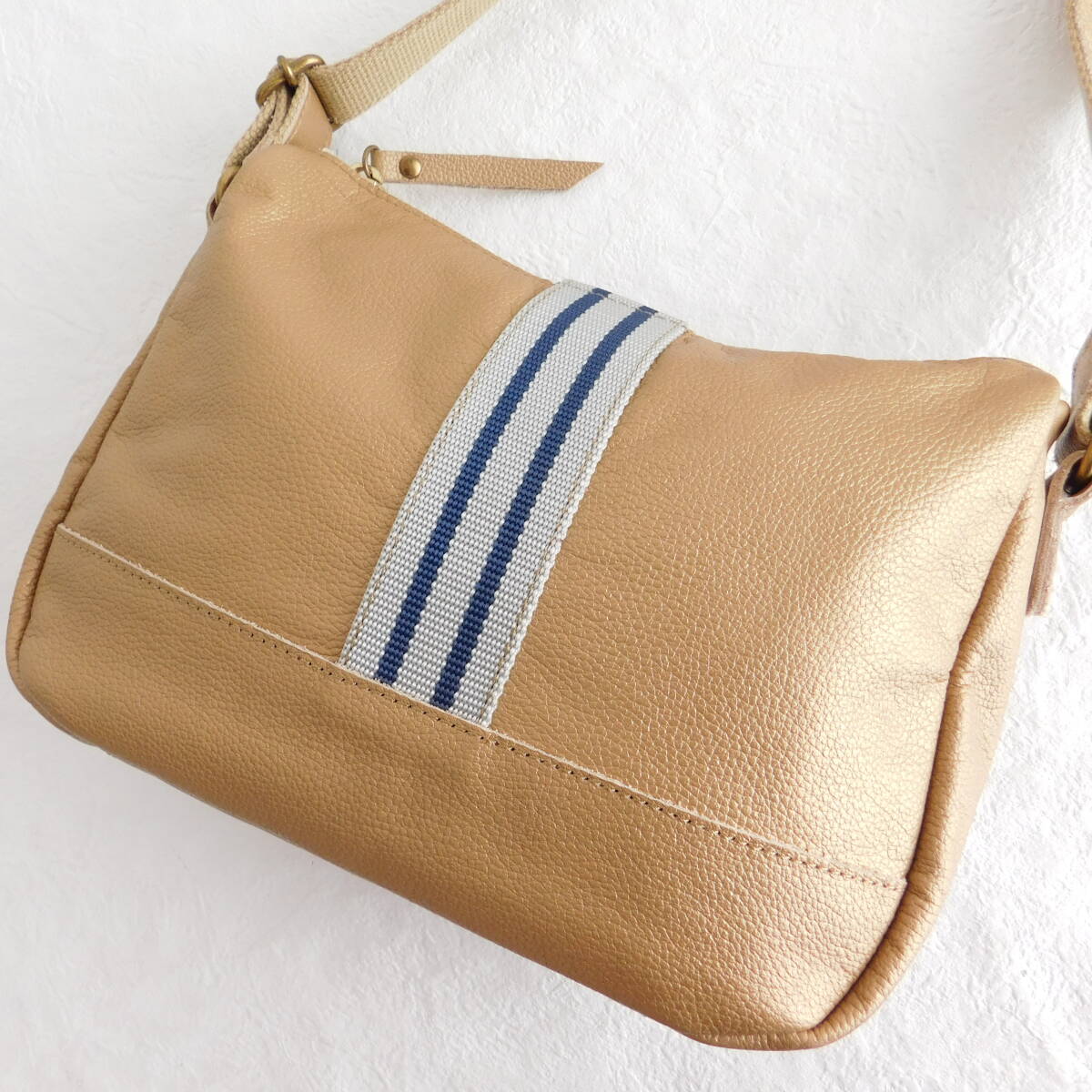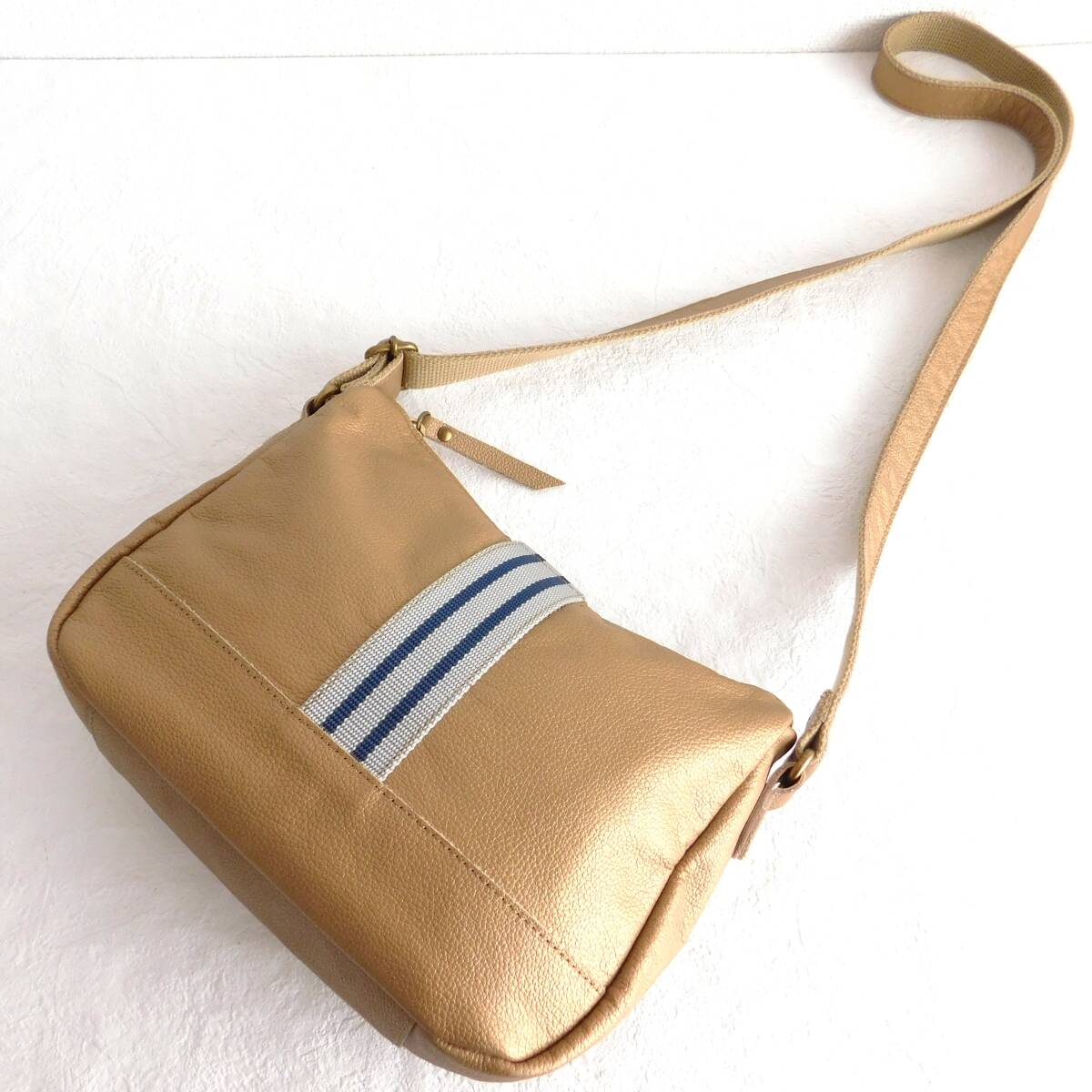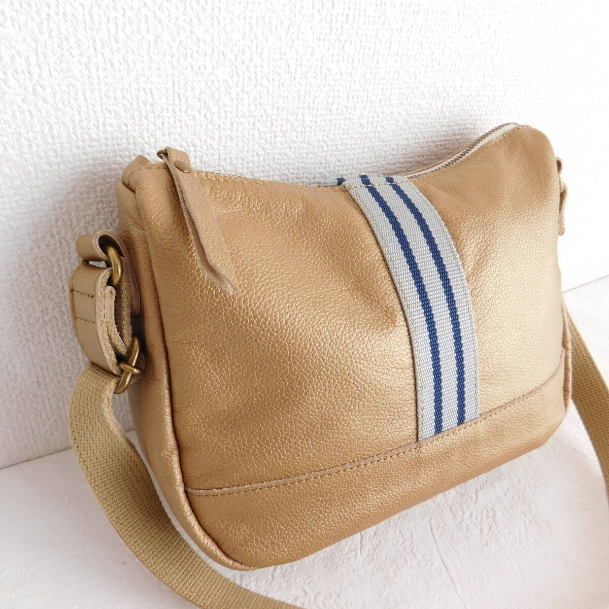メタリックなゴールドベージュのショルダーバッグが素敵です。