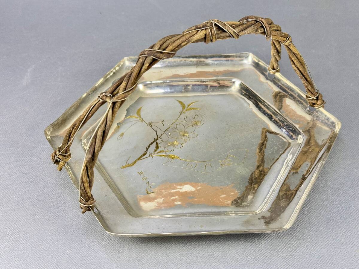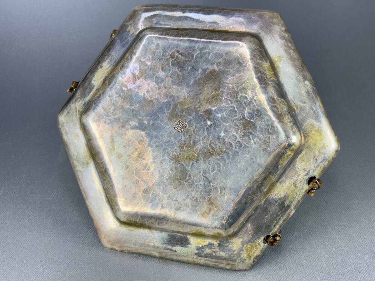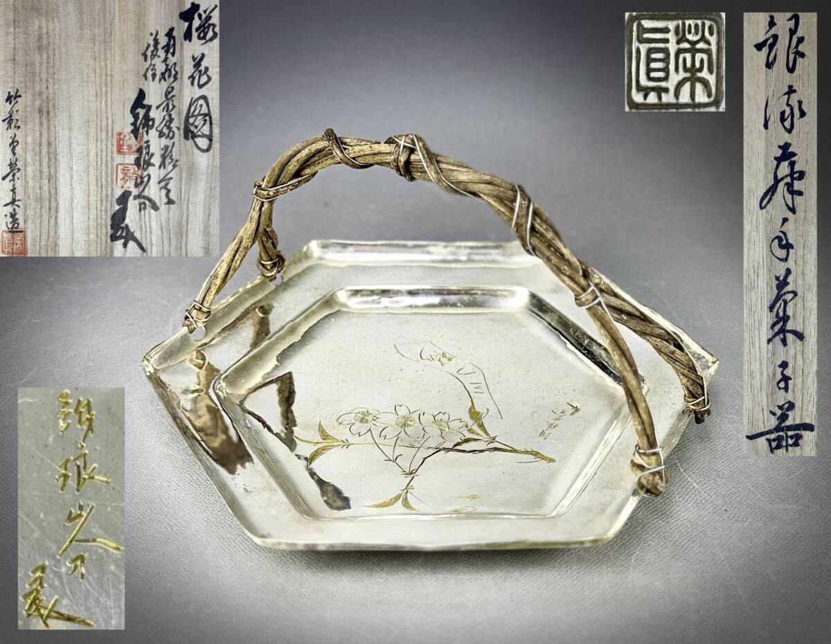 【偲】竹影堂栄真 造 純銀 鎚目 三つ桜 桜花図 手つき 菓子鉢 刻印有 煎茶盆 菓子盆 銀製 シルバー j-29