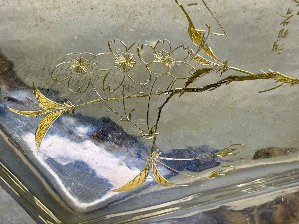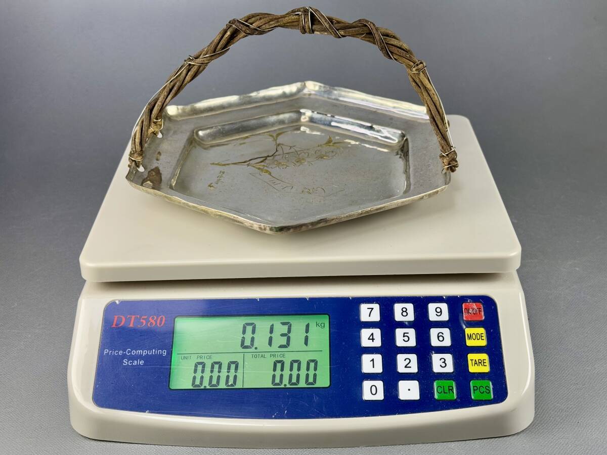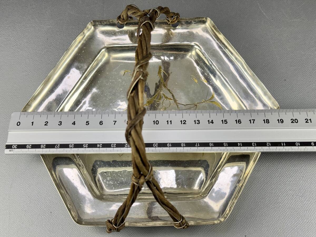 【偲】竹影堂栄真 造 純銀 鎚目 三つ桜 桜花図 手つき 菓子鉢 刻印有 煎茶盆 菓子盆 銀製 シルバー j-29