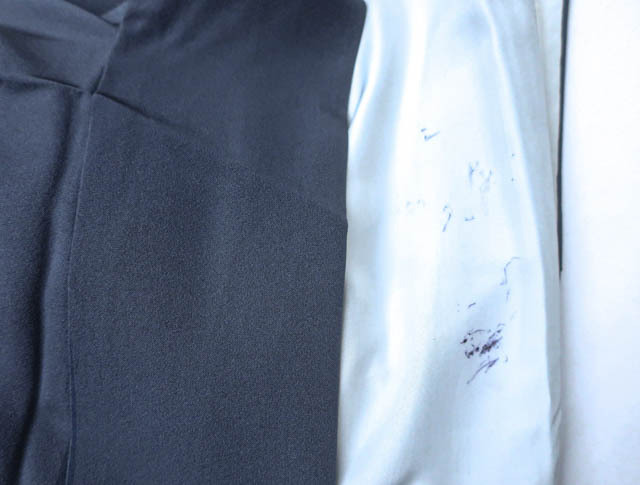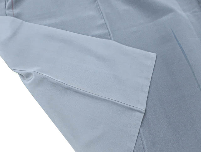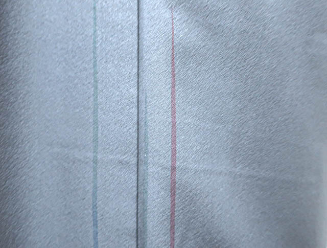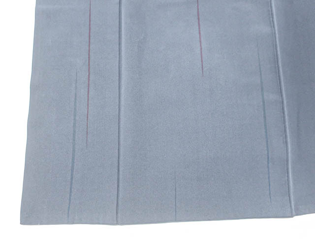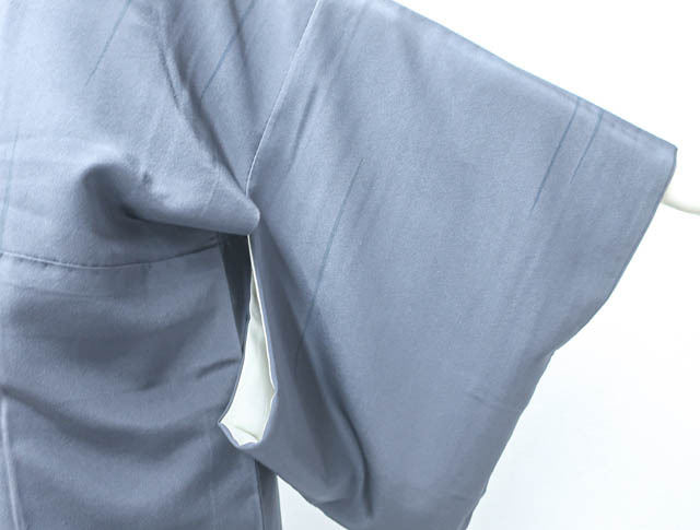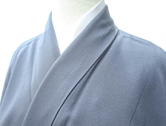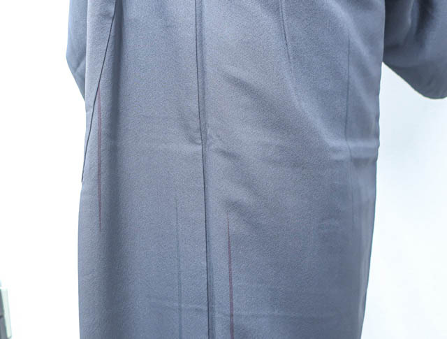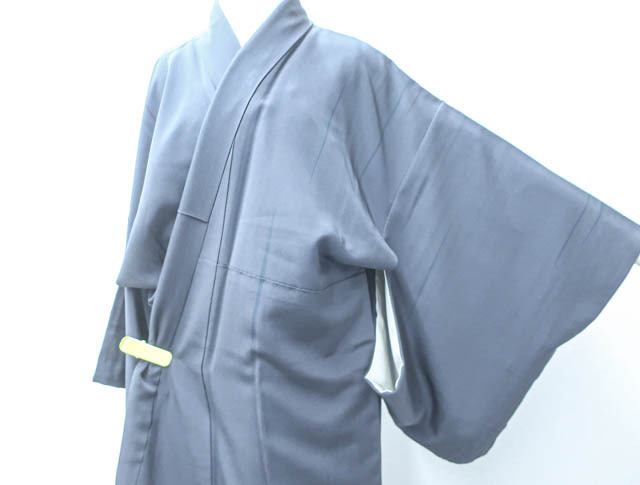 リサイクル商品のため衿折れ山に薄汚れ、裏地にインク汚れがございますがご着用いただけると存じます。 地色は灰紺です。 1枚目の画像が近いお色かと思われます。 素材は正絹です。 |