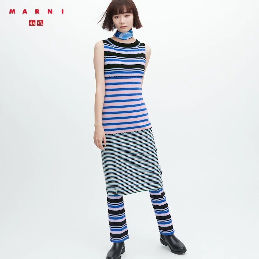 ユニクロと高級ブランドマルニのコラボ「メリノブレンドボーダーニットワンピース」です。4,990円のお品です。