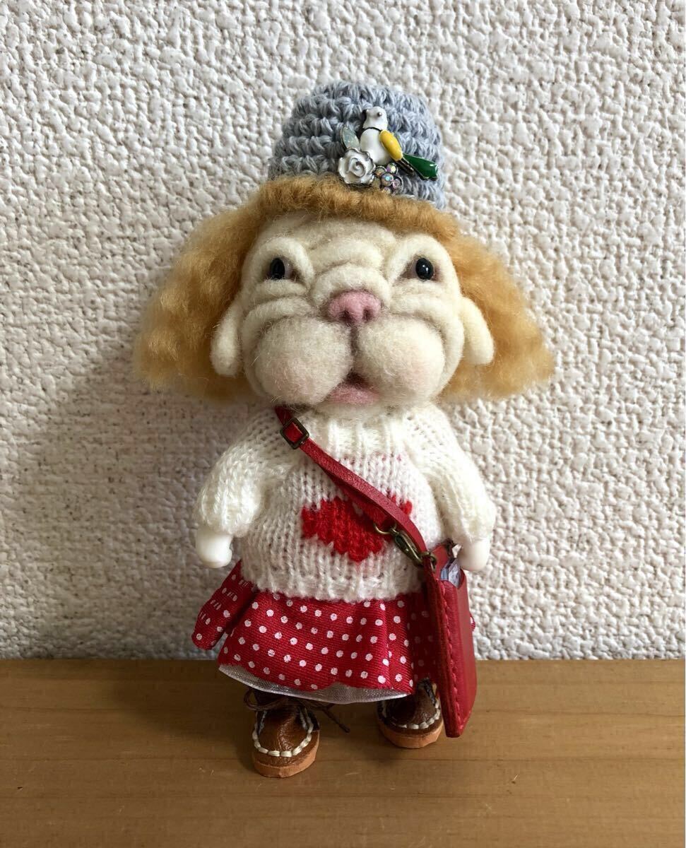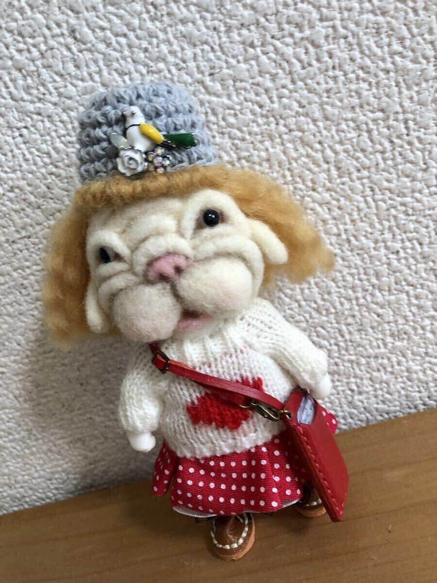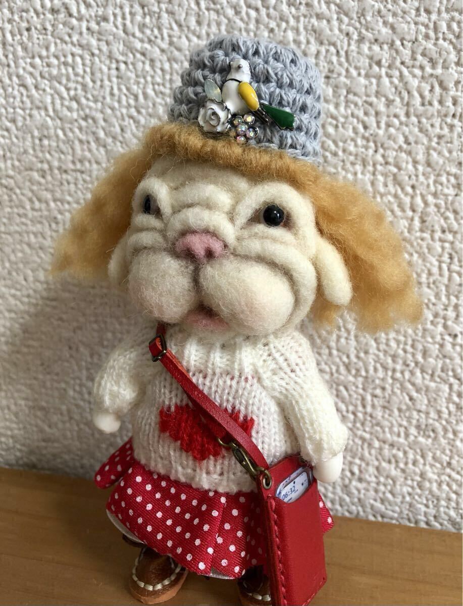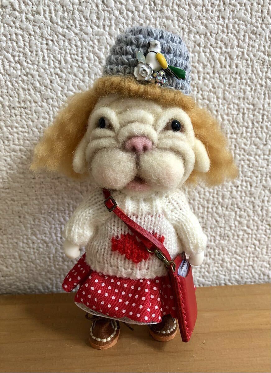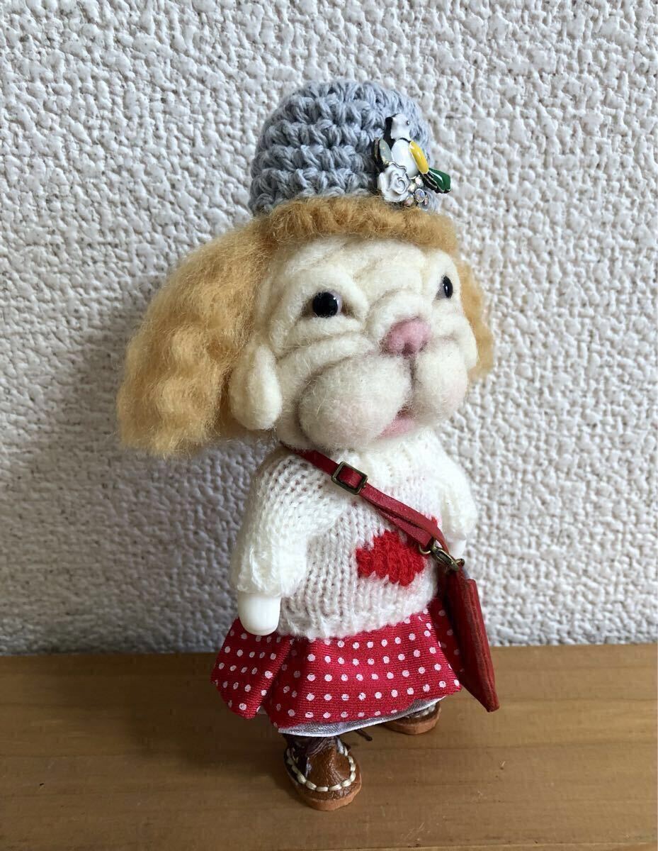 頭と体は羊毛フェルト、手足は樹脂粘土製のブルドックのお人形です。