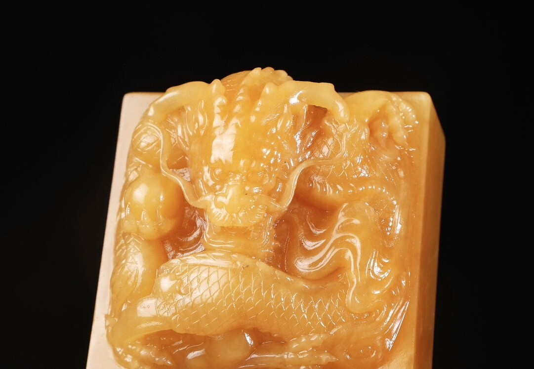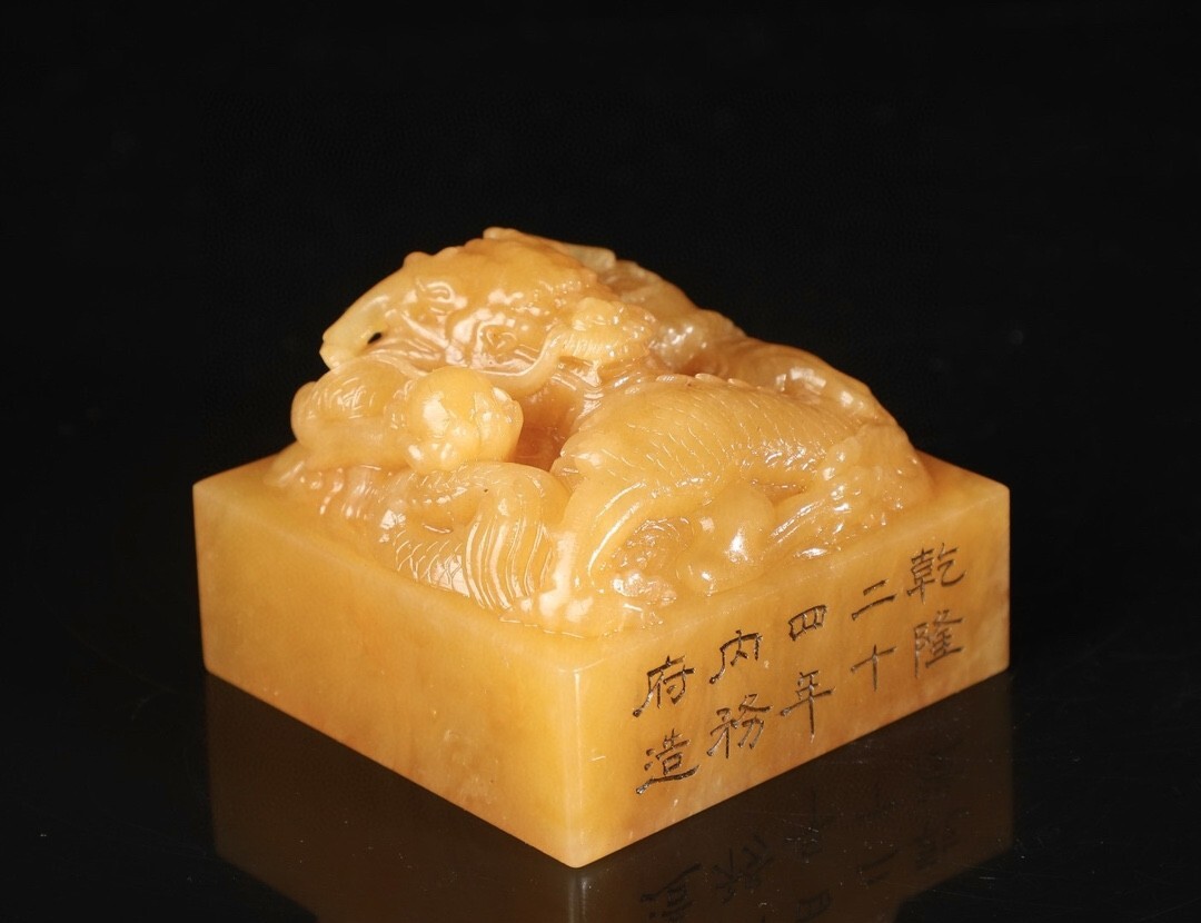 「清 乾隆二十四年内務府造 老寿山石 田黄石彫り 盤龍印章 印鑑」極細工 擺件 古賞物 中国古美術 旧蔵出