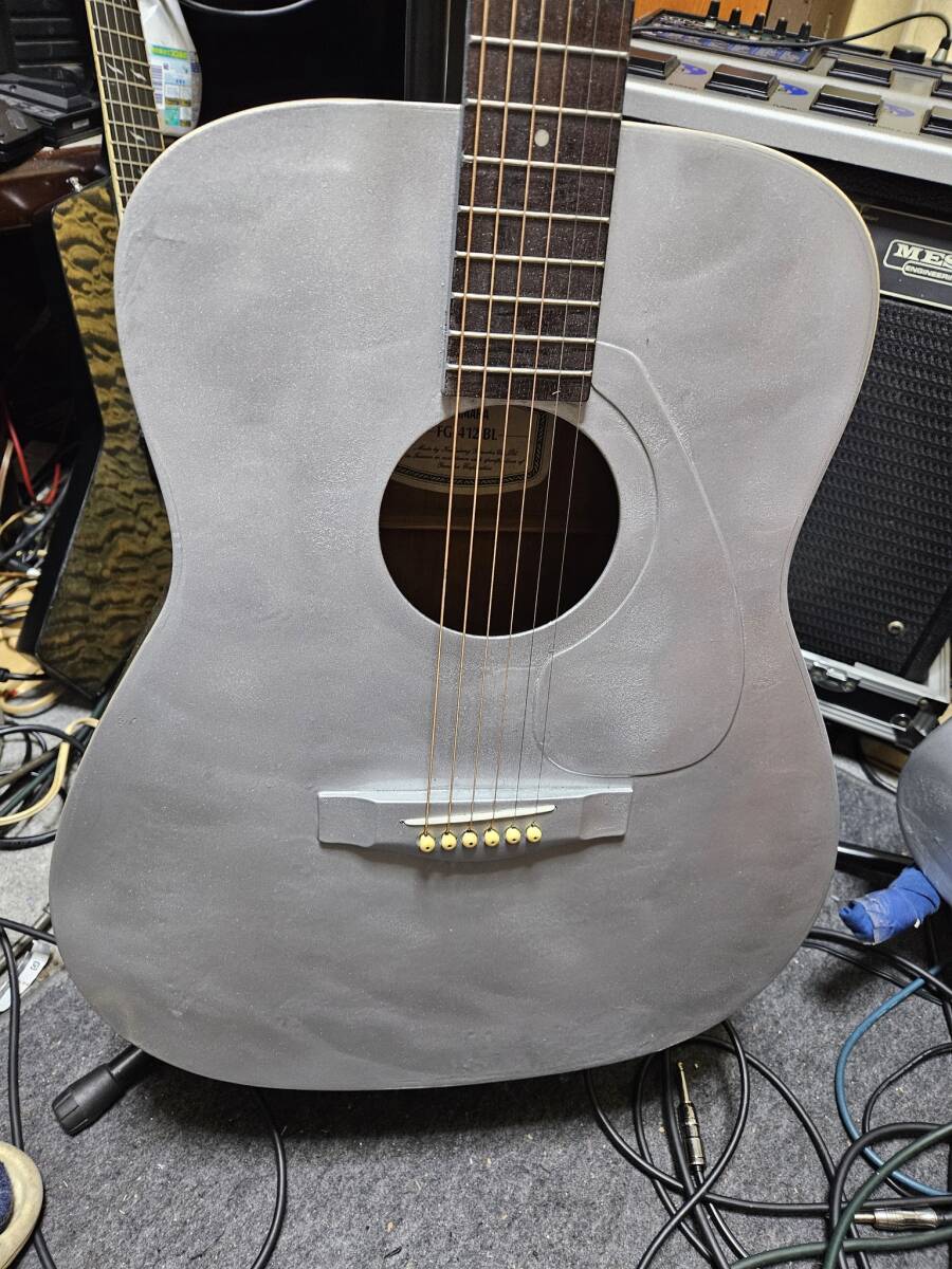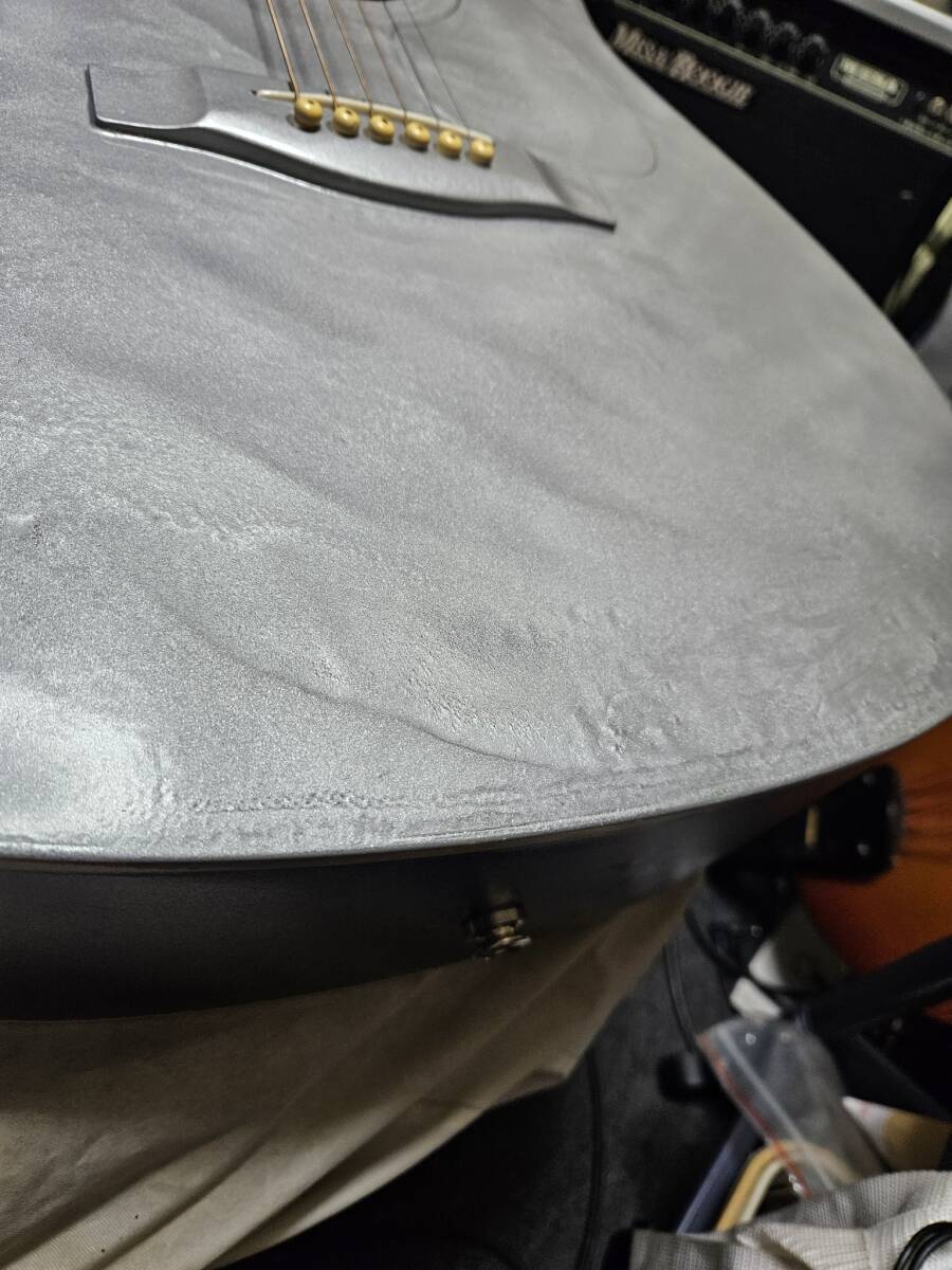 塗装割れのギターをやすりで剥がし、雑なシルバーメタリック塗装 サイドやバックに飛んでいます。トップにクリアラッカーを塗布しました。