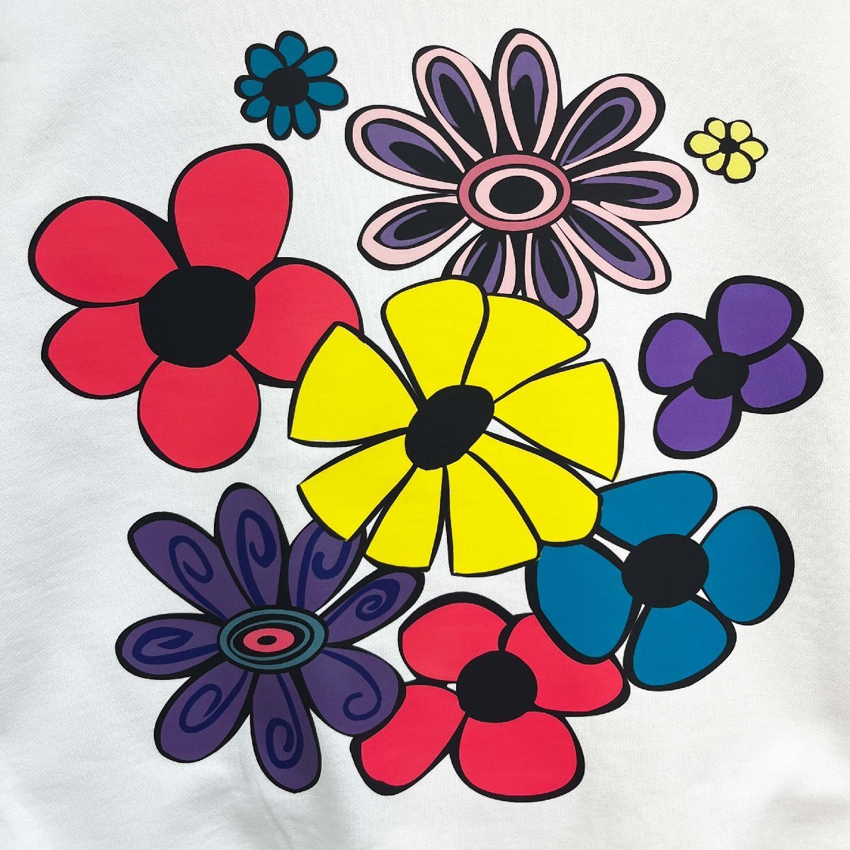 フロントの胸元には、小さな花柄プリントがさりげなくアクセントを添え、控えめながらも可憐な印象に。そして、背中には大胆に広がるカラフルなフラワープリントが!大小さまざまな花々が描くデザインは、遊び心とアート感にあふれ、後ろ姿までしっかりと魅せてくれます。