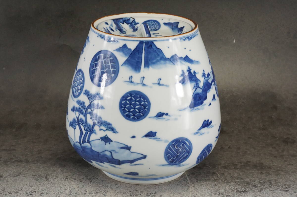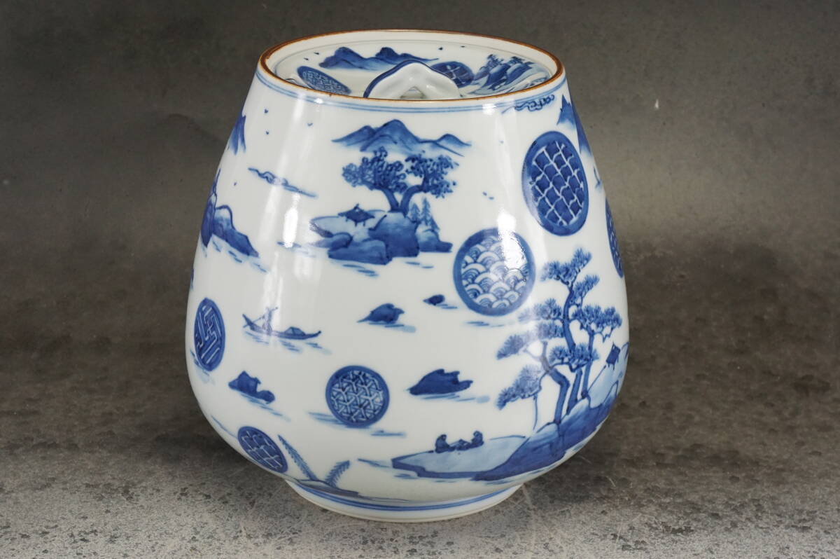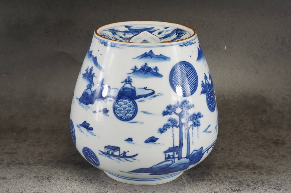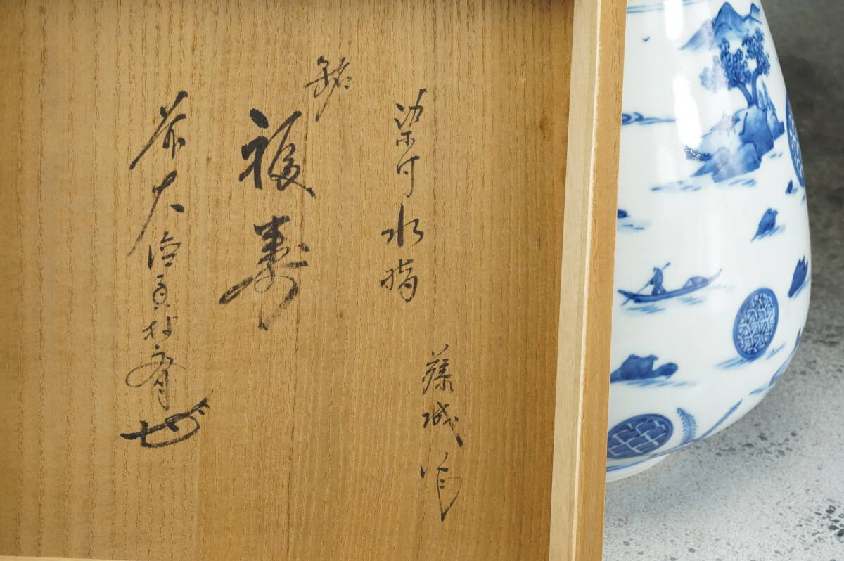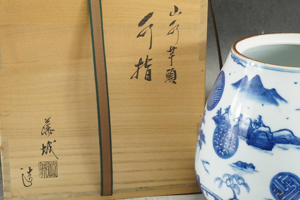 染付山水芋頭水差 藤城作 銘 福寿 前大徳寺〇斎 箱書 共箱 18.5cmx18.5cm/骨董 水差 水器 水注 茶釜 茶碗 皆具 織部 古瀬戸 千家