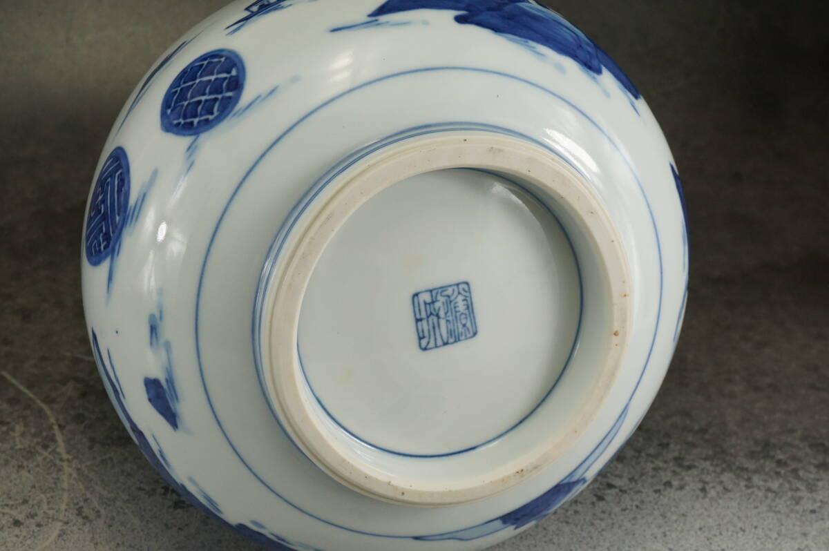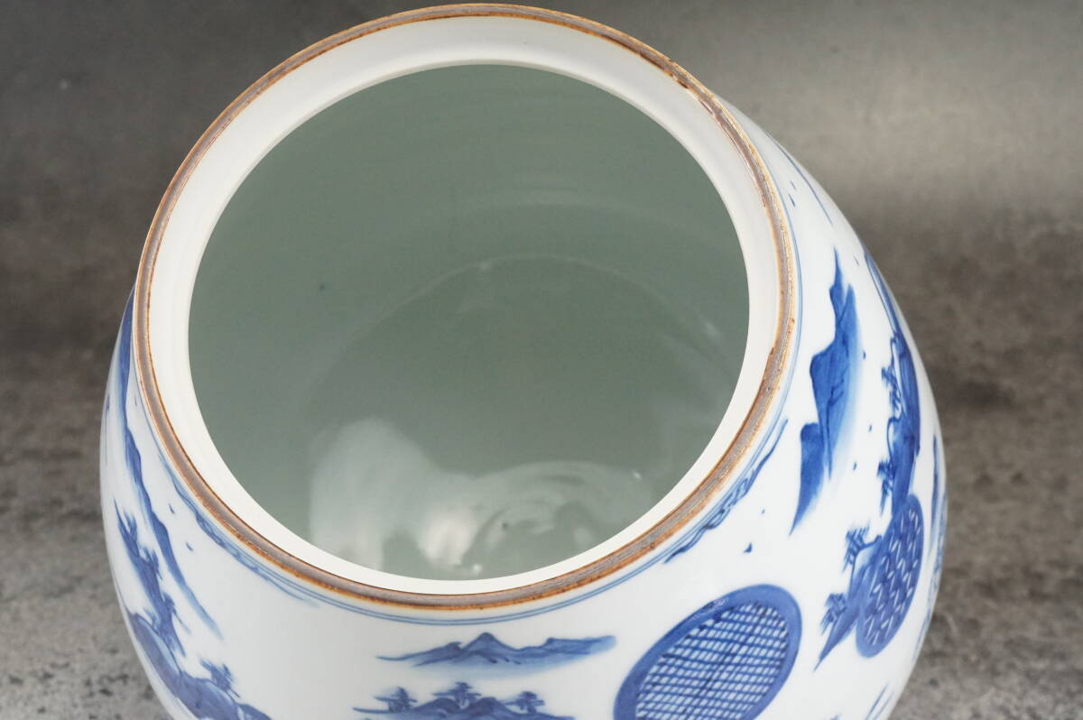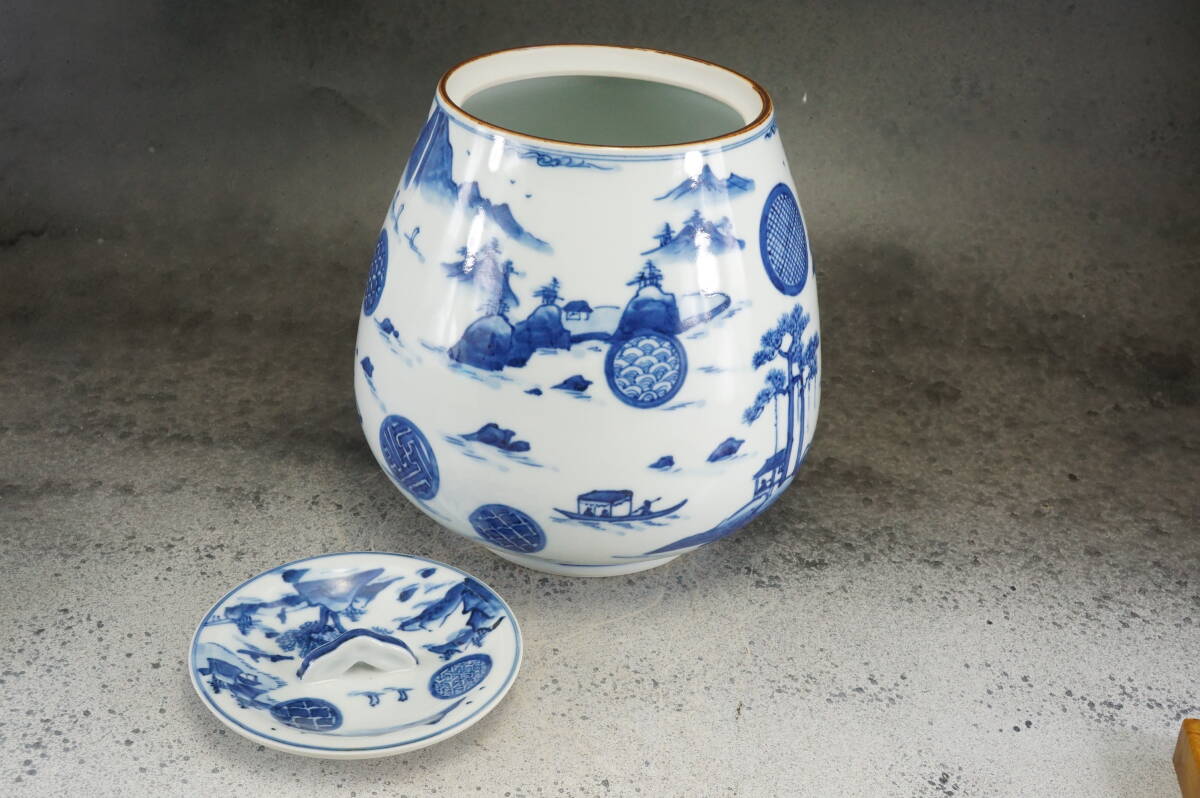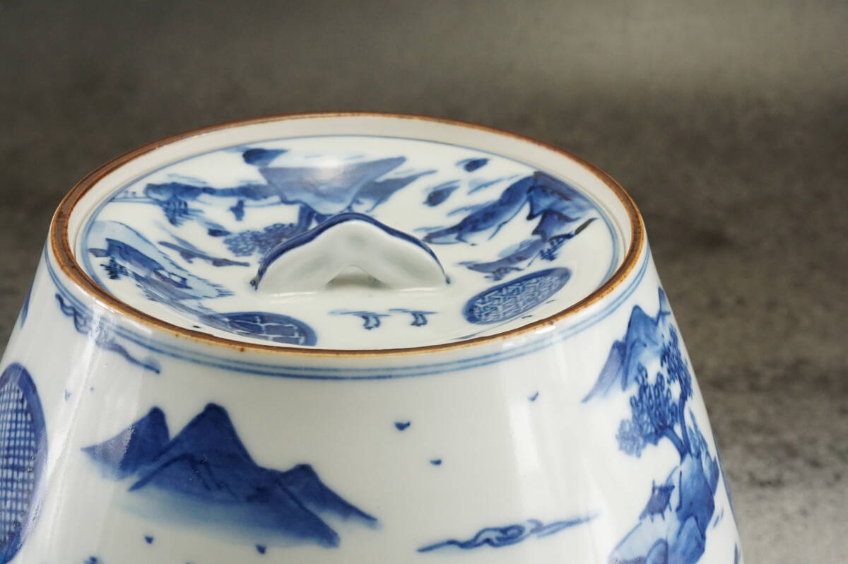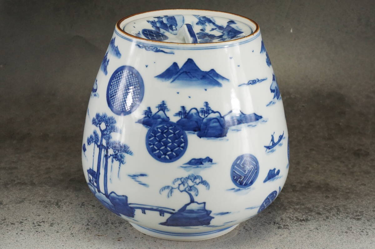 染付山水芋頭水差 藤城作 銘 福寿 前大徳寺〇斎 箱書 共箱 18.5cmx18.5cm/骨董 水差 水器 水注 茶釜 茶碗 皆具 織部 古瀬戸 千家