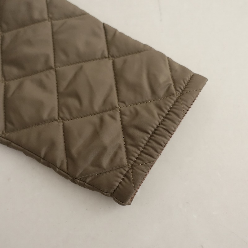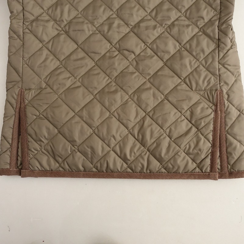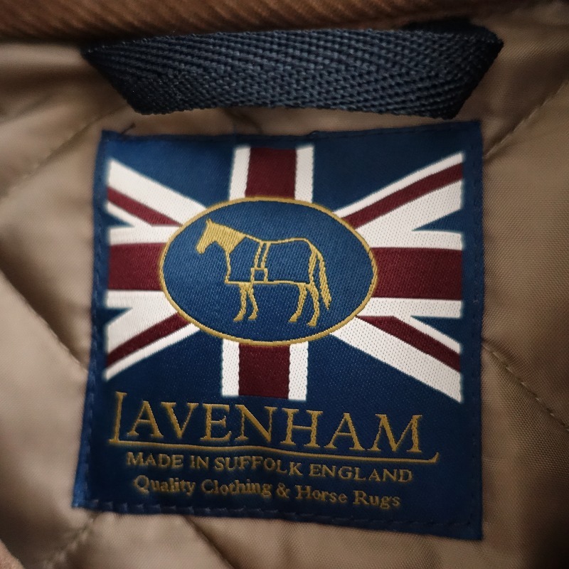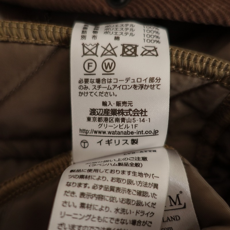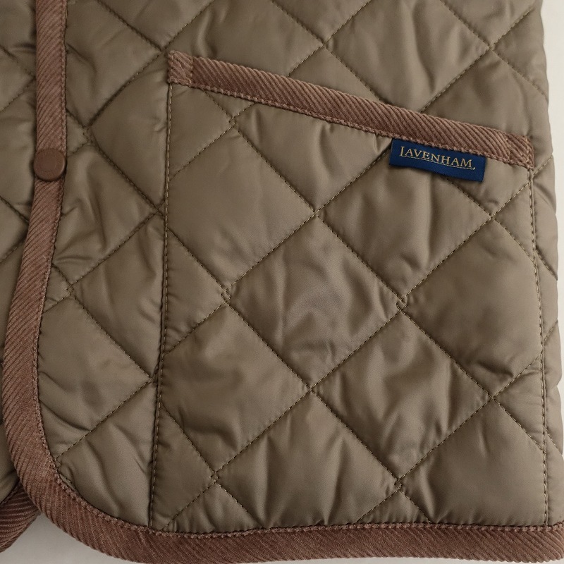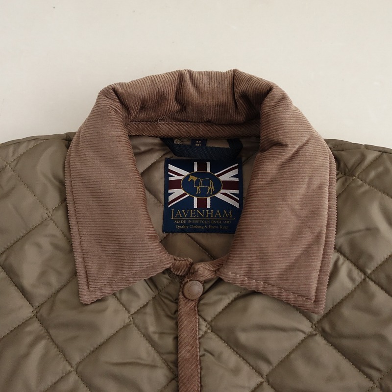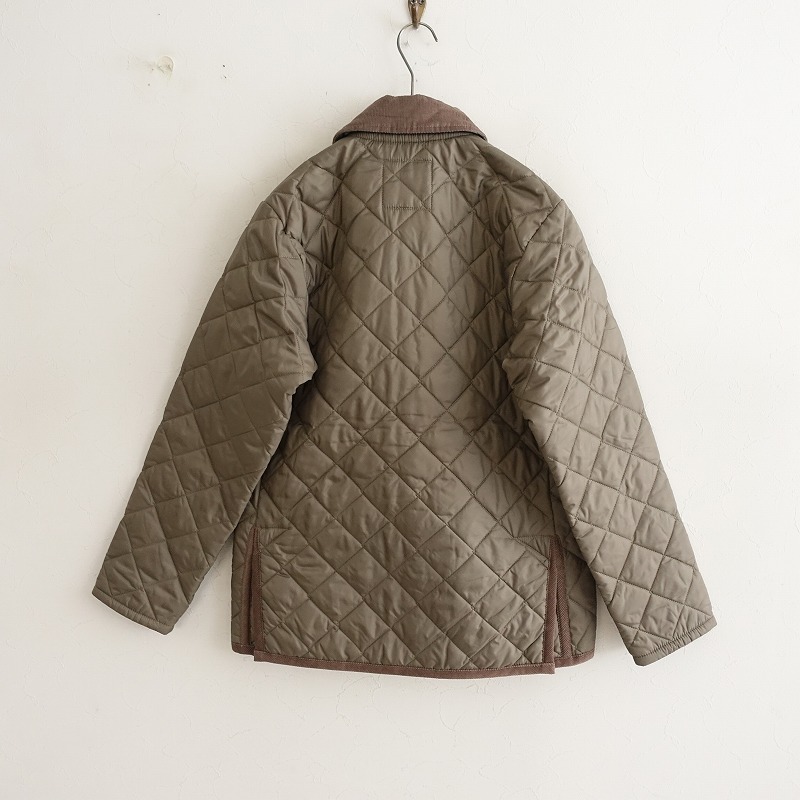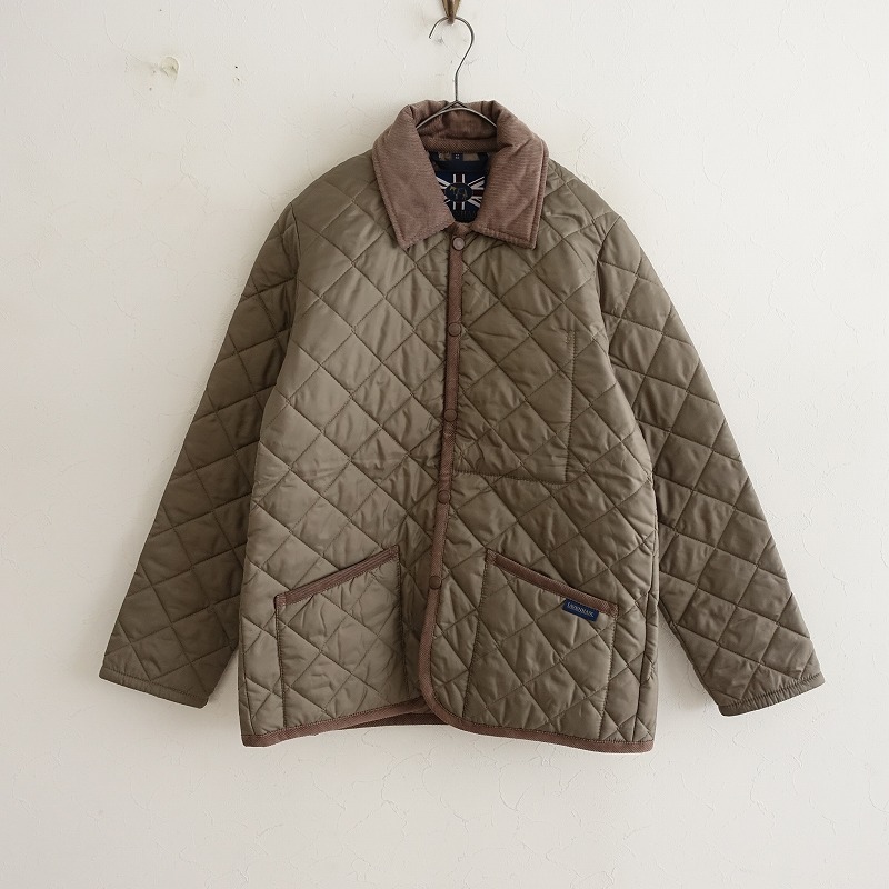 | LAVENHAMのレイドン キルティングジャケットです。カラーは薄いこげ茶色(表記:コルク)で、キルティング地で仕立てられており、襟やパイピングはコーデュロイ地に切り替えられております。フロントはスナップボタン仕様で、左胸に内ポケット、両腰にポケット付き、バックベンツ入りです。定価(メーカー希望小売価格)55,000円 税込みの商品です。 |