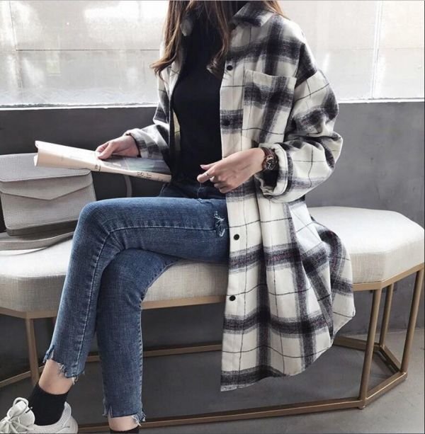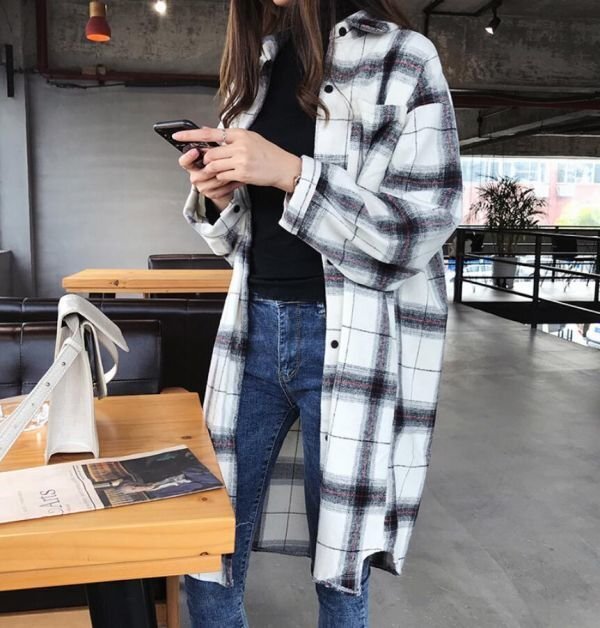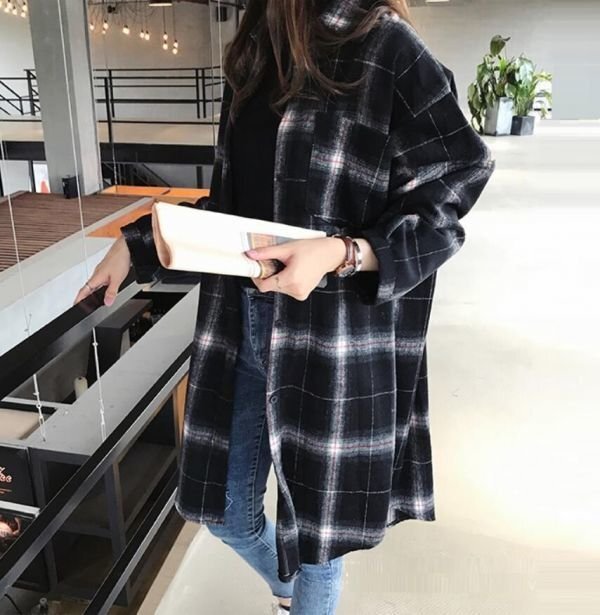 秋新品 カジュアル★ナチュラル★チェック柄★長袖★ブラウスシャツ★ ゆったり★普段着 ★チュニック ★ 白/Mサイズ
