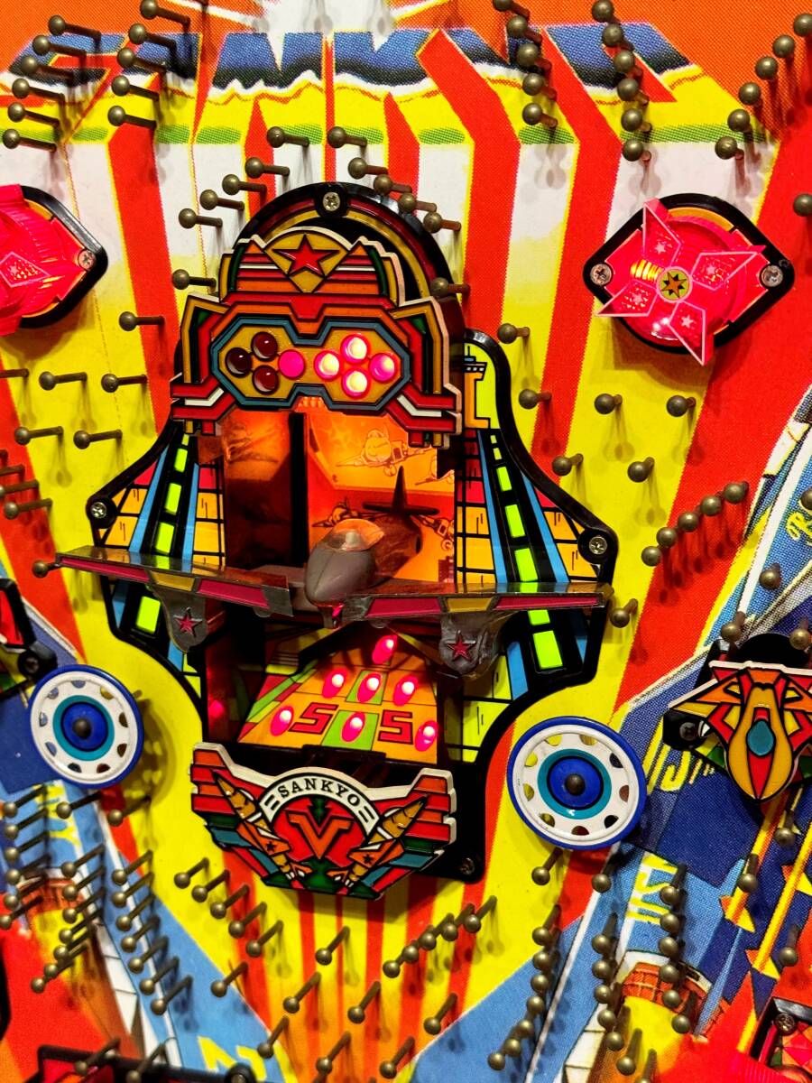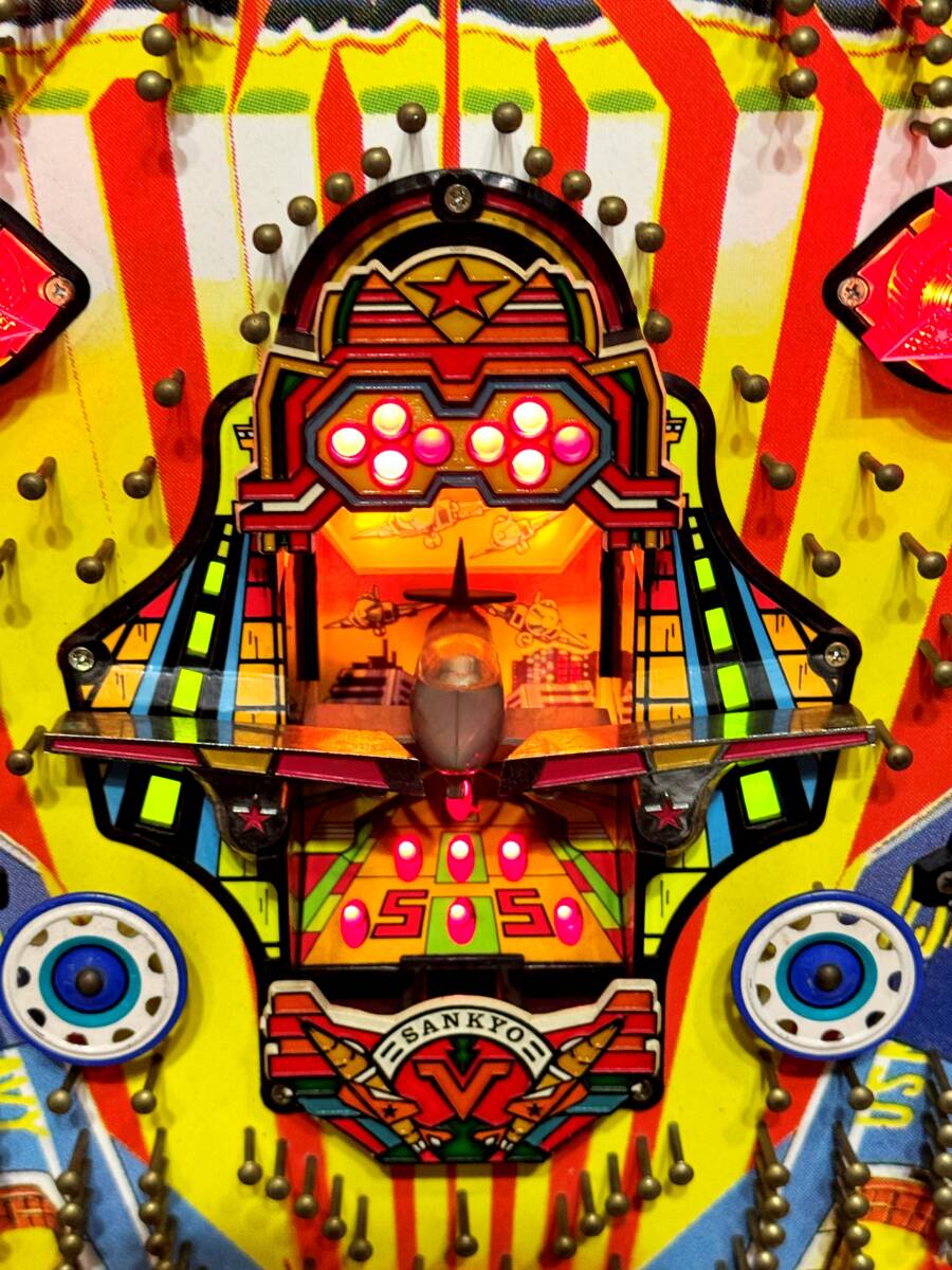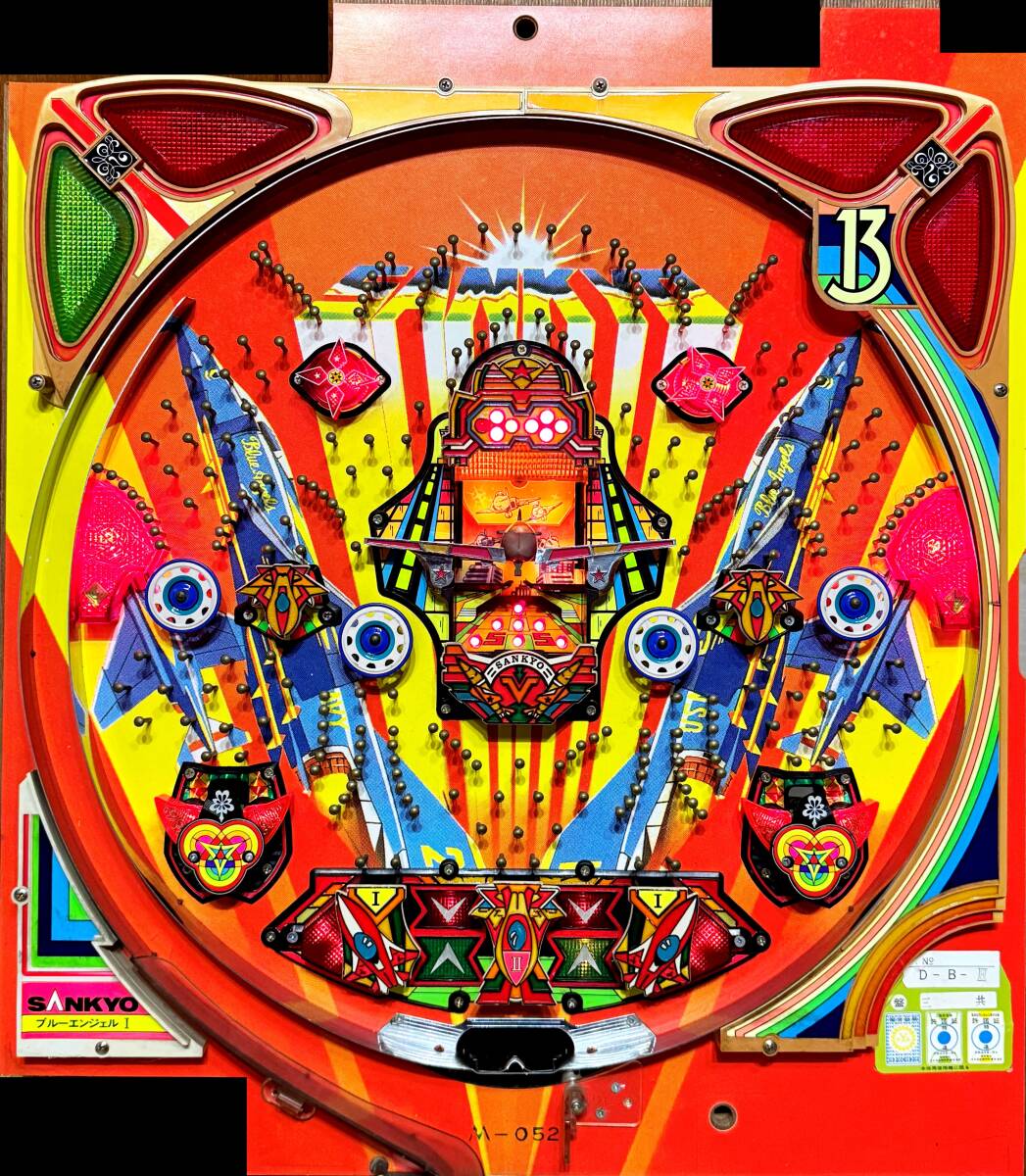 1986年7月に登場した三共の羽根物「ブルーエンジェルⅠ」です。メラ(盤面)と基盤の出品です。戦闘機がモチーフの定番ヒコーキタイプの羽根物です。レトロな物ですが、状態はいいほうだと個人的には思います。